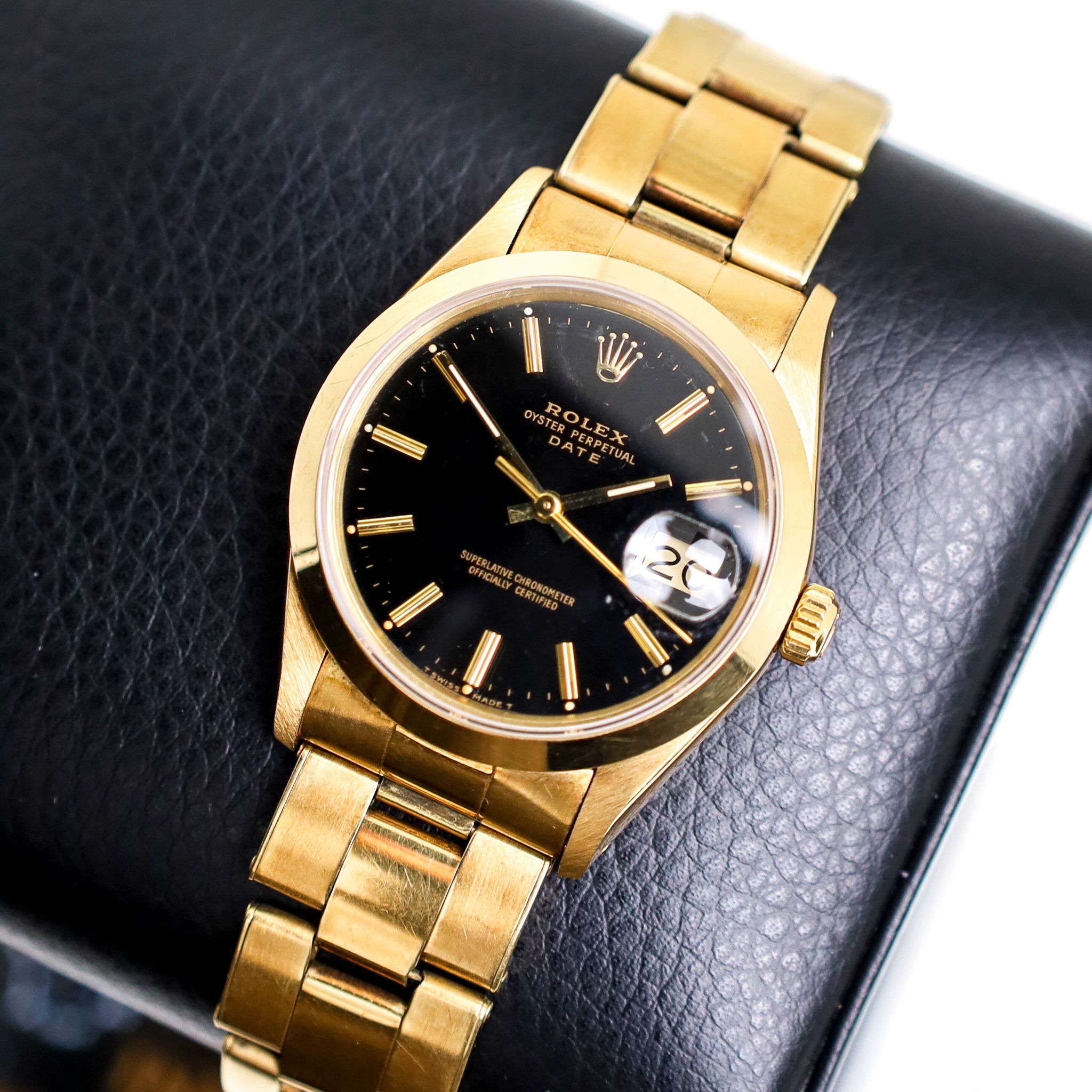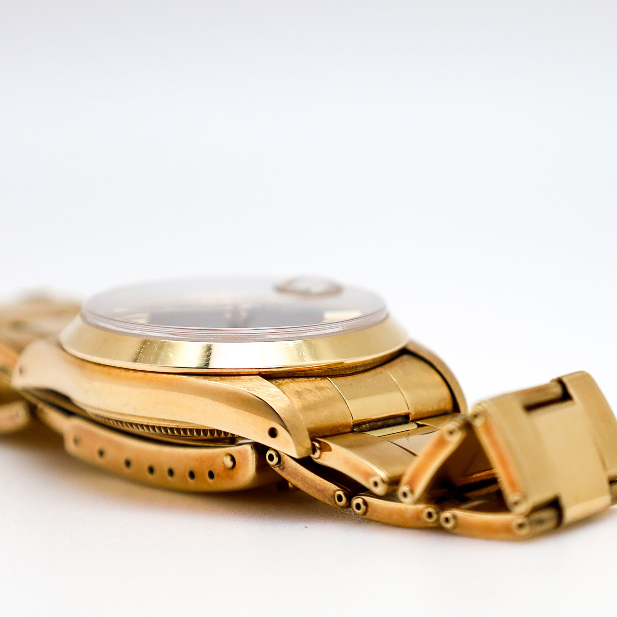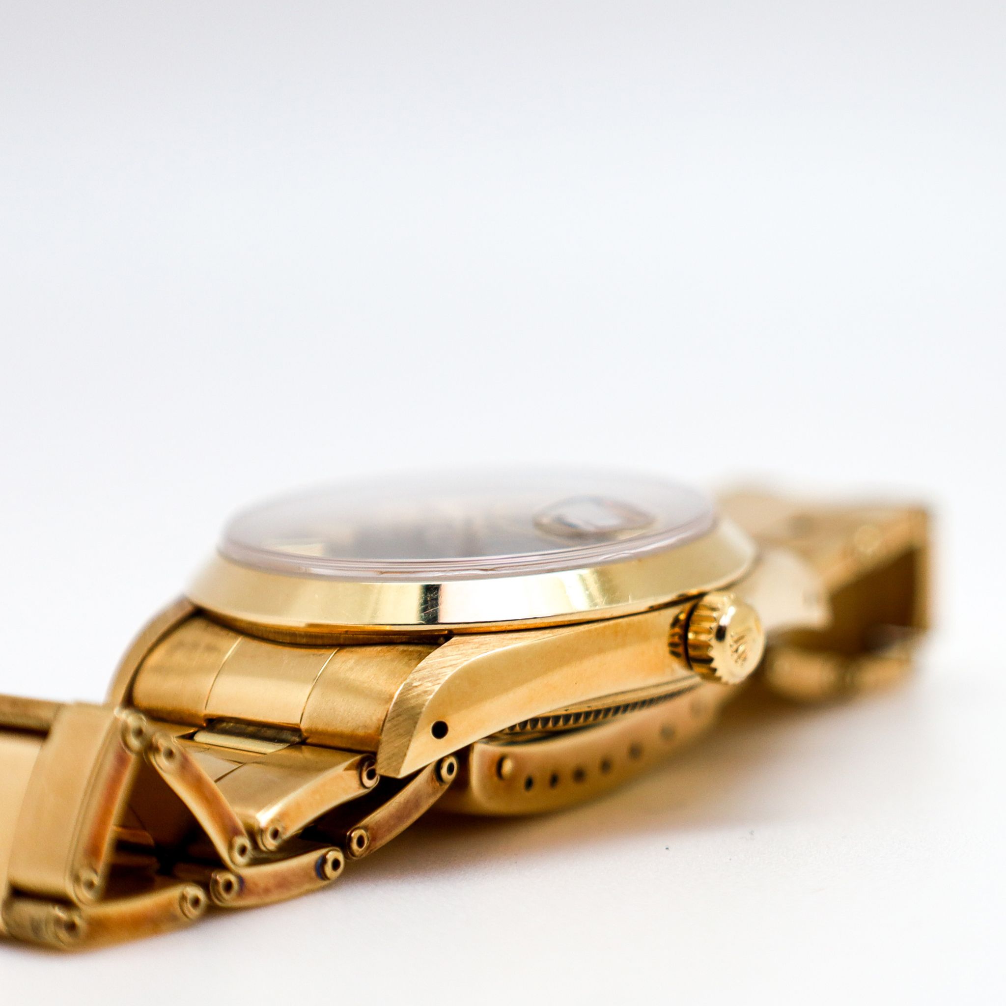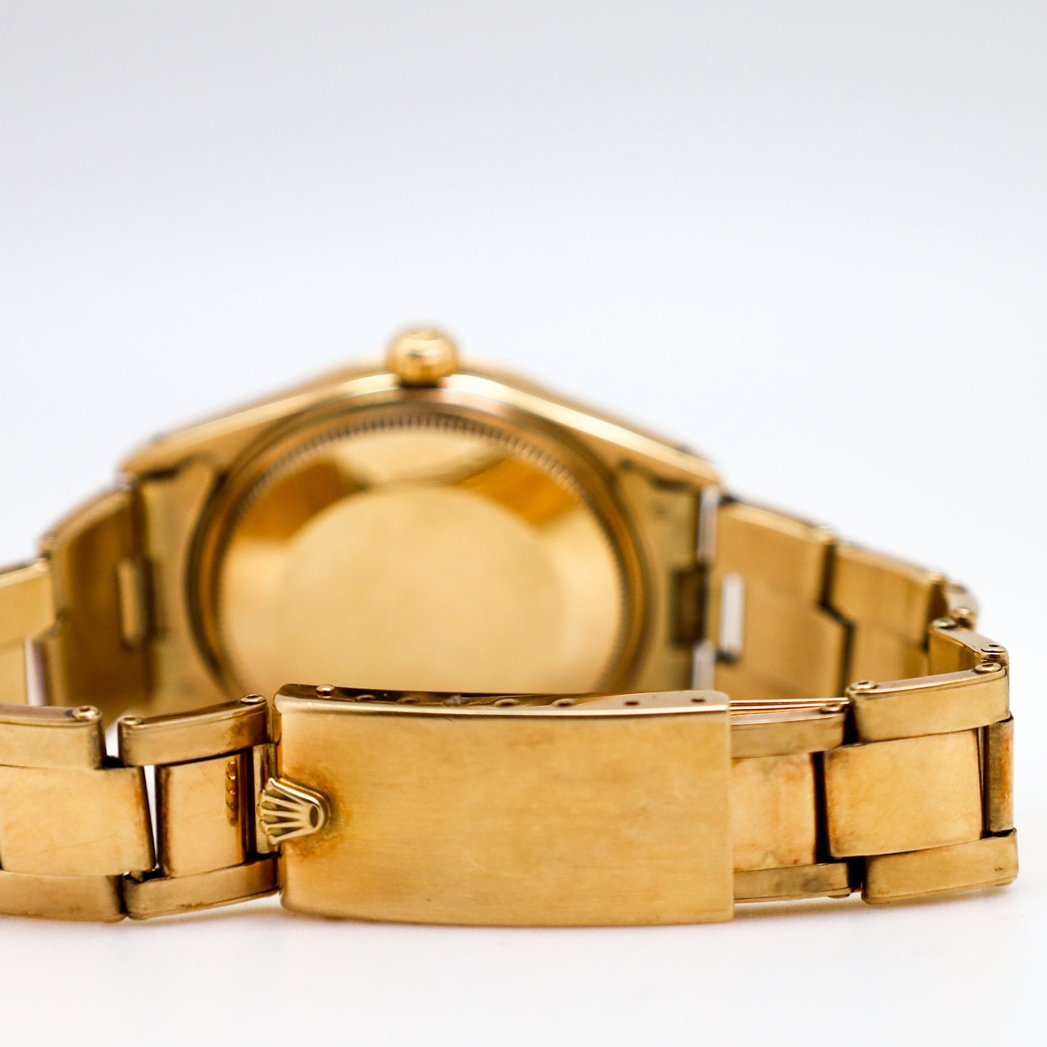 This listing is for a Rolex reference 15007. The case and bracelet are all original 14 karat yellow gold. The gold has a great rose hue from natural aging. This example is in wonderful, preowned vintage condition. The case and watch appear unpolished to our eyes. The case is thick and retains a lot of the original finishing from the factory. The dial is a beautiful black dial which contrasts nicely to the yellow gold case and bracelet. The watch is functioning and running well. This example comes as watch only (no box or papers). The bracelet has 13 total links . The end links are stamped “57”. The clasp code is stamped 7205 / 585. 6,68x serial (1981).