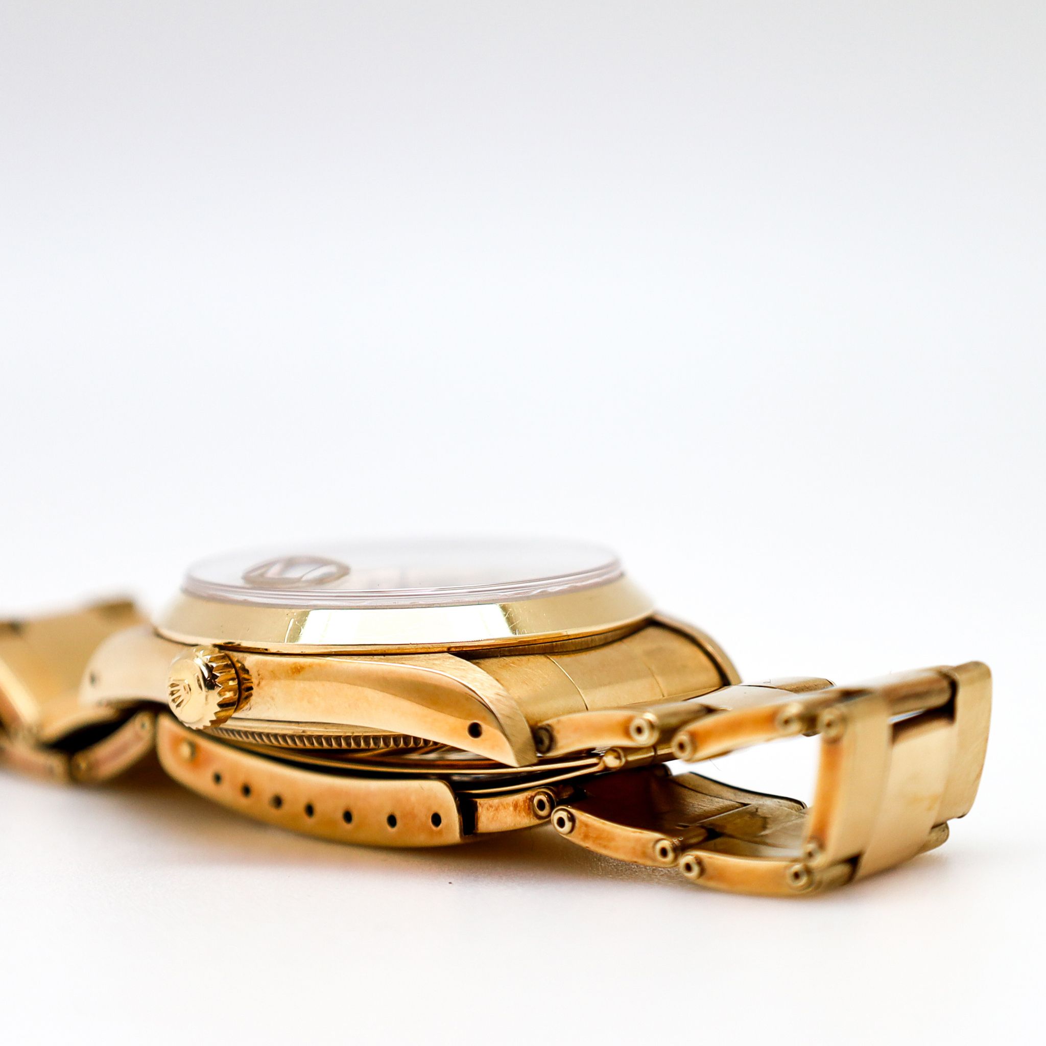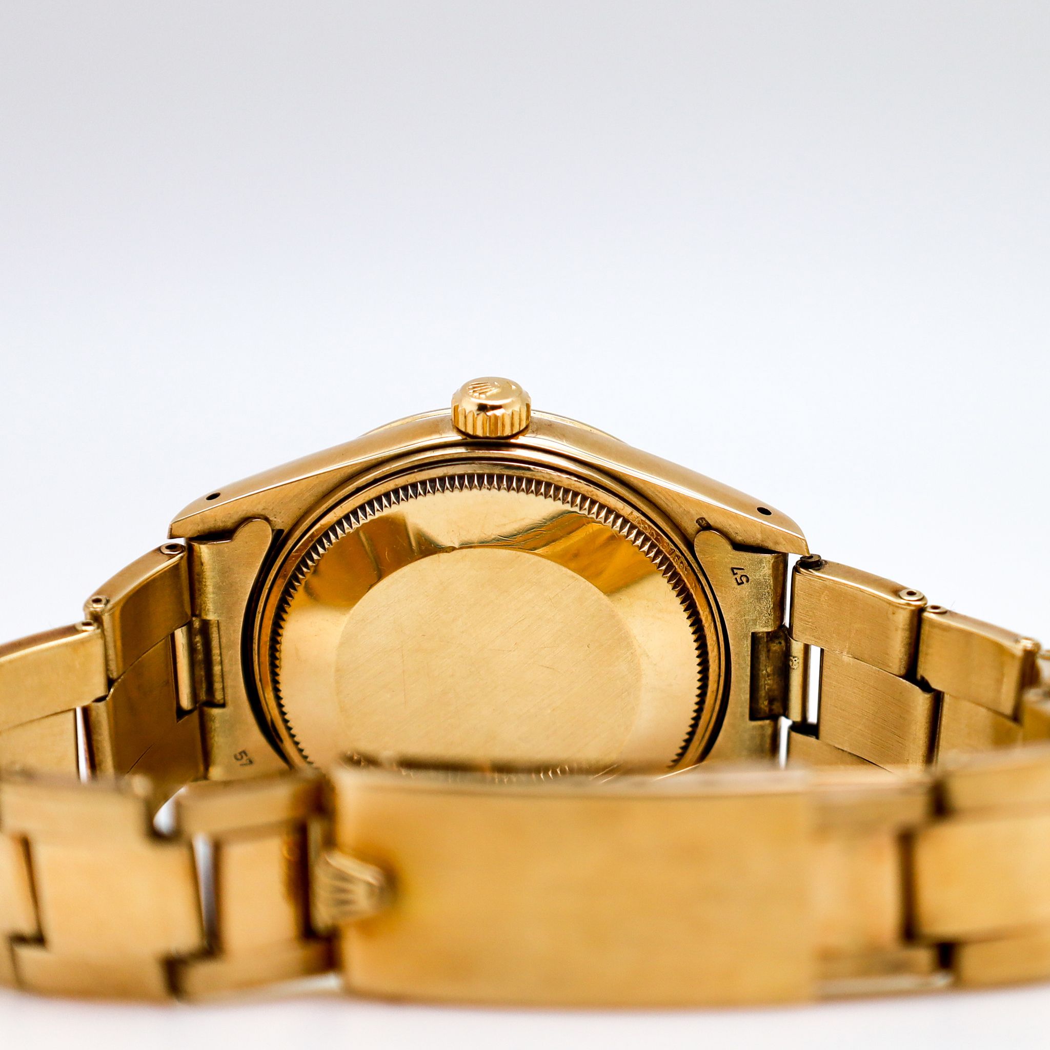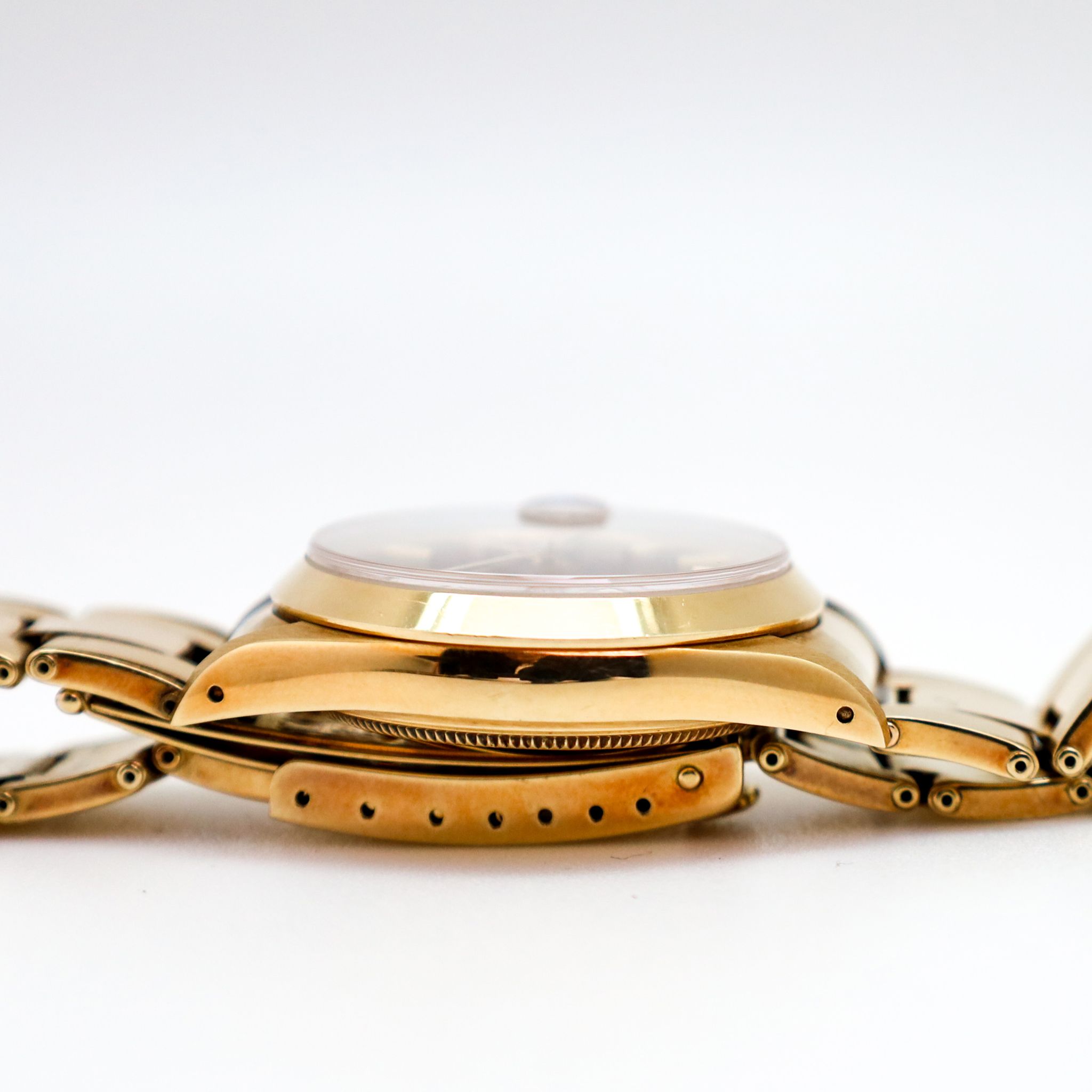 This listing is for a Rolex reference 15007. The case and bracelet are all original 14 karat yellow gold. The gold has a great rose hue from natural aging. This example is in wonderful, preowned vintage condition. The case and watch appear unpolished to our eyes. The case is thick and retains a lot of the original finishing from the factory. The dial is a beautiful black dial which contrasts nicely to the yellow gold case and bracelet. The watch is functioning and running well. This example comes as watch only (no box or papers). The bracelet has 13 total links . The end links are stamped “57”. The clasp code is stamped 7205 / 585. 6,68x serial (1981).