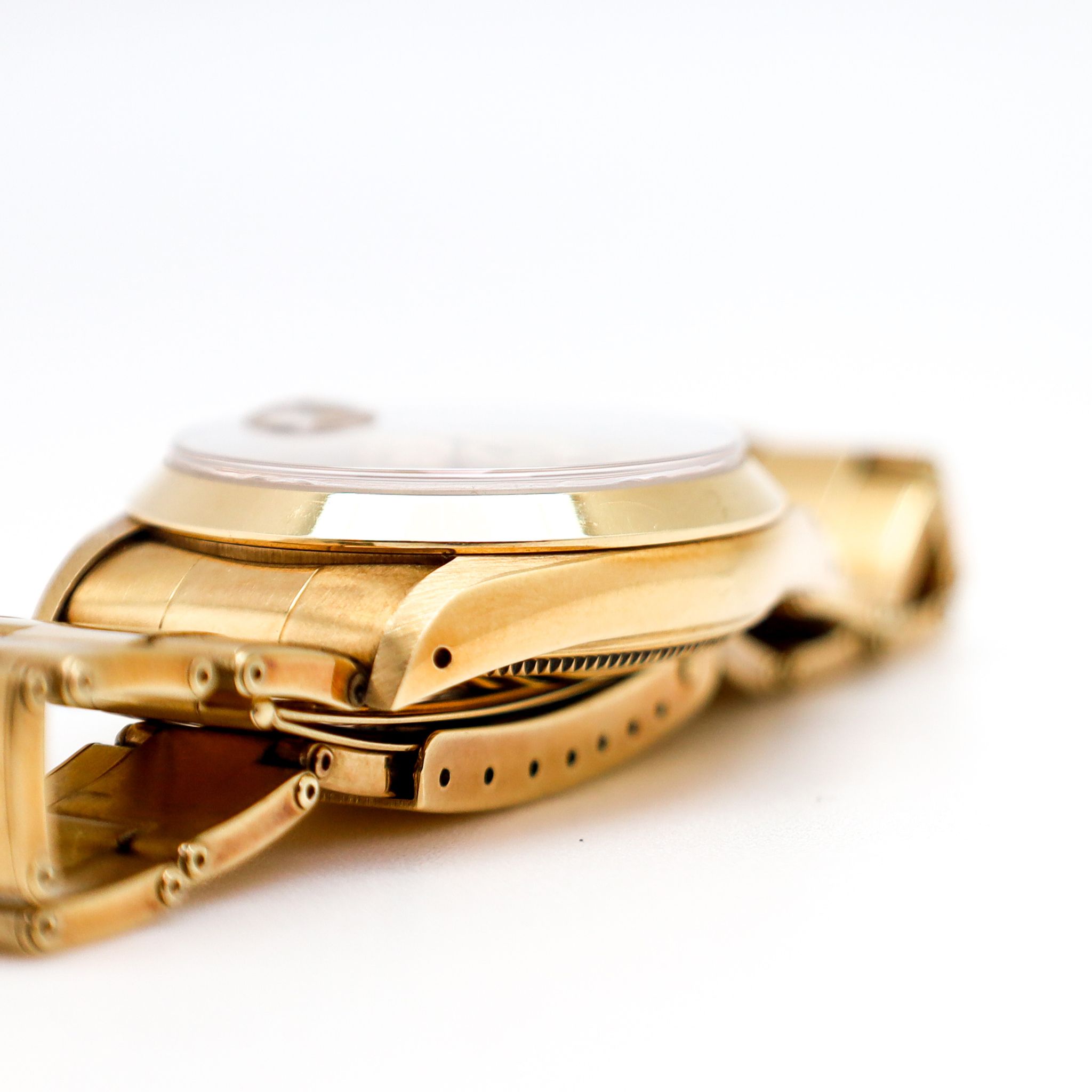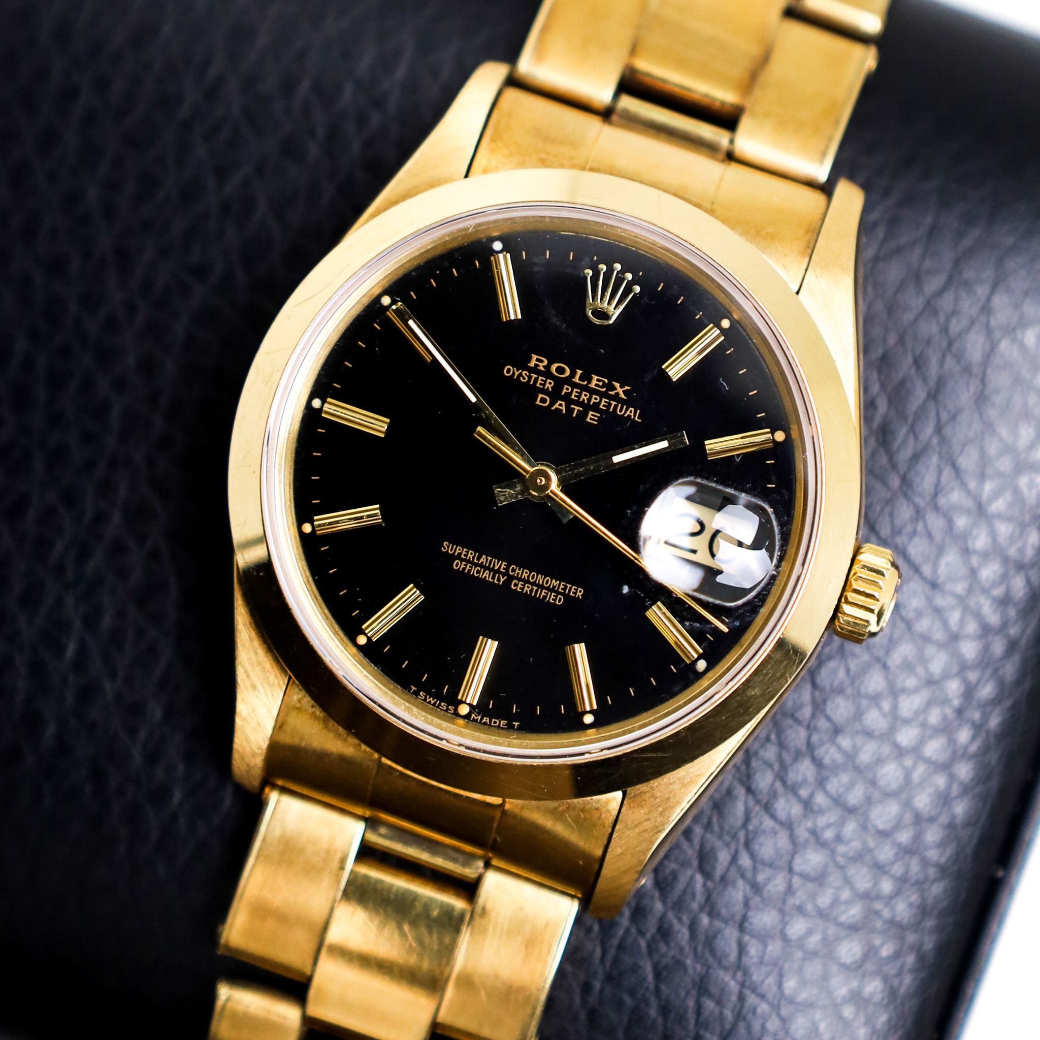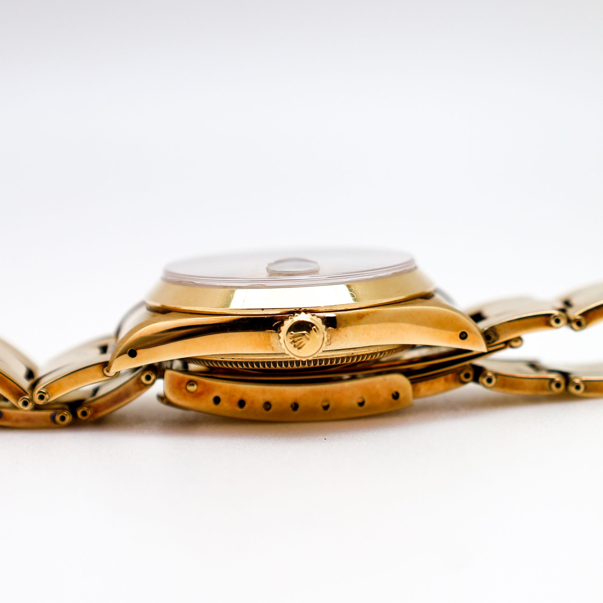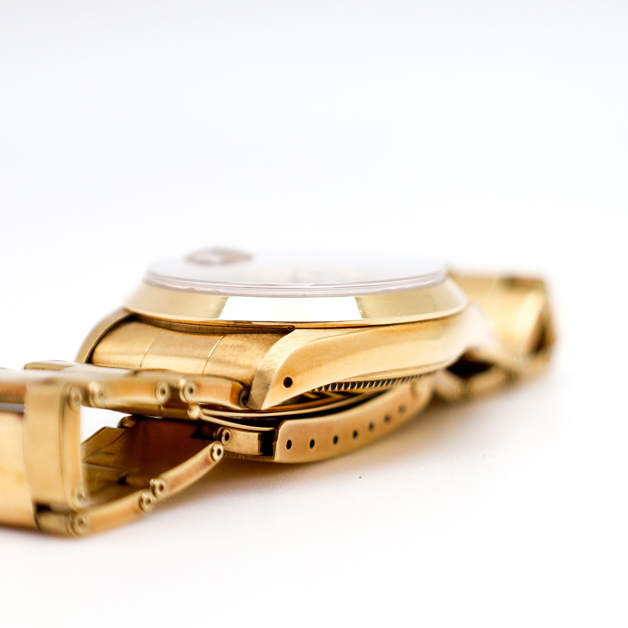 This listing is for a Rolex reference 15007. The case and bracelet are all original 14 karat yellow gold. The gold has a great rose hue from natural aging. This example is in wonderful, preowned vintage condition. The case and watch appear unpolished to our eyes. The case is thick and retains a lot of the original finishing from the factory. The dial is a beautiful black dial which contrasts nicely to the yellow gold case and bracelet. The watch is functioning and running well. This example comes as watch only (no box or papers). The bracelet has 13 total links . The end links are stamped “57”. The clasp code is stamped 7205 / 585. 6,68x serial (1981).
