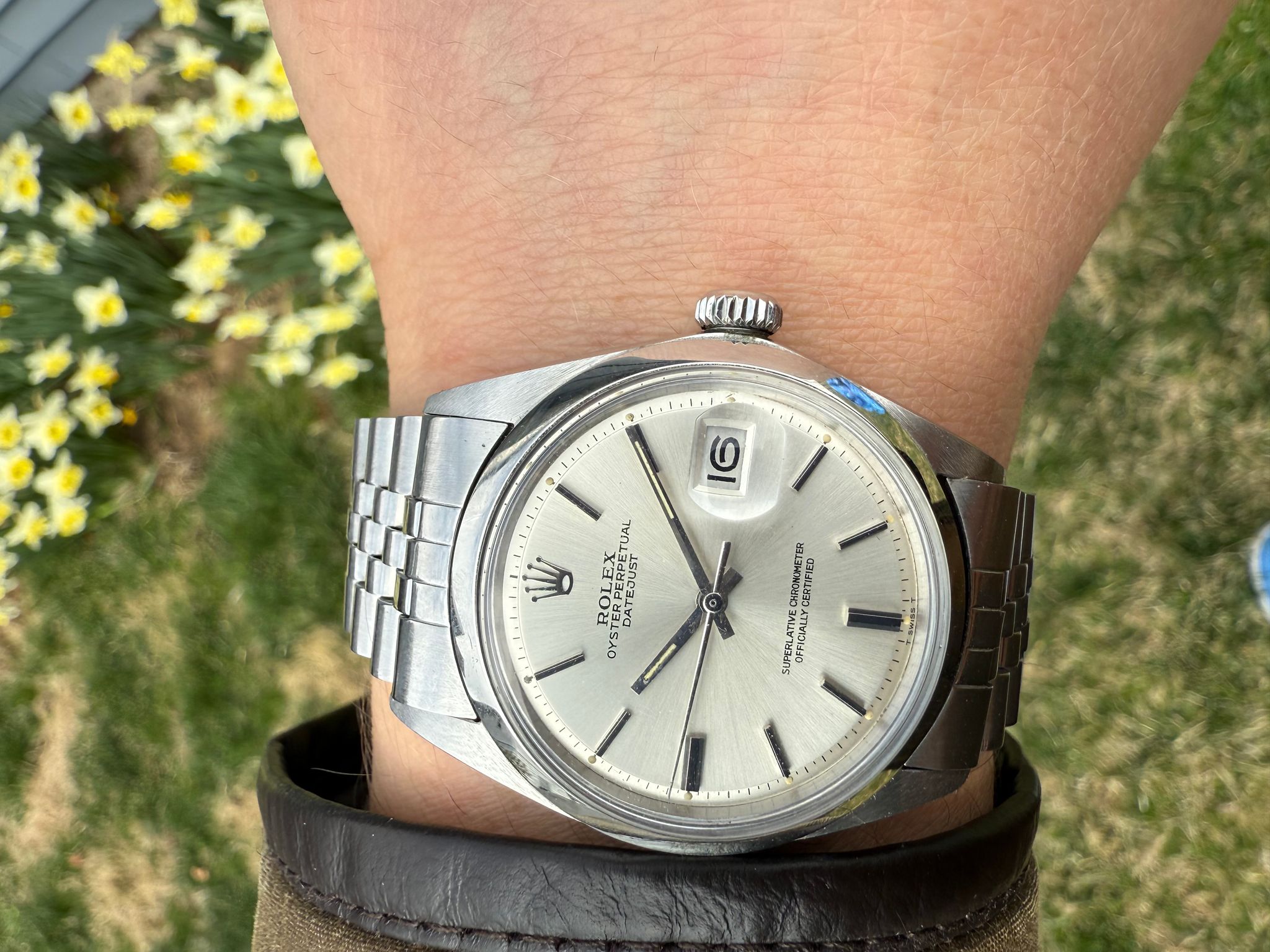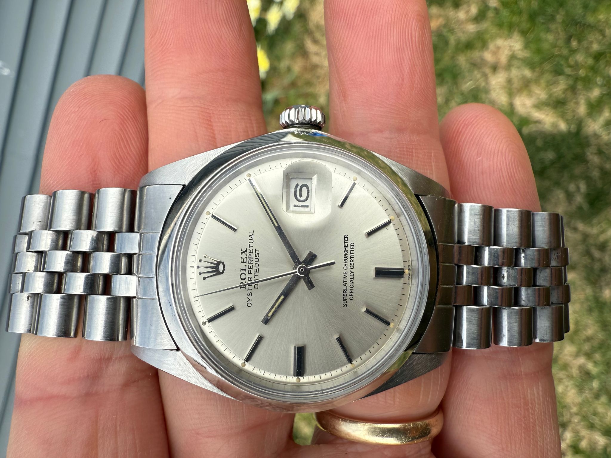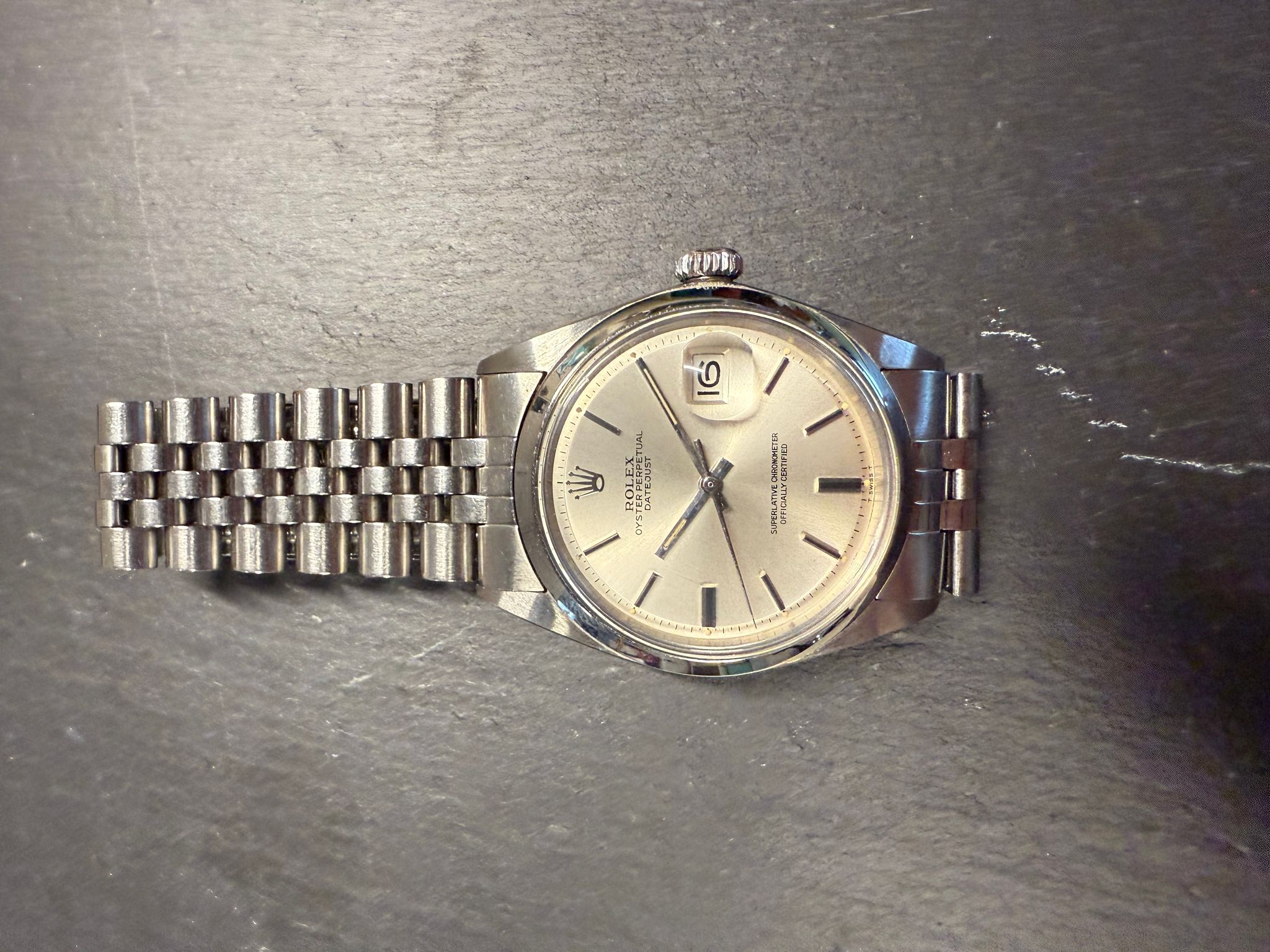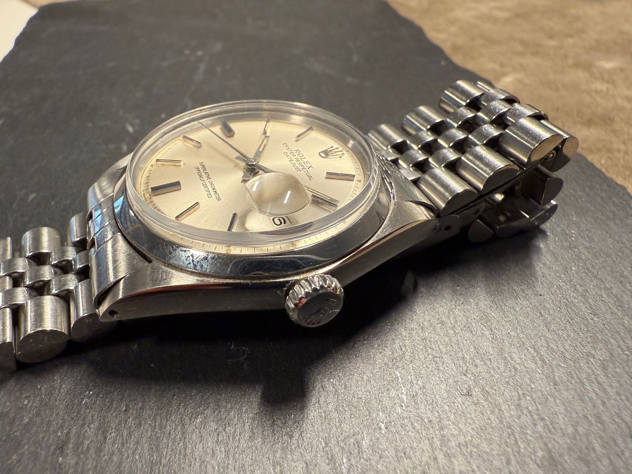The classic Rolex Oyster Perpetual Datejust is the perfect watch for all occasions. It is built to last and is the foundation of any watch collection. This unique Datejust includes a factory smooth stainless steel bezel (not often seen in this era of watches), automatic 1570 movement, and acrylic crystal. This reference 1600 Rolex 36mm Datejust from 1973 features a silver door-step dial. It comes on the original Rolex stainless steel Jubilee bracelet. Includes a letter of authenticity and one-year limited warranty on the movement of the watch from Veralet.