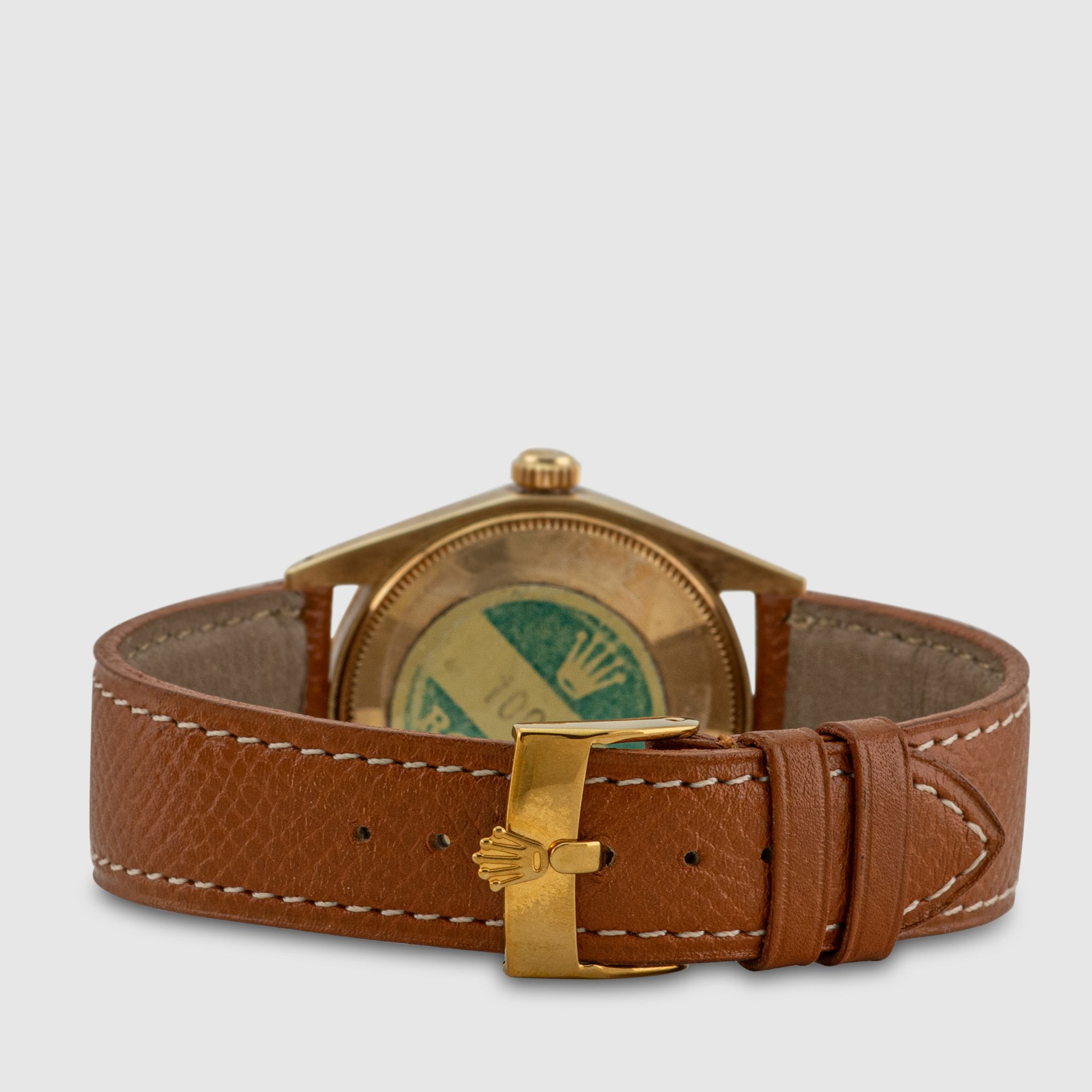 The watch is made of 18K gold and can be easily described as a time capsule. The outstanding condition of this timepiece is underlined by its razor sharp unpolished case that has obtained a light but visible rosy patina over its 55 years of life; we believe it has probably spent its time in a dark safety box. The very fine fluted bezel is free of any wear and upon magnification also shows a subtle patina harmonizing with the rest of the case. The lugs are long and well defined, showing beautiful factory finish. As we would expect from a watch in this condition the original case back sticker is fully present with readable reference number.