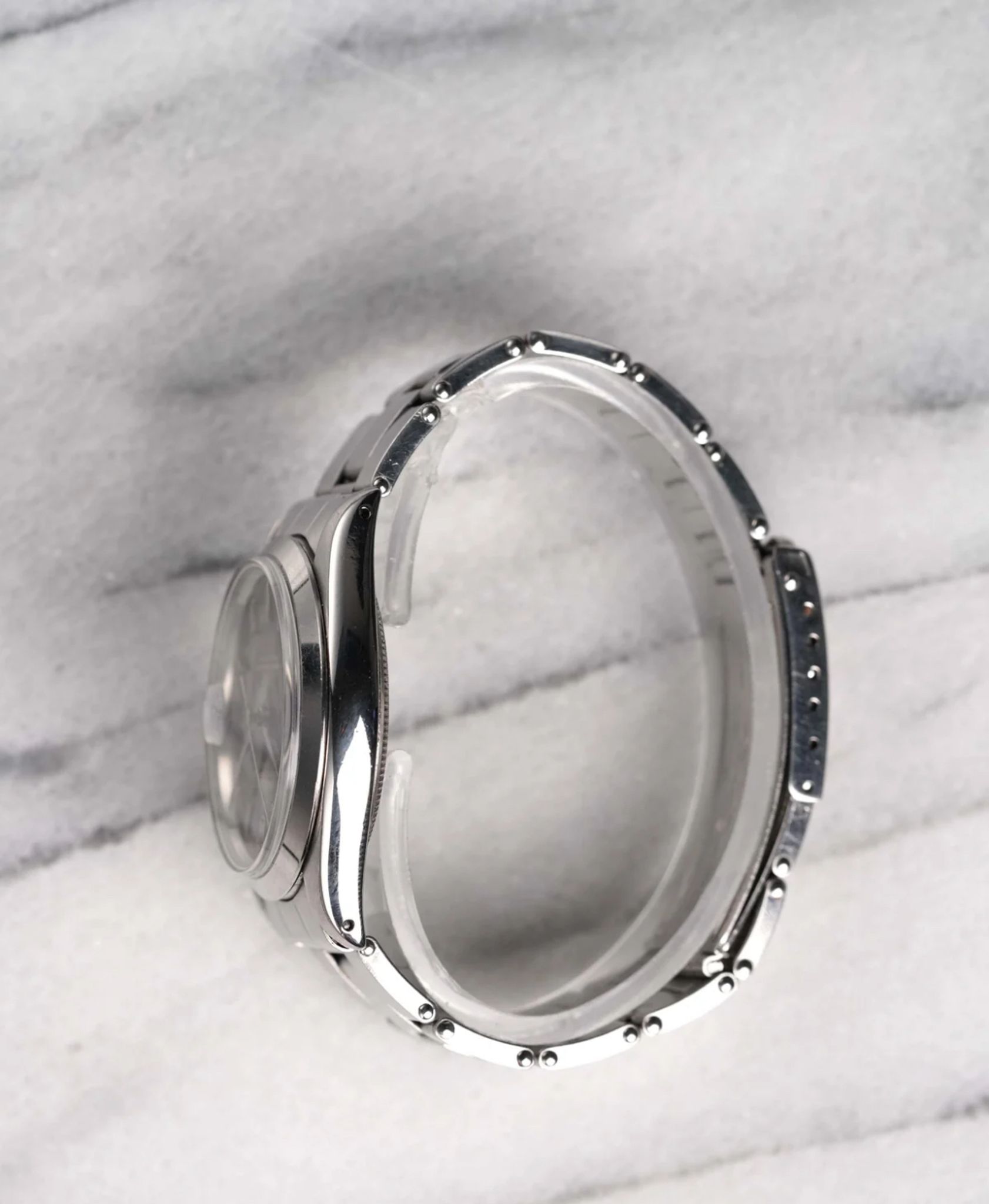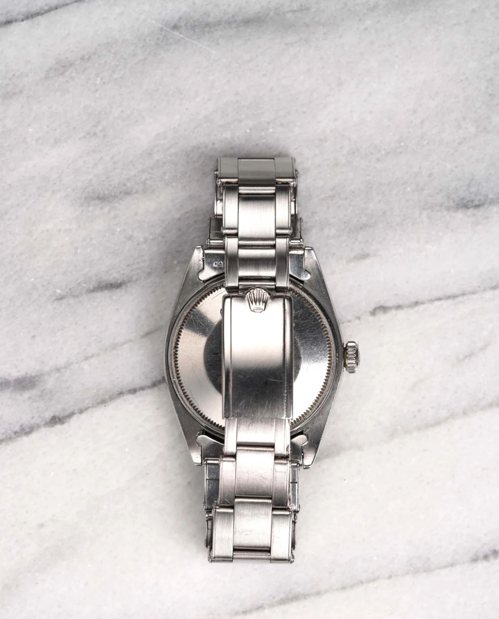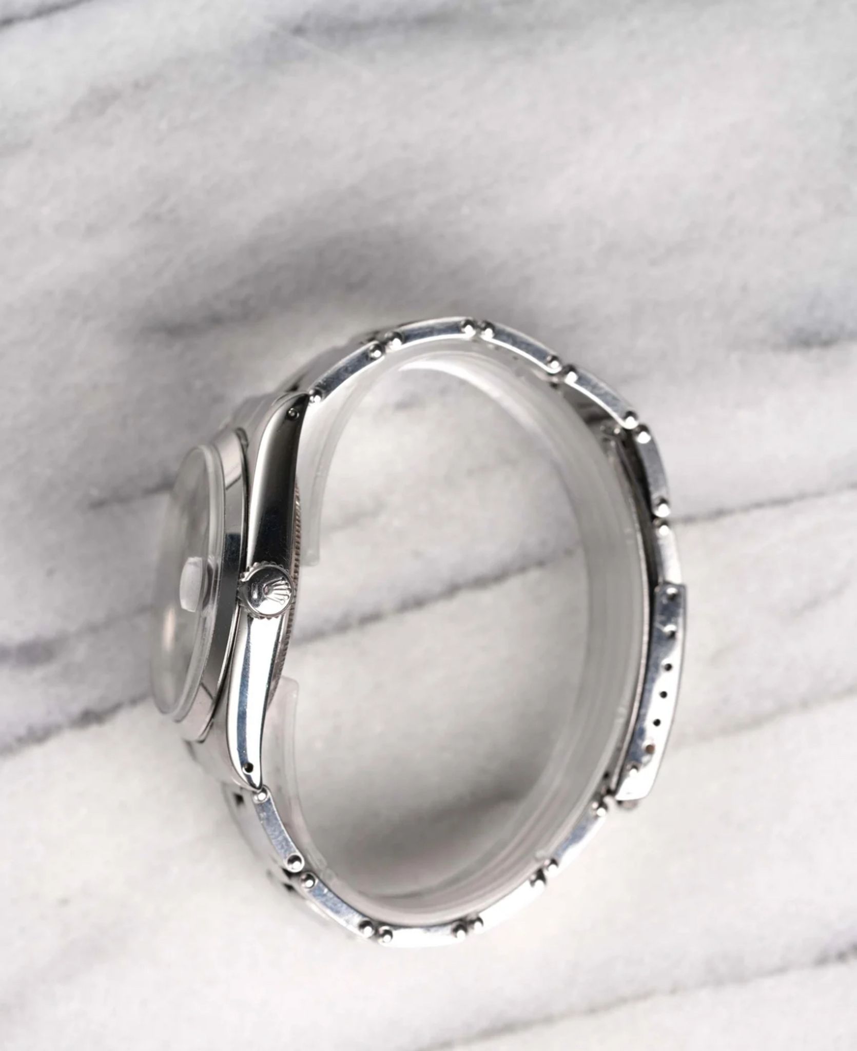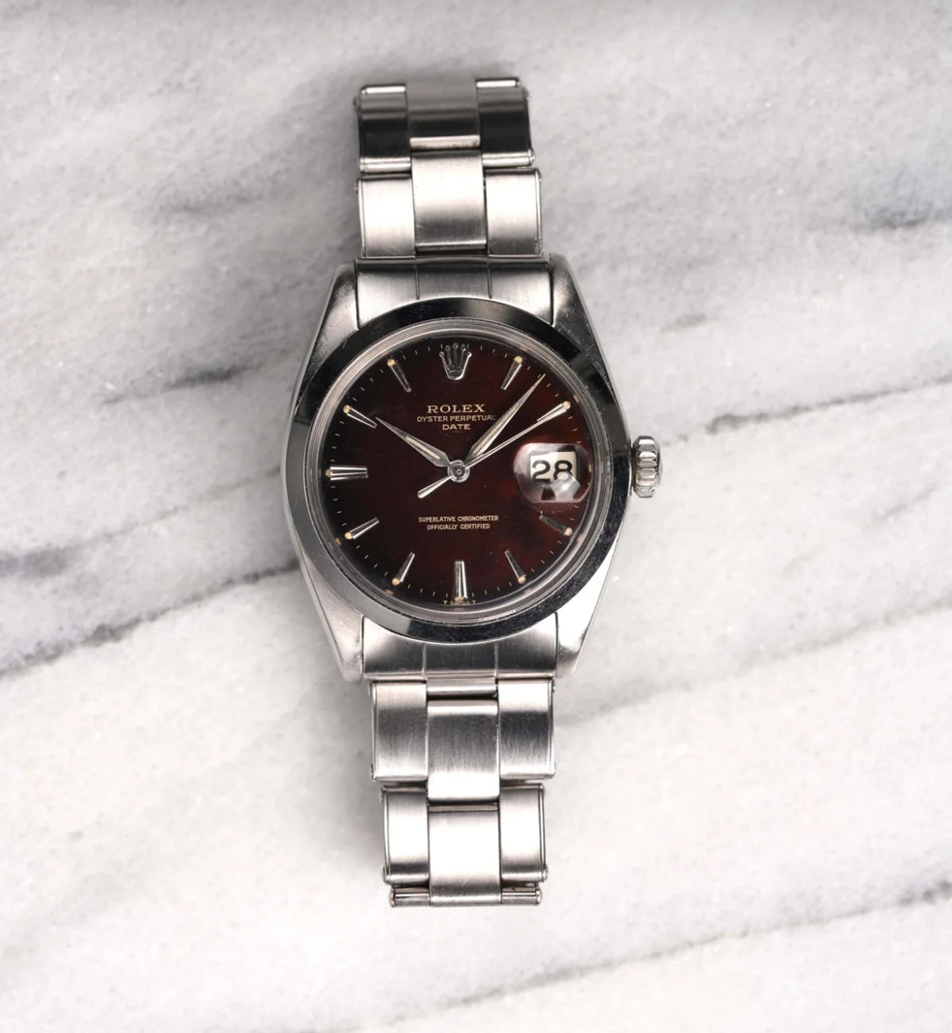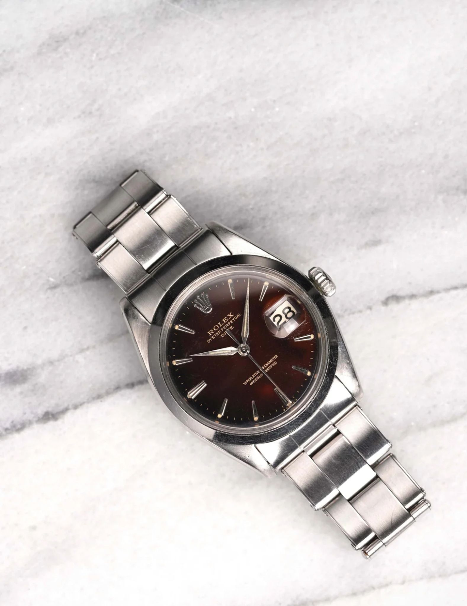 Here's a vintage Rolex Oyster Perpetual reference 1500 automatic with a brown tropical dial from the 1960s. The dial went from black to brown. Keeps great time and is fully functional. Measurements include a 34mm oyster case and 19mm lug width. It's on its original 19mm rivet oyster bracelet that fits up to a 7 inch wrist. Time only. The chocolate dial varies in the light, has some speckling as seen in photos. Drilled lug holes. The lume in both the hands and lume plots are even. Stainless steel case and caseback. All parts are original including the signed Rolex crown, dial, movement, and caseback.