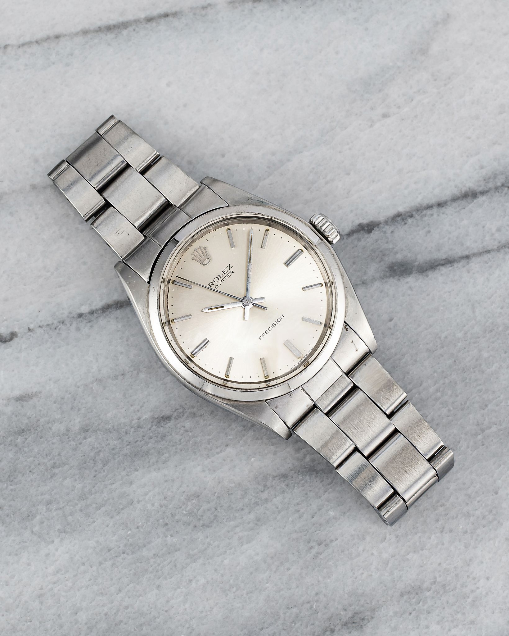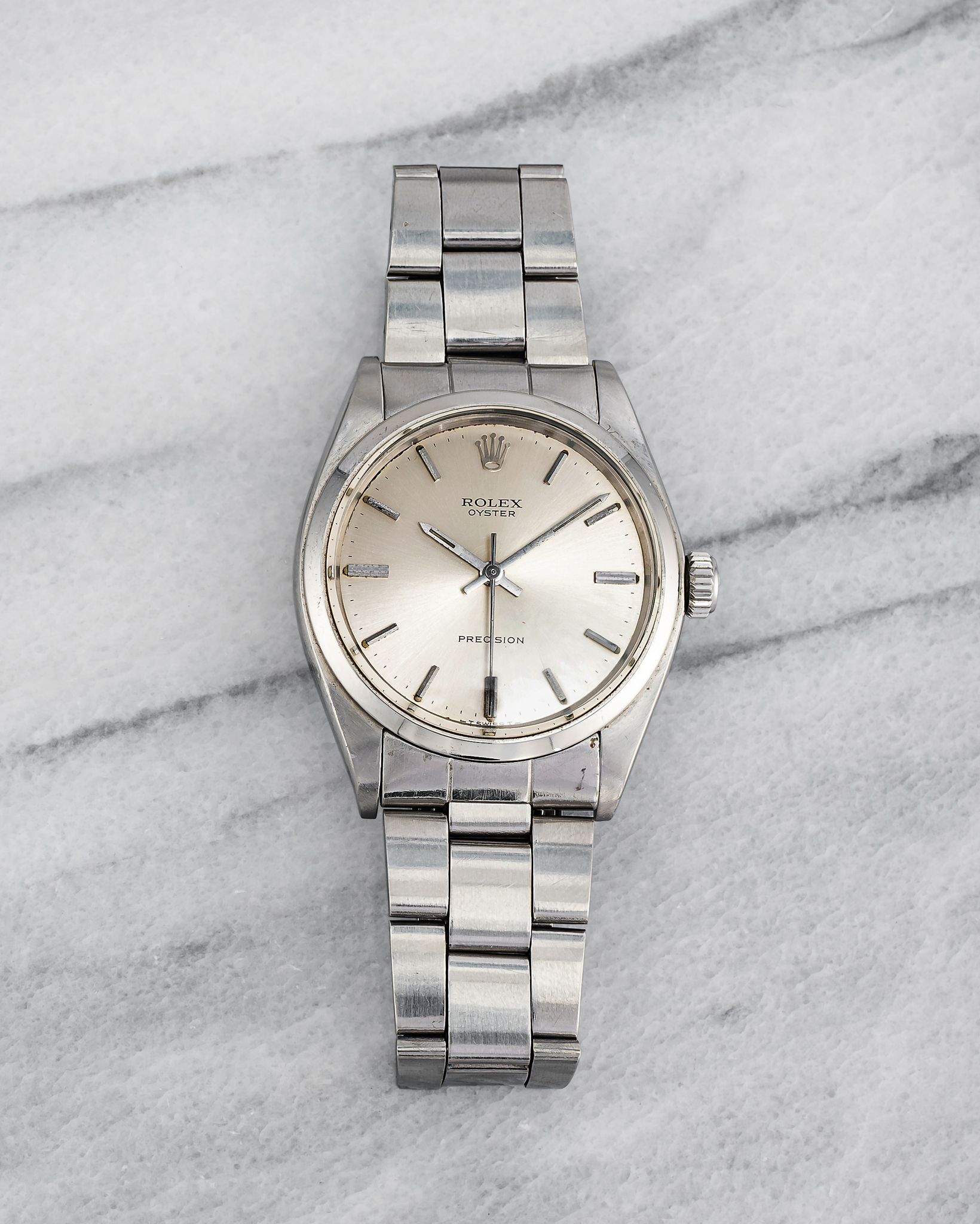 Here's a Rolex Oyster Precision reference 6426 with a silver dial manual wind from the 1970s. Measurements include a 34mm case and 19mm lug width. Fits up to a 7 inch wrist. Ready to wear. All parts including the crown, dial, movement, and caseback are original