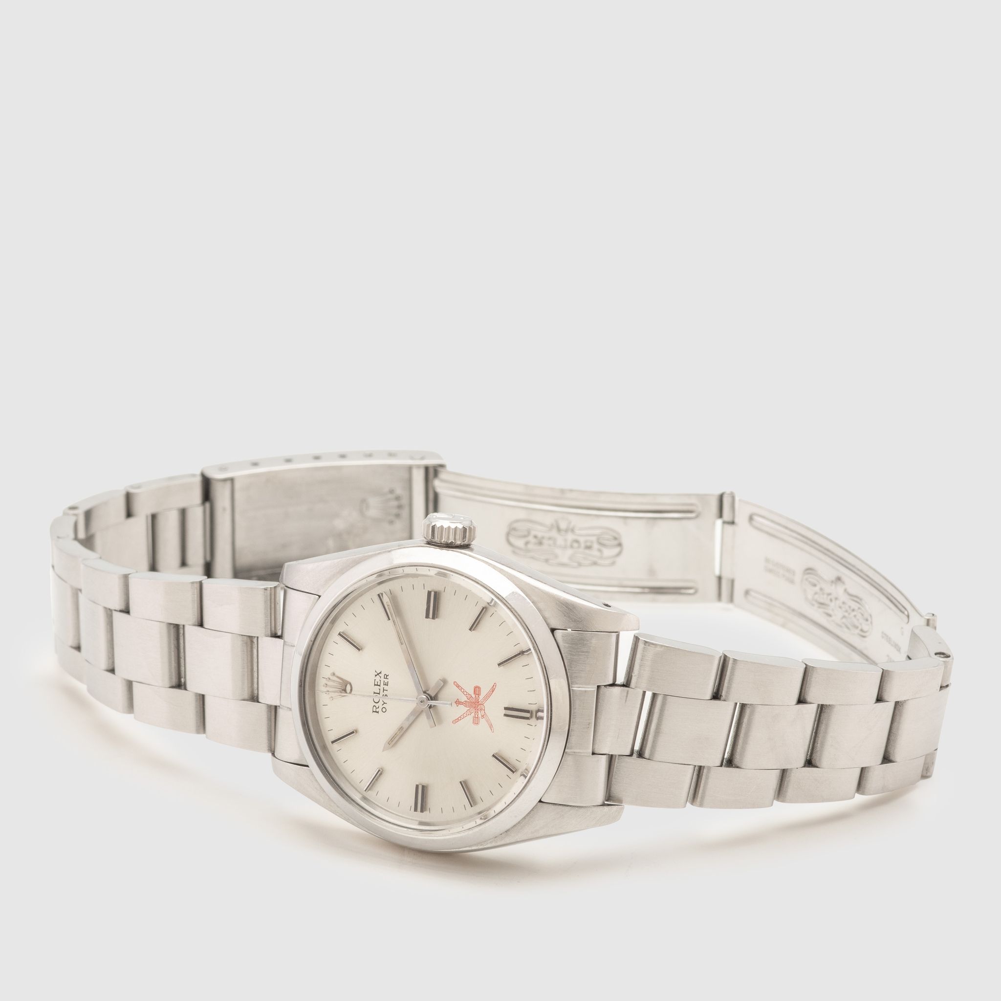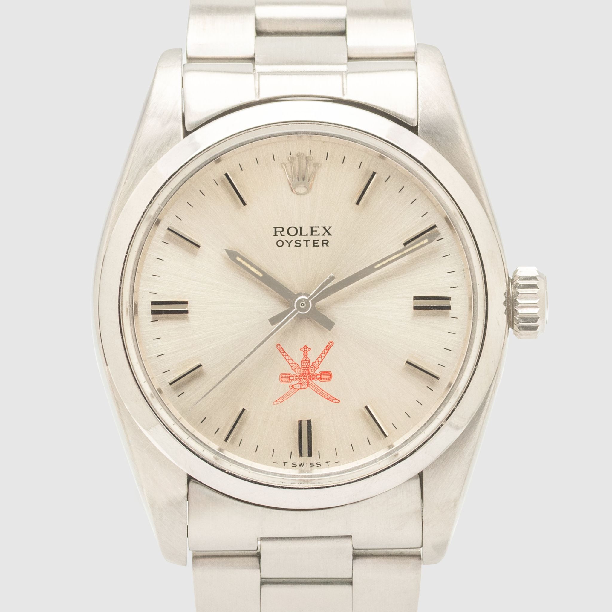 We are offering here a stunning example of a Rolex Oyster in stainless steel with the coveted Khanjar logo on the dial, made for the Sultanate of Oman in 1981. The dial is mint, not showing any wear to the naked eye. The Red print of the logo is crisp and in excellent condition. The watch is overall in a very honest condition showing some wear from age.