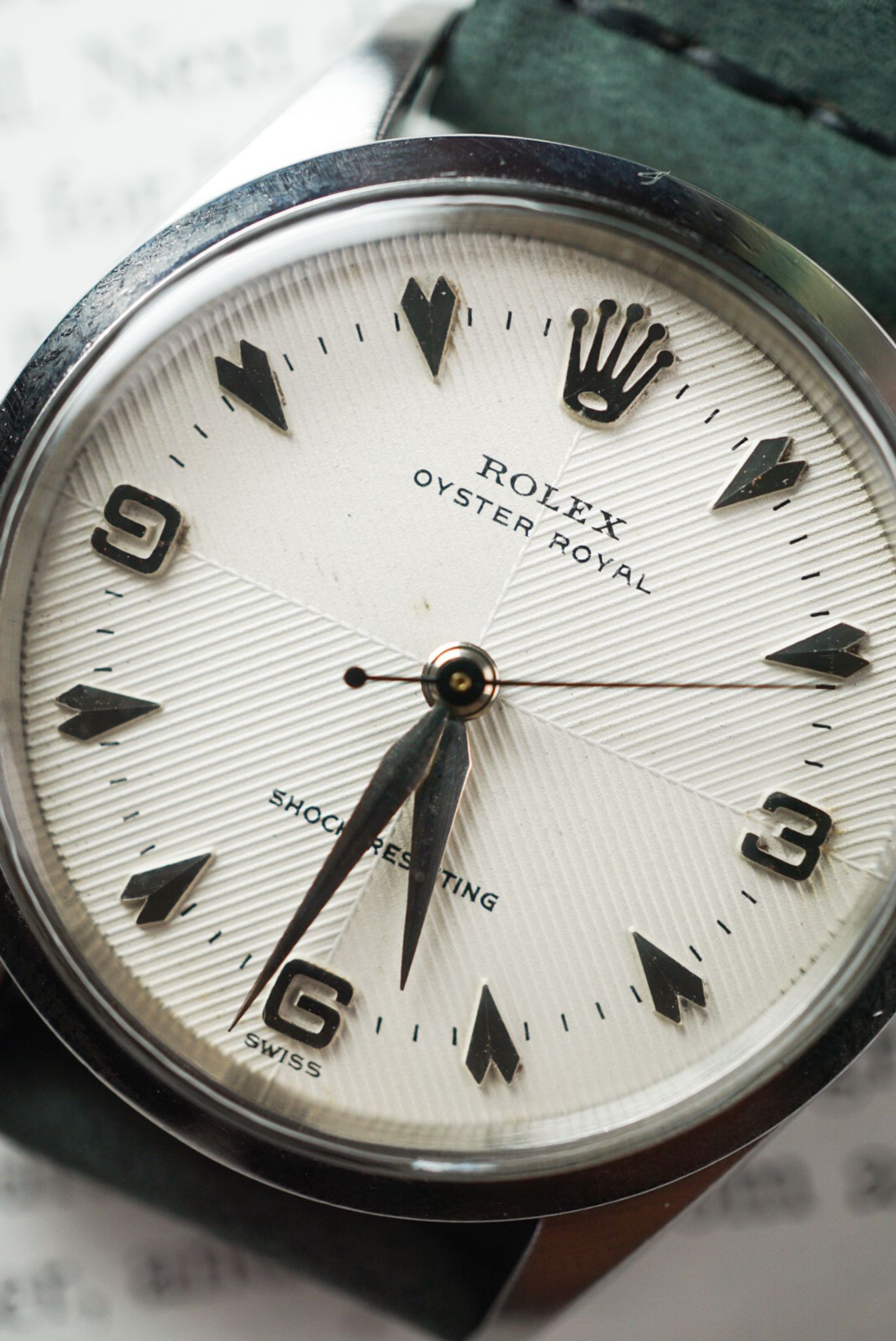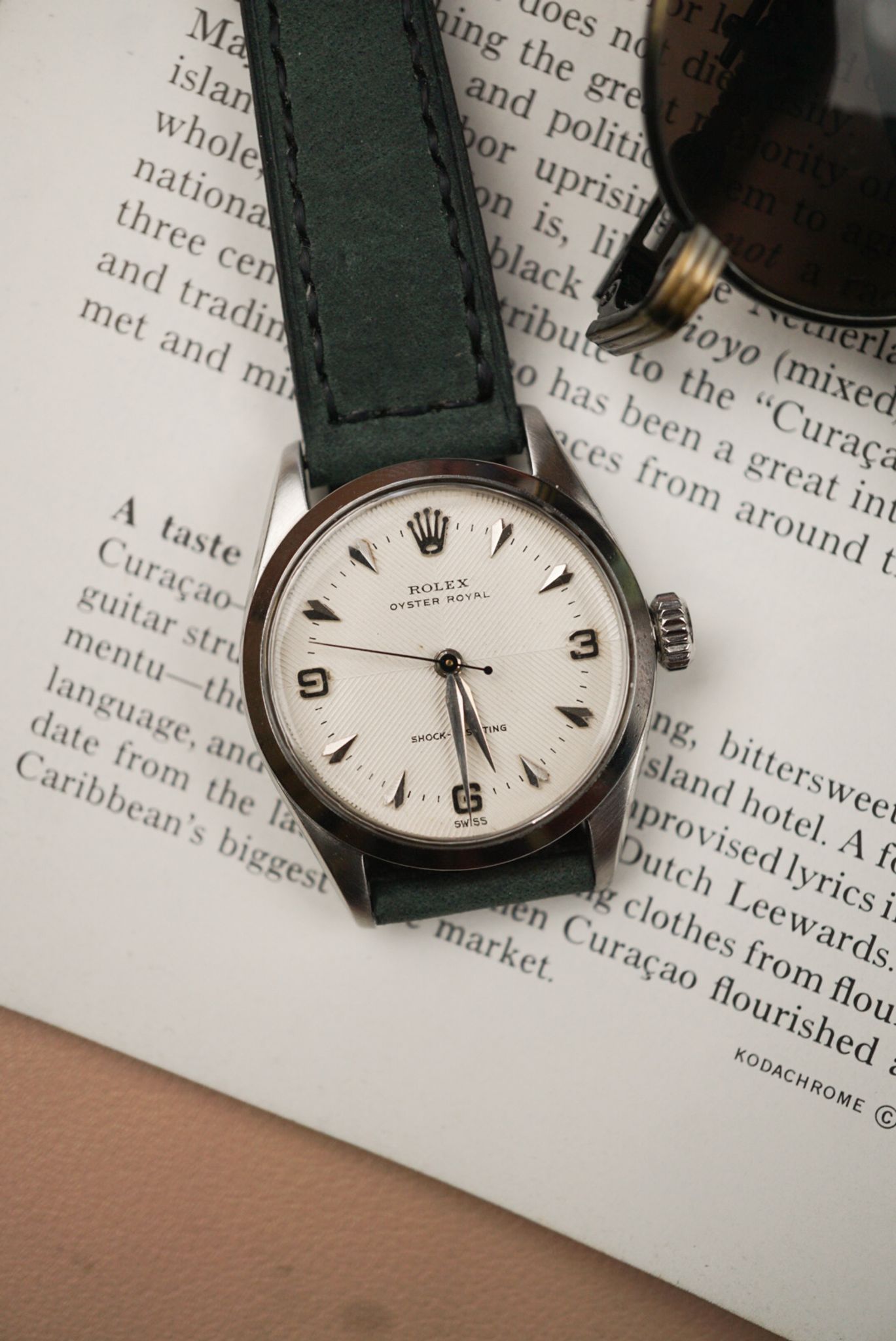 Stunning Rolex Oyster Royal Ref. 6444 from 1956 in exceptional condition. A modest 32mm, but with serious charm—featuring a patterned dial and clean Explorer-style numerals. Now available!