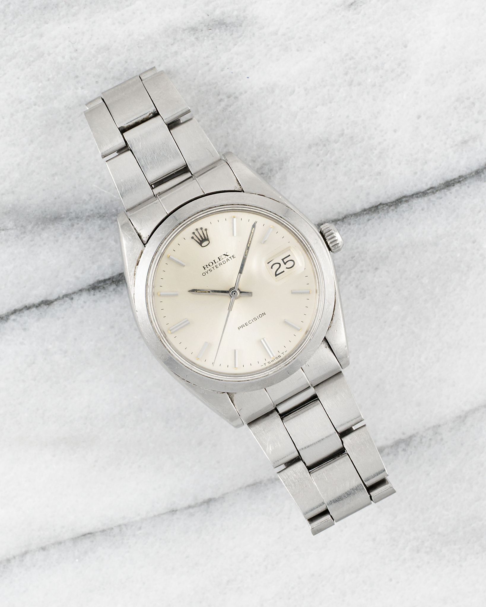 Here's a vintage Rolex oysterdate precision reference number 6694 manual wind with a silver sunburst dial from the late 60s, early 70s. Keeps great time and is fully functional. Measurements include a 34mm oyster case and 19mm lug width. It's on its original rivet oyster bracelet that fits up to a 7 inch wrist. Time and non-quick date function at 3 a clock. Silver sunburst dial with matching silver hands and hour markers. Drilled lug holes. All parts are original including the signed Rolex crown, dial, movement, and caseback. Both the dial and case are in great cosmetic, untouched condition.