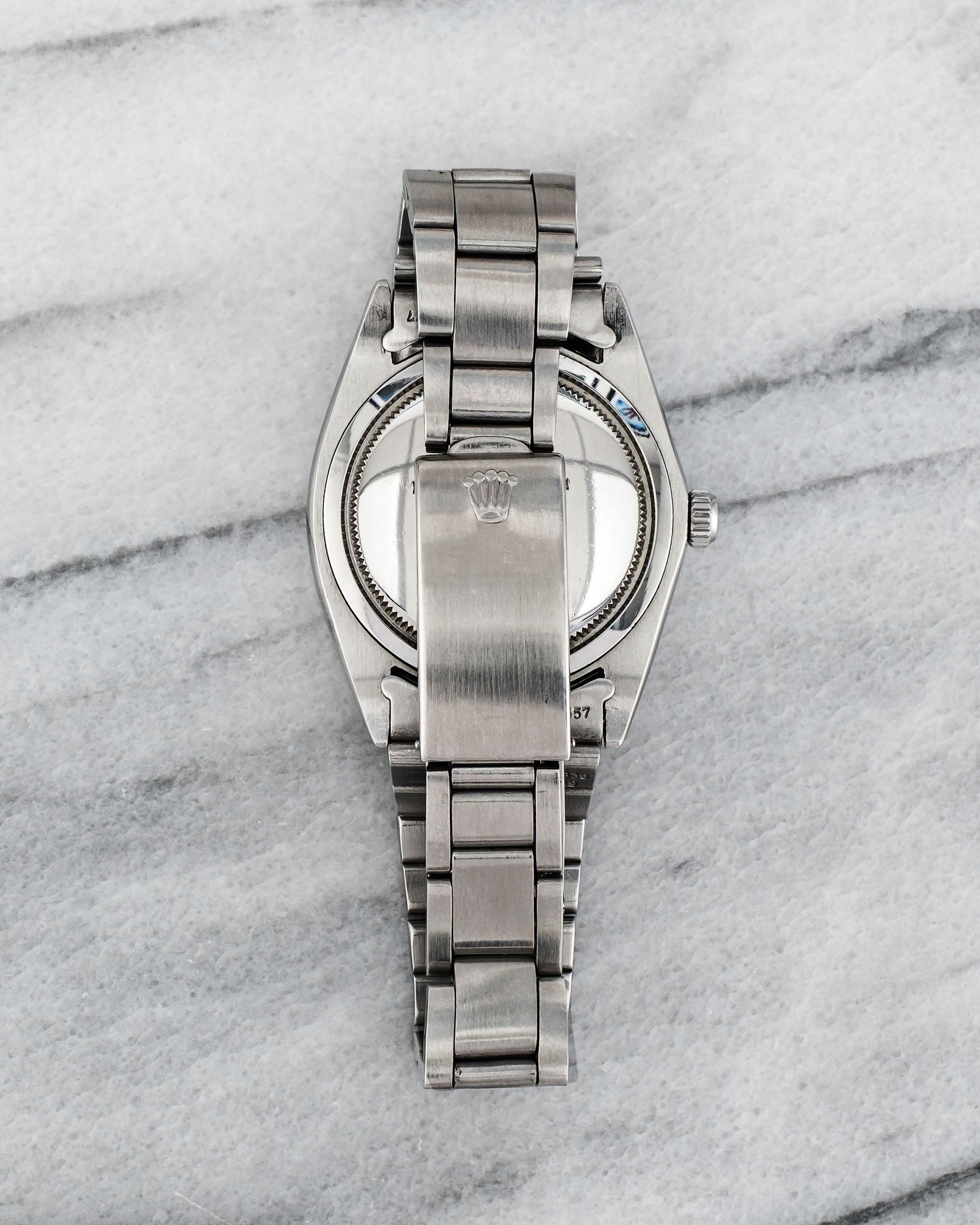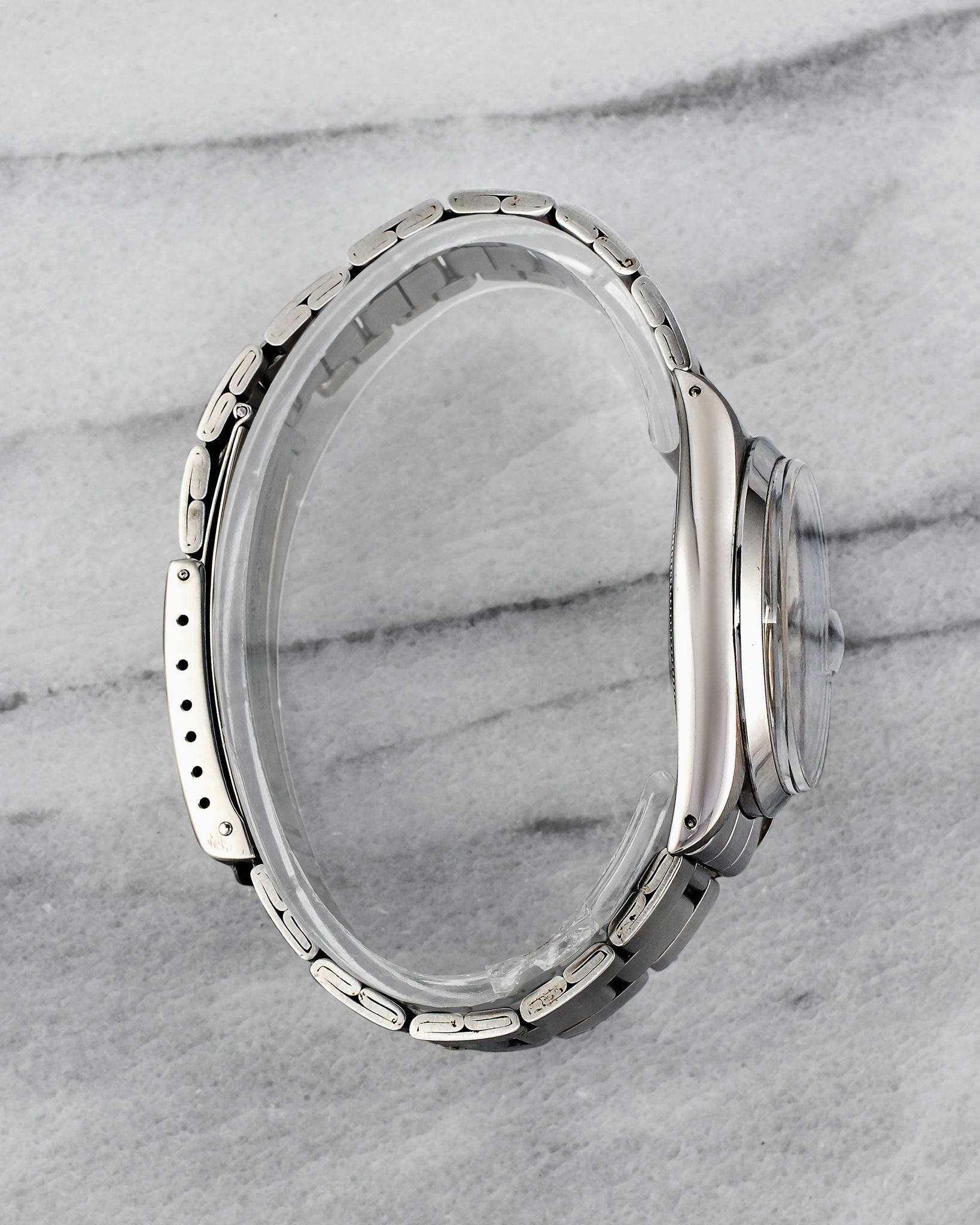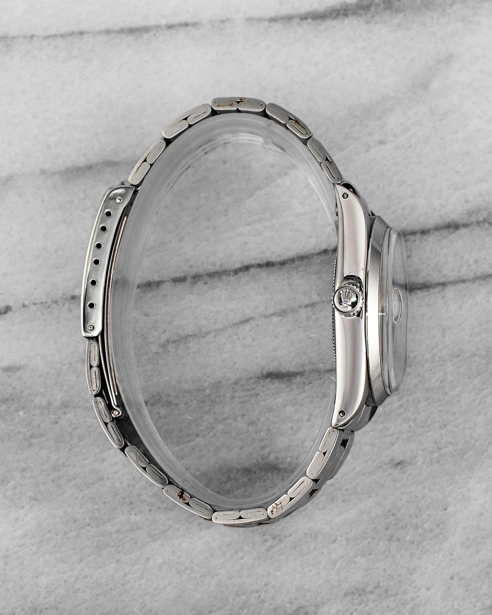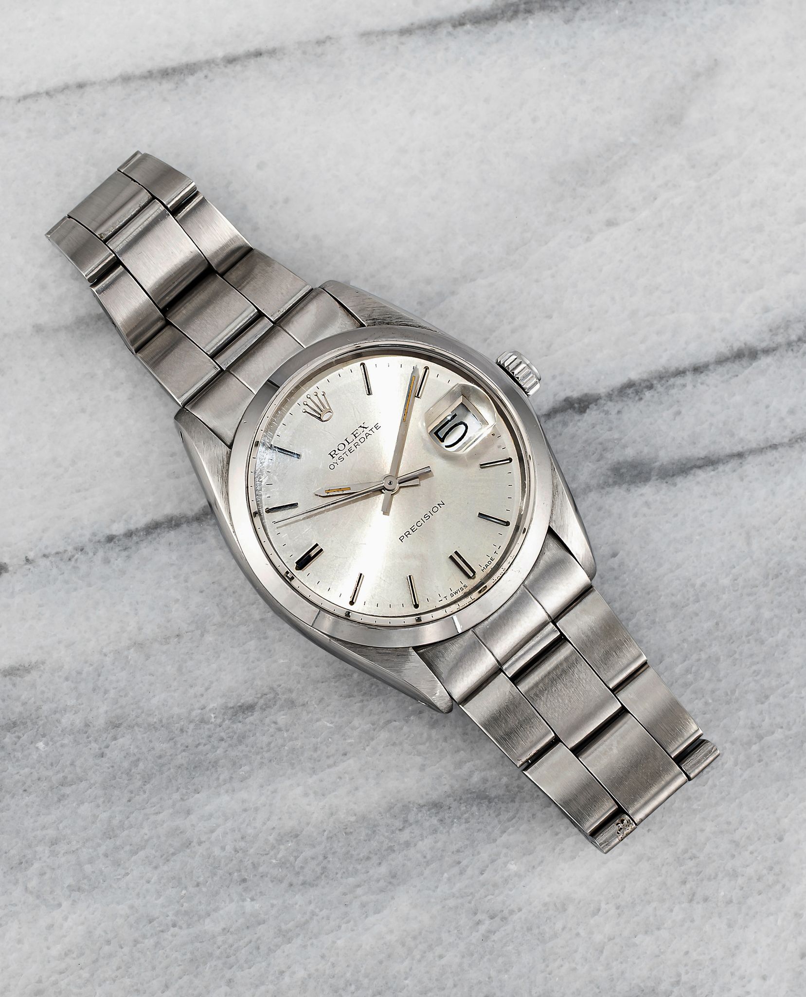 Here's a Rolex Oysterdate Precision reference 6694 with a silver dial manual wind from the 1970s. Measurements include a 34mm case and 19mm lug width. On its steel rivet bracelet that fits up to a 7 inch wrist. All parts including the crown, dial, movement, and caseback are original.