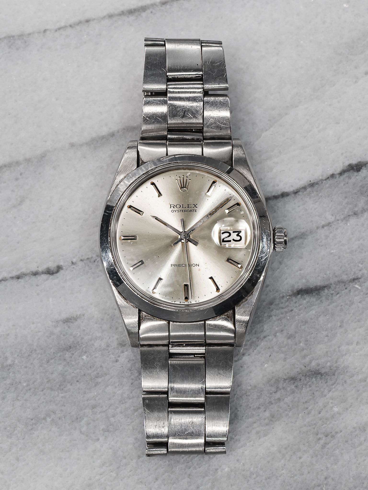Here's a vintage Rolex Oysterdate Precision reference 6694 manual wind from the 1970s with a silver dial. Measurements include a 34mm steel case and 19mm lug width. Non quick date function at 3 o’clock. Bracelet fits up to a 7 inch wrist. All parts including the crown, dial, movement, and caseback are original.