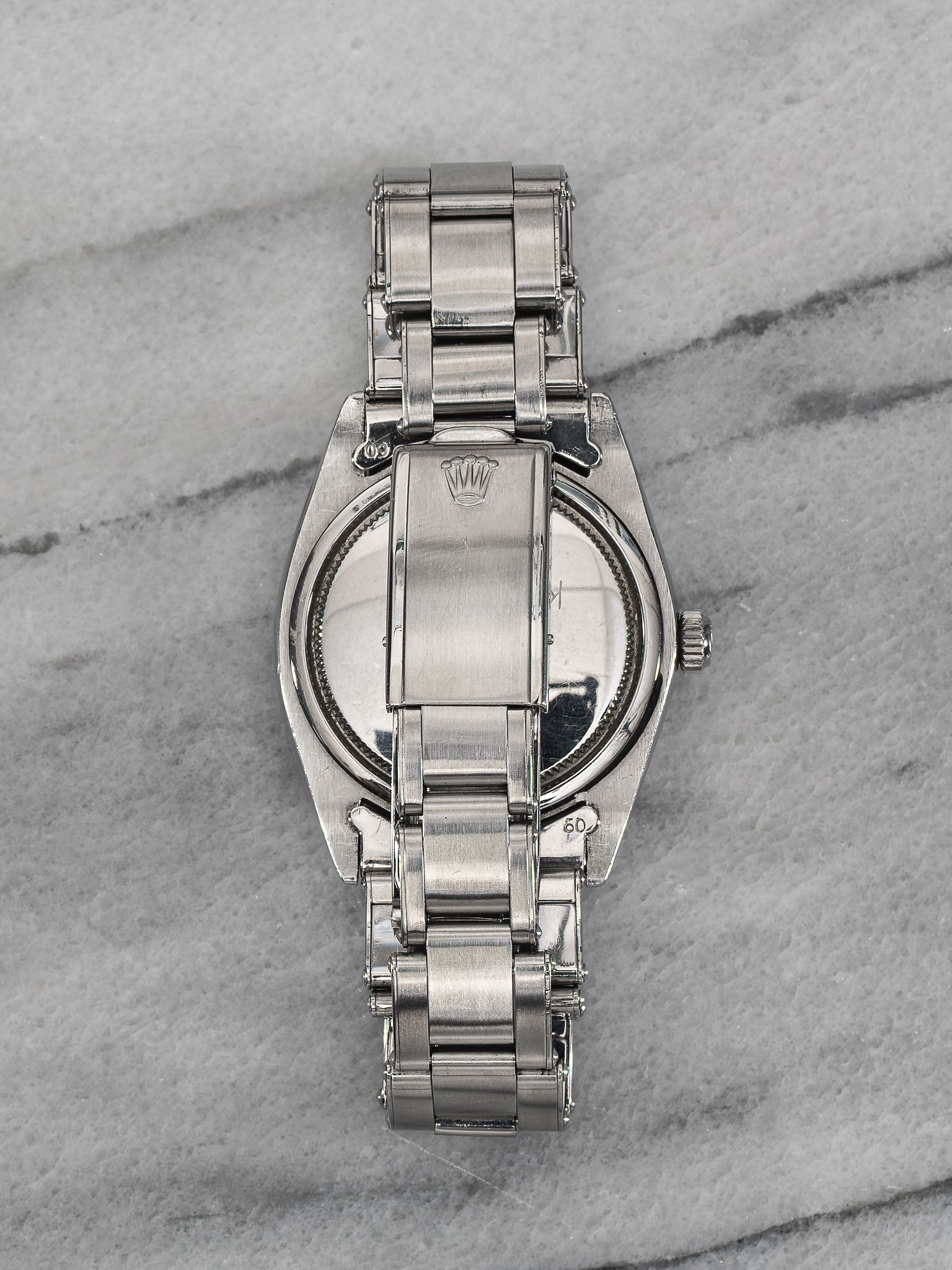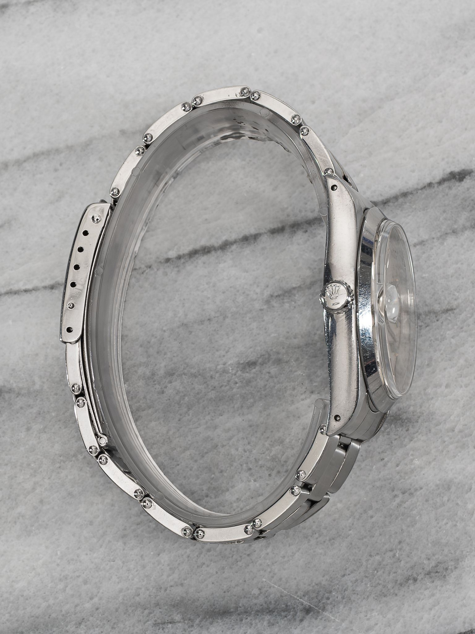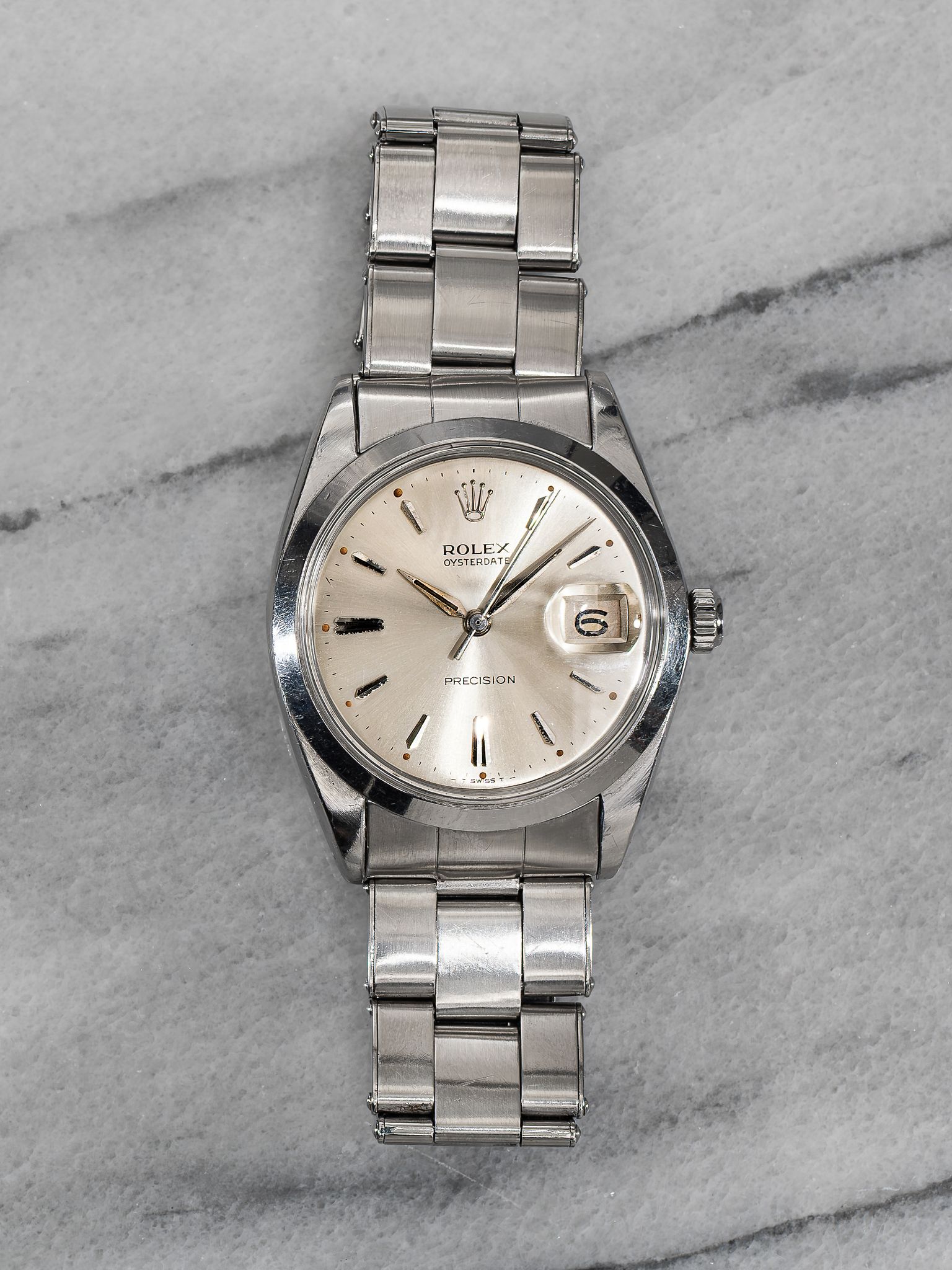 Here's a vintage Rolex Oysterdate Precision reference 6694 manual wind from the 1970s with a silver dial. Measurements include a 34mm steel case and 19mm lug width. Non quick date function at 3 o’clock. Bracelet fits up to a 7 inch wrist. Matching patina in both the hands and hour markers. Alpha hands. All parts including the crown, dial, movement, and caseback are original.