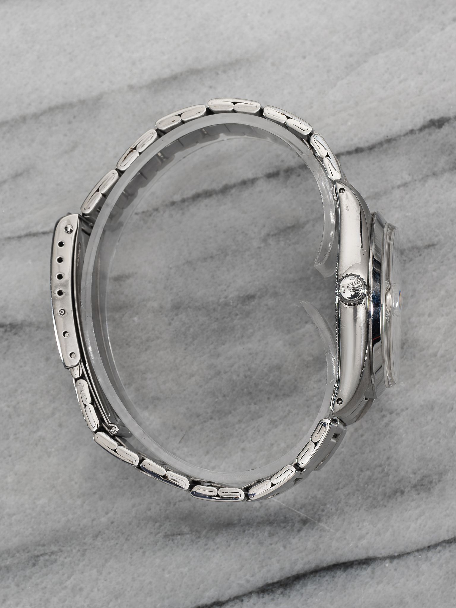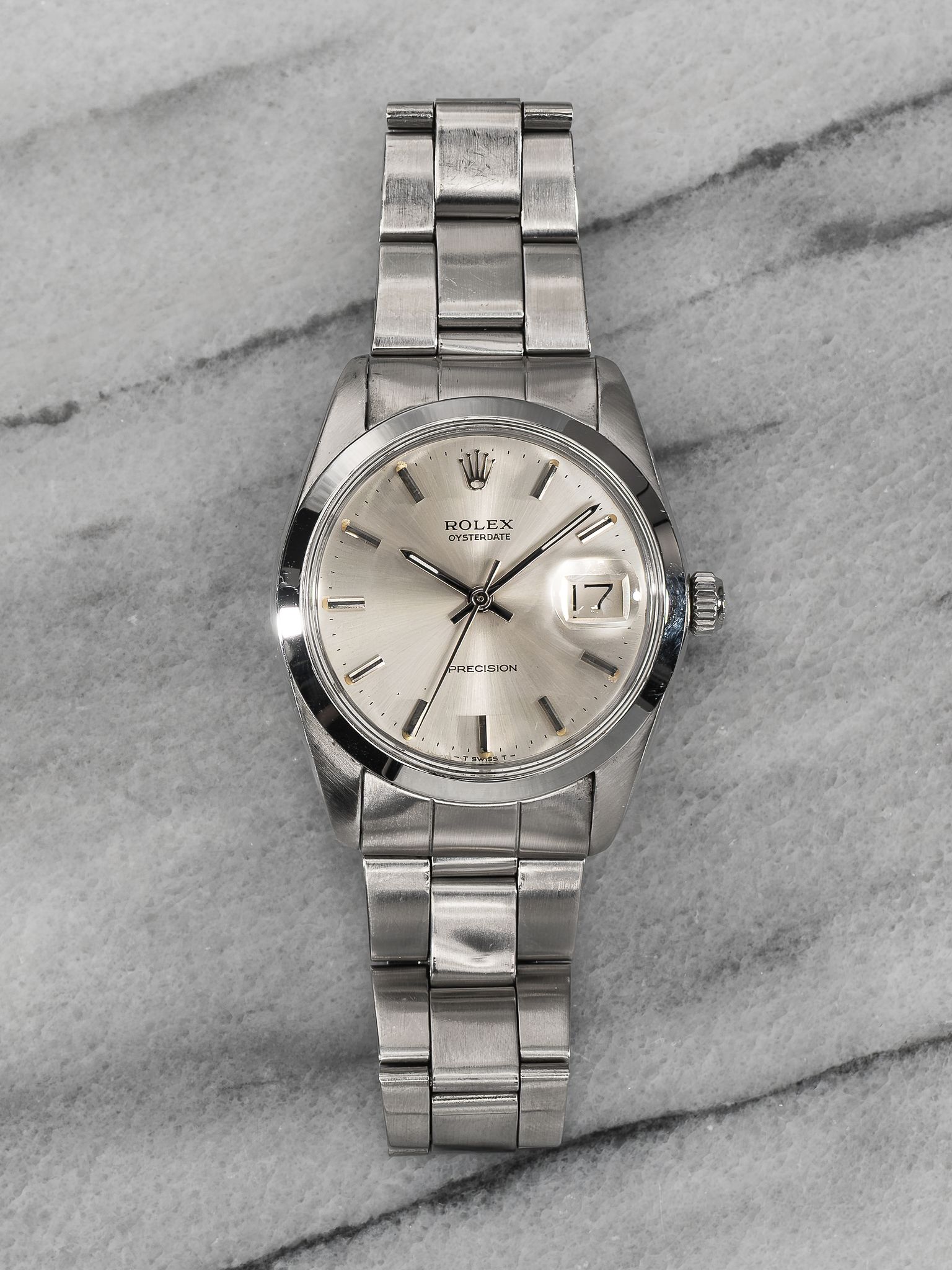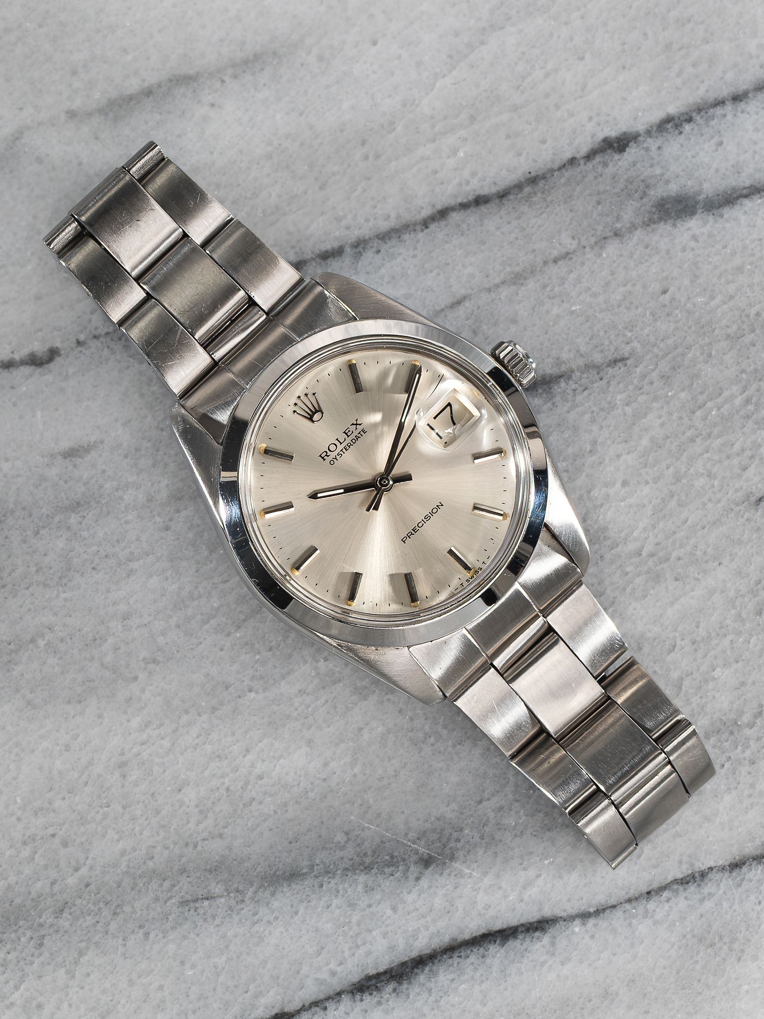 Here's a vintage Rolex Oysterdate Precision reference 6694 manual wind from the 1970s with a silver dial. Measurements include a 34mm steel case and 19mm lug width. Non quick date function at 3 o’clock. Bracelet fits up to a 7 inch wrist. All parts including the crown, dial, movement, and caseback are original.