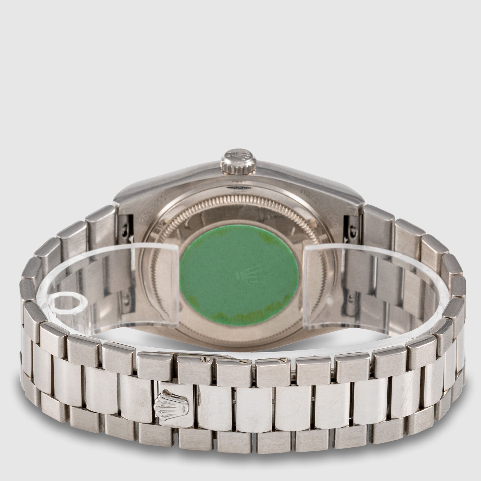 Case: Excellent unpolished white gold case showing only light wear from age. The edges remain crisp and sharp showing factory bevelling. The bezel is also in excellent condition and free of any major wear or dents. Numbers on the back are crisp and fully intact. The green case back sticker is still present.