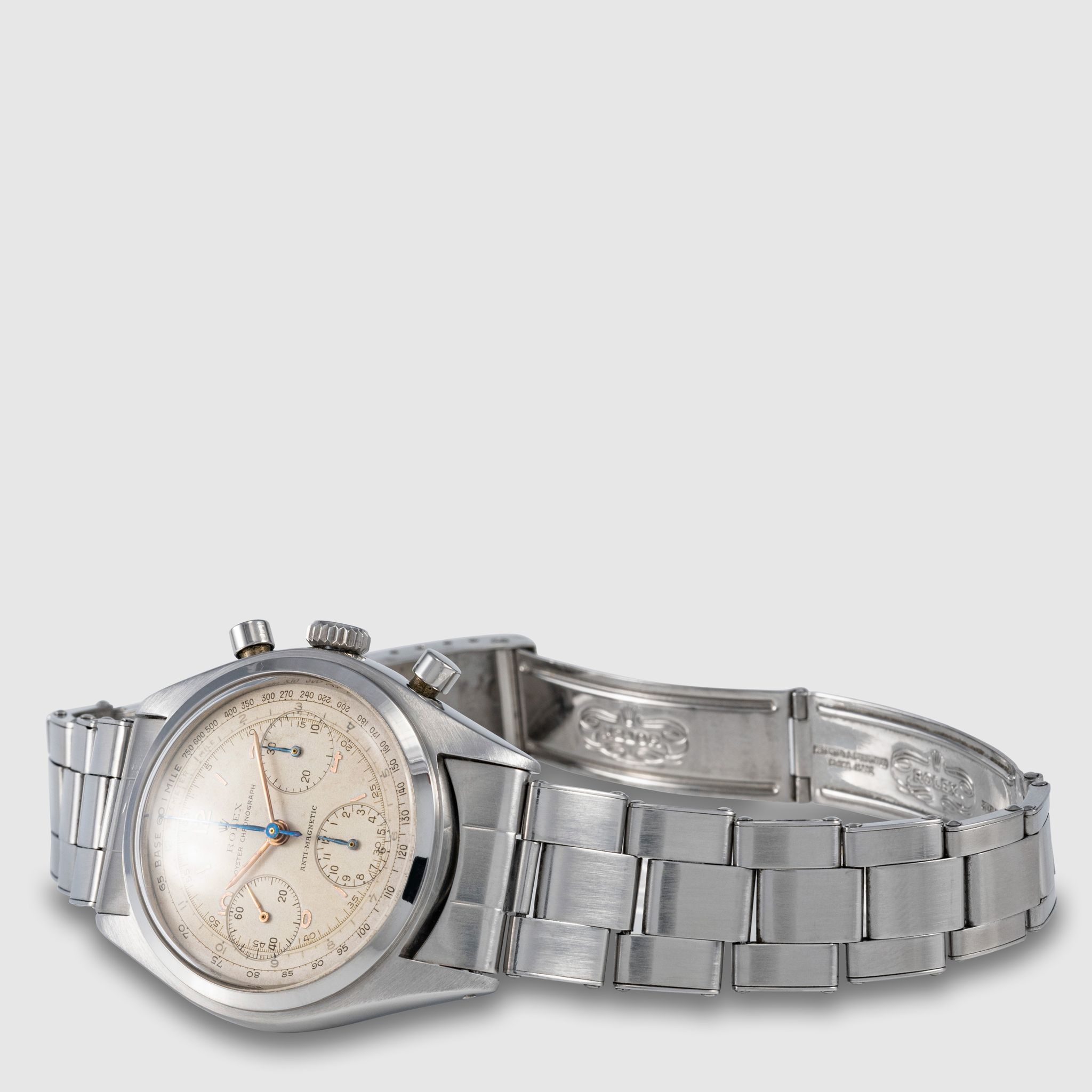 Dial: Beautiful and very clean silver dial that has aged to a creamy color. The numbers on the Telemeter Scale have slightly but evenly faded. Applied pink golden numerals and indexes with matching hands. Blued hands for 30minutes and chronograph counter