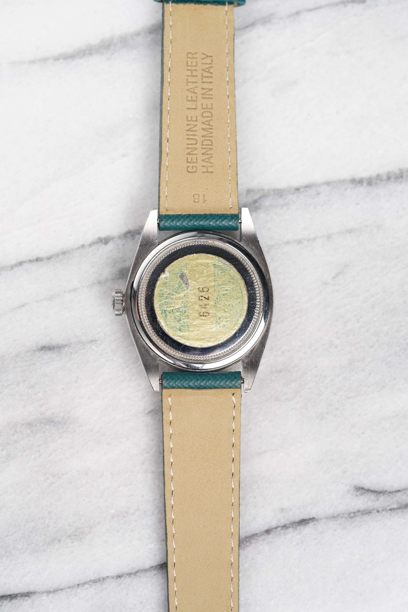 Here's a vintage Rolex reference number 6426 manual wind with a silver dial from the late 60s, early 70s in new old stock condition. Keeps great time and is fully functional. Measurements include a 34mm oyster case and 19mm lug width. It’s on a green leather strap (Made in Italy). Time only. Silver dial. The dial is clean. No lume dial. Matching hands and hour markers. Stainless steel case and caseback. Original green sticker on the caseback. Hard to find clean, untouched examples like this. The crystal and dial are free from any scratches or marks. All parts are original including the signed Rolex crown, dial, movement, and caseback. Both the dial and case are in great cosmetic, untouched condition.