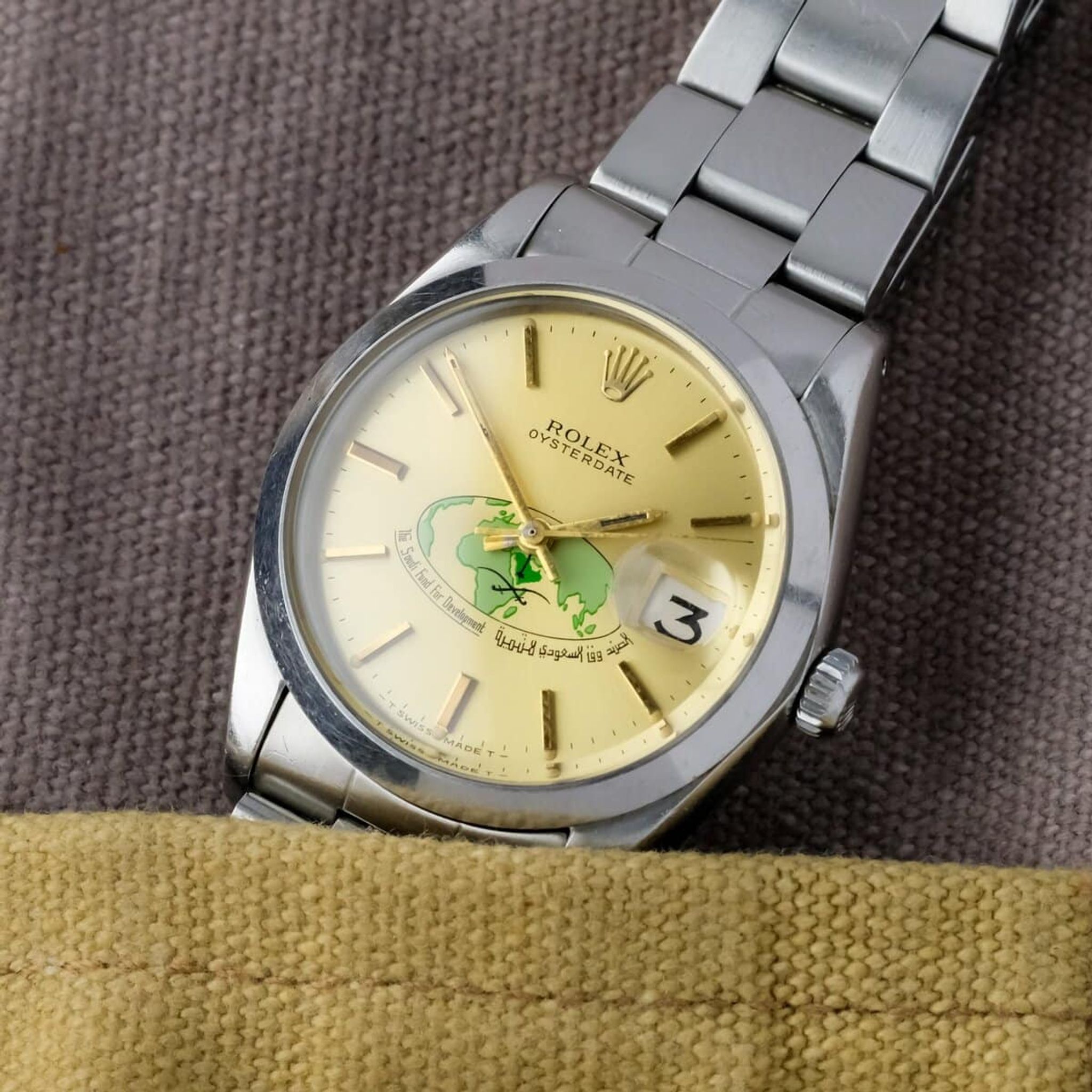 What makes this piece especially noteworthy is its exceptionally rare dial, printed with the emblem of the Saudi Fund for Development. The champagne-toned surface remains in outstanding condition with crisp, perfectly preserved printing, giving the watch both historical and collectible appeal.