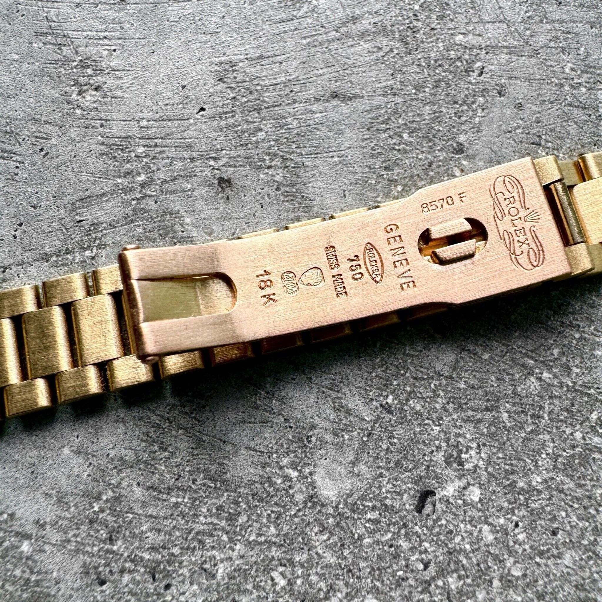 Bracelet/Strap: Factory solid 18 karat yellow gold president bracelet. It has nearly no stretch given its age. A truly well taken care of example Many of these bracelets have weak/over polished logos at the clasp whereas this one is bold and pronounced. Bracelet will fit a 6.9 inch wrist