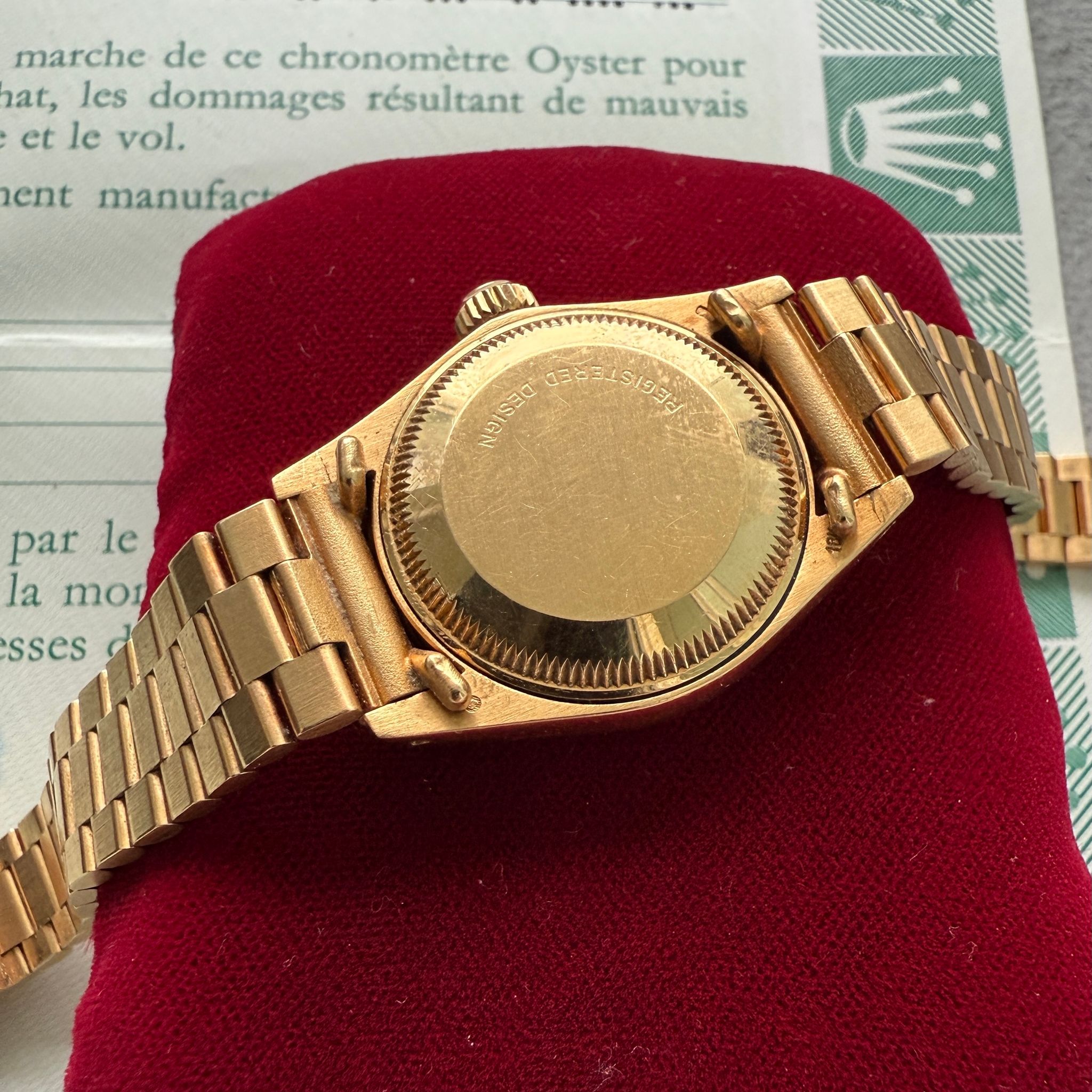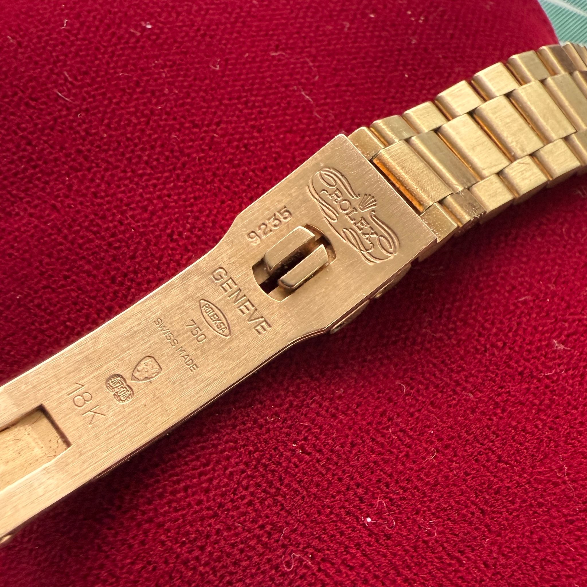 Bracelet/Strap: Factory solid 18 karat yellow gold bark president bracelet which remains unpolished and is in very tight condition. It has nearly no stretch given its age. A truly well taken care of example as many of these bracelets have weak/over polished logos at the clasp whereas this one is bold and pronounced. Bracelet will fit a 6 inch wrist