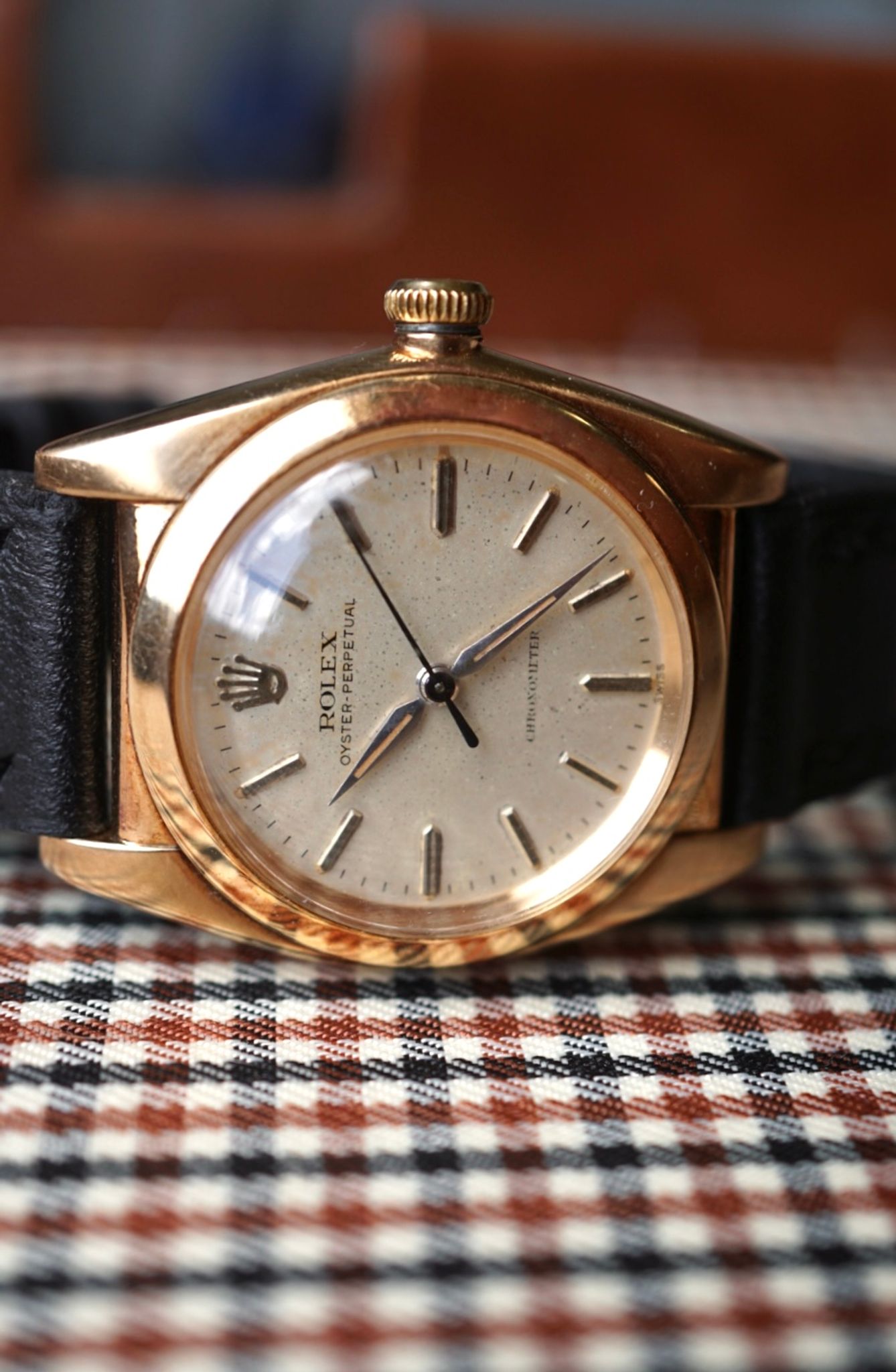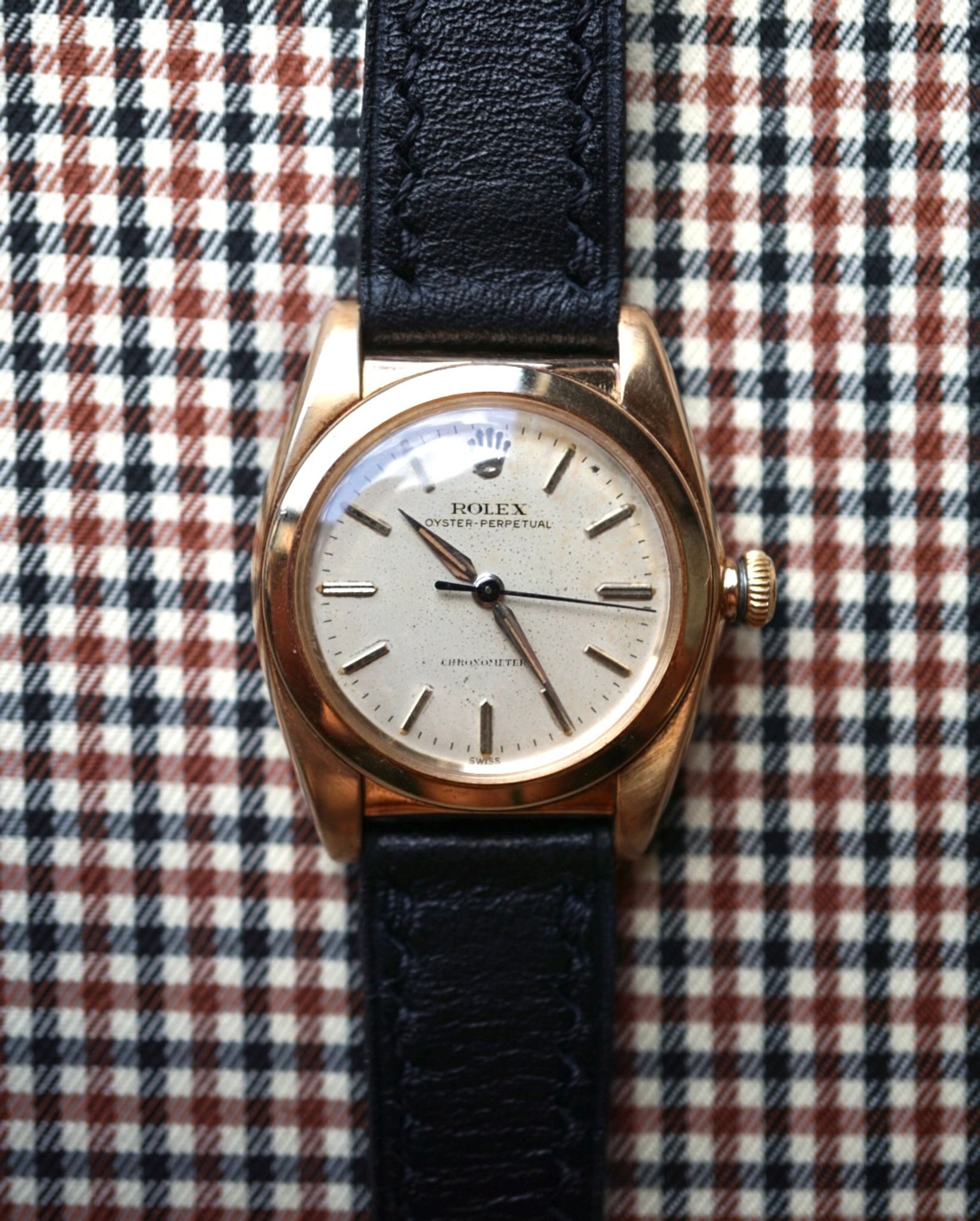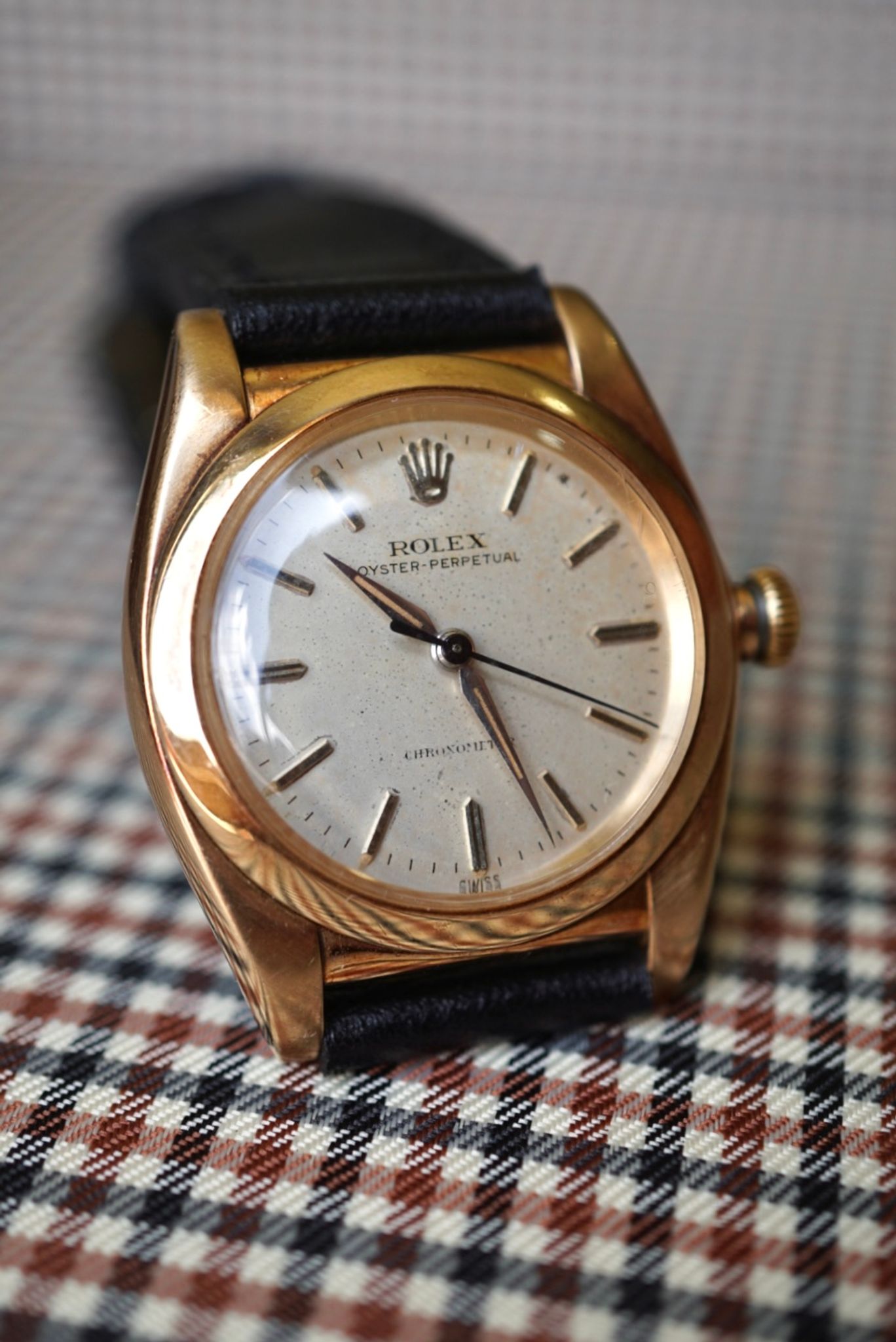 Beautiful bubble-back case with a very well-preserved dial, thick case, and original radium on the dial and hands. I have grown very fond of these 32 mm cases, they fit perfectly and are incredibly elegant.
