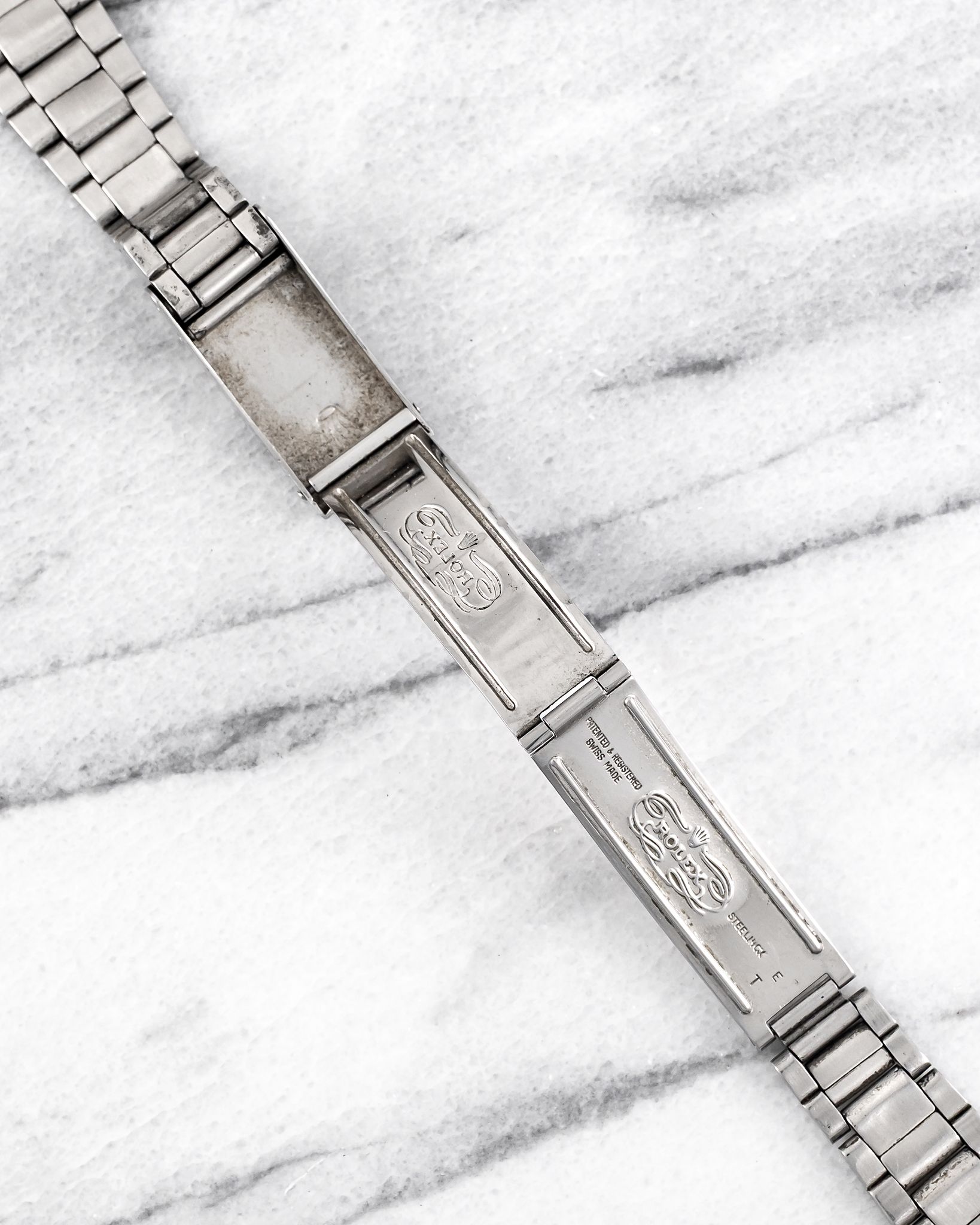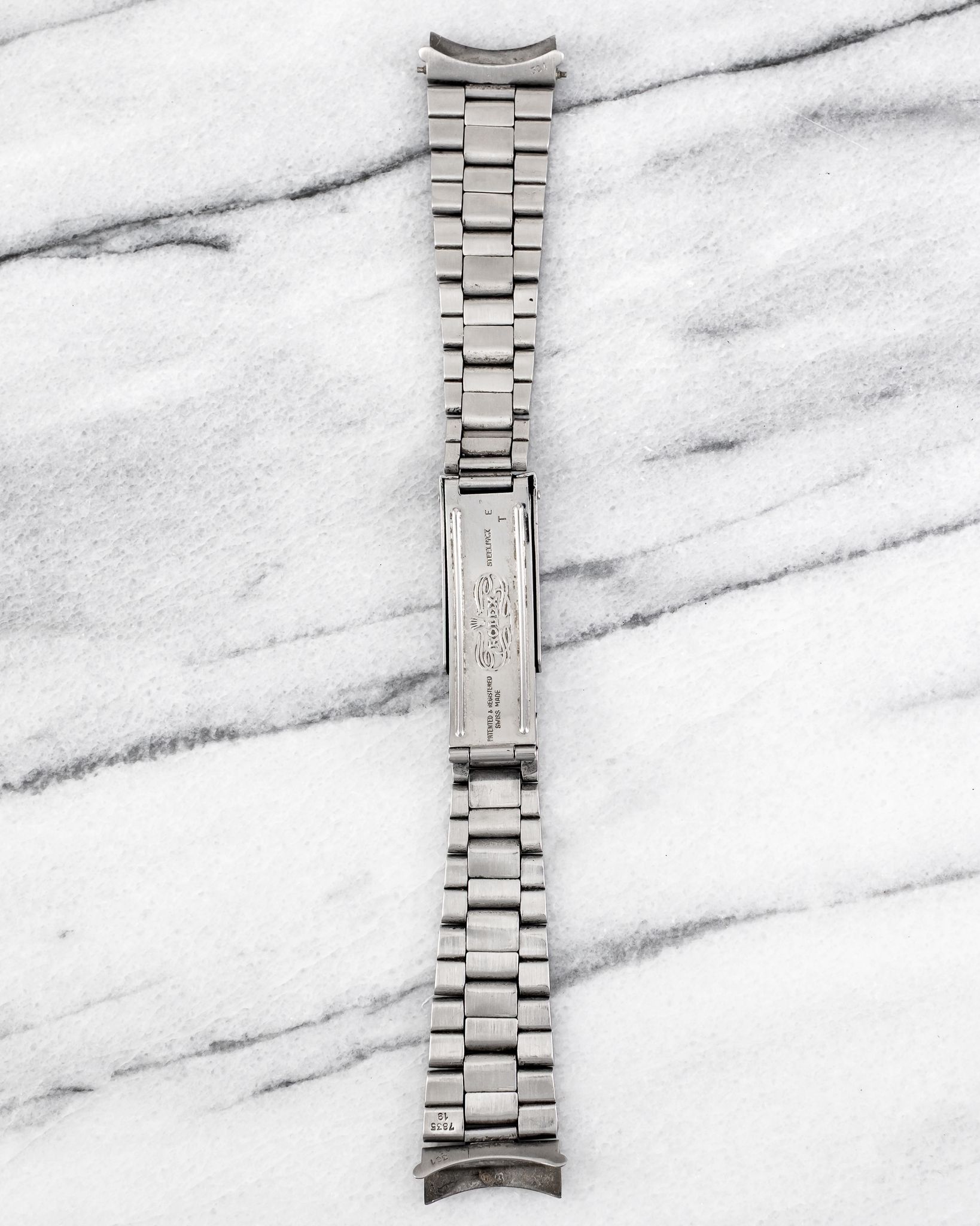 Here's a vintage Rolex rivet Oyster bracelet from 1970 with 19mm lug width. Constructed in stainless steel with a brushed finish and classic rivet side 57 links. The clasp is signed and dated 66. This bracelet was designed to fit vintage models like the Rolex Oysterdate Precision, reference 1500, and air king 5500 reference. Fits up to a 7 inch wrist. Some light stretch from age, but overall well-preserved for its age. All parts are original including the clasp, links, and endpieces