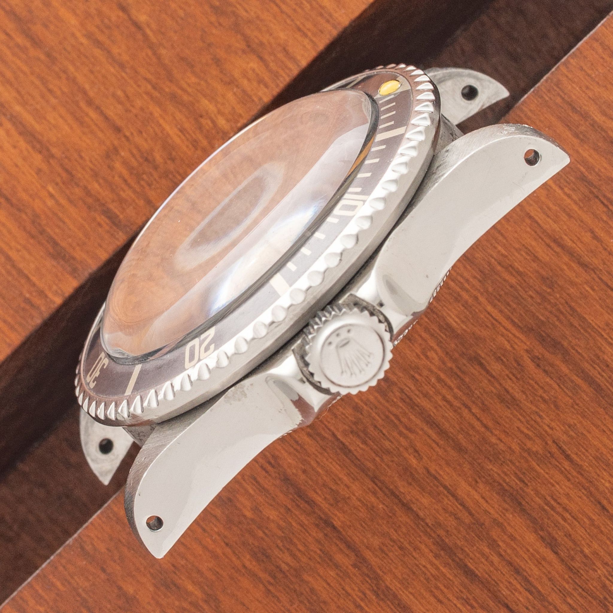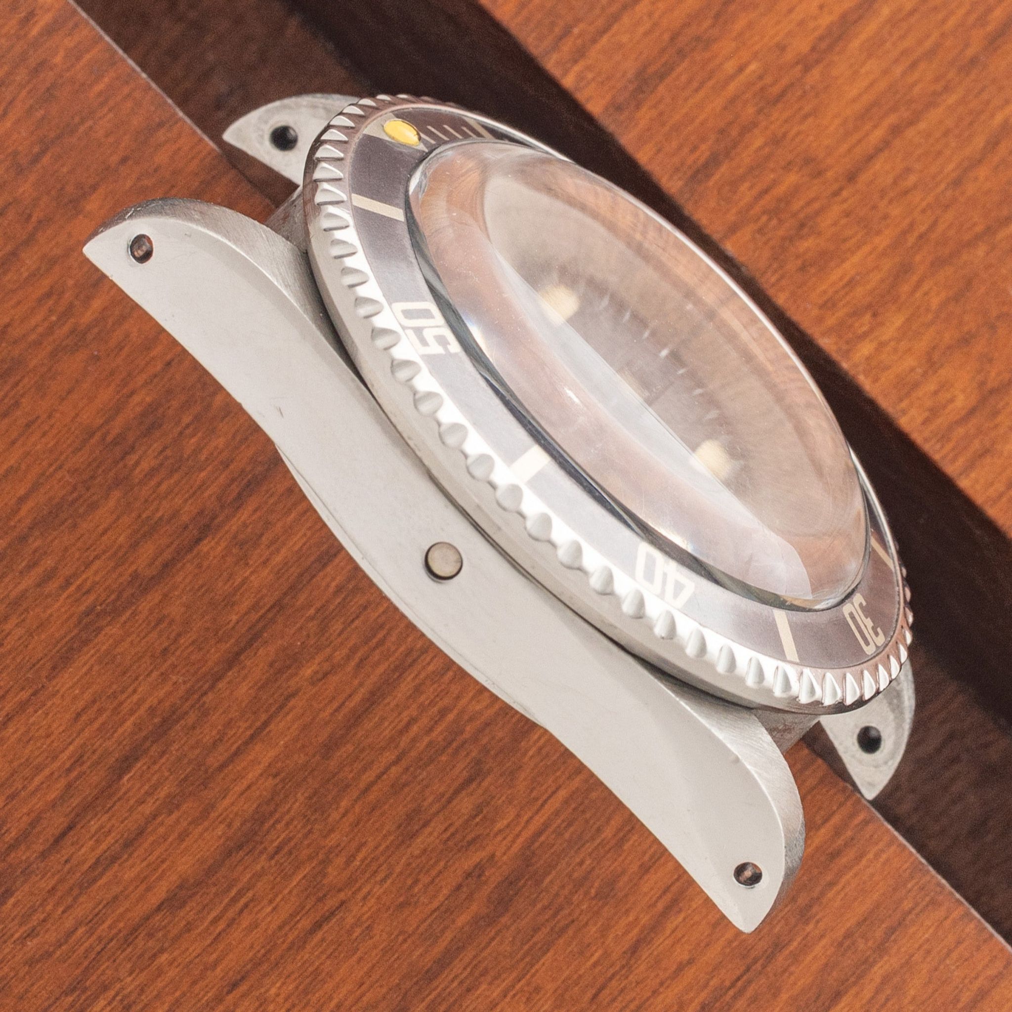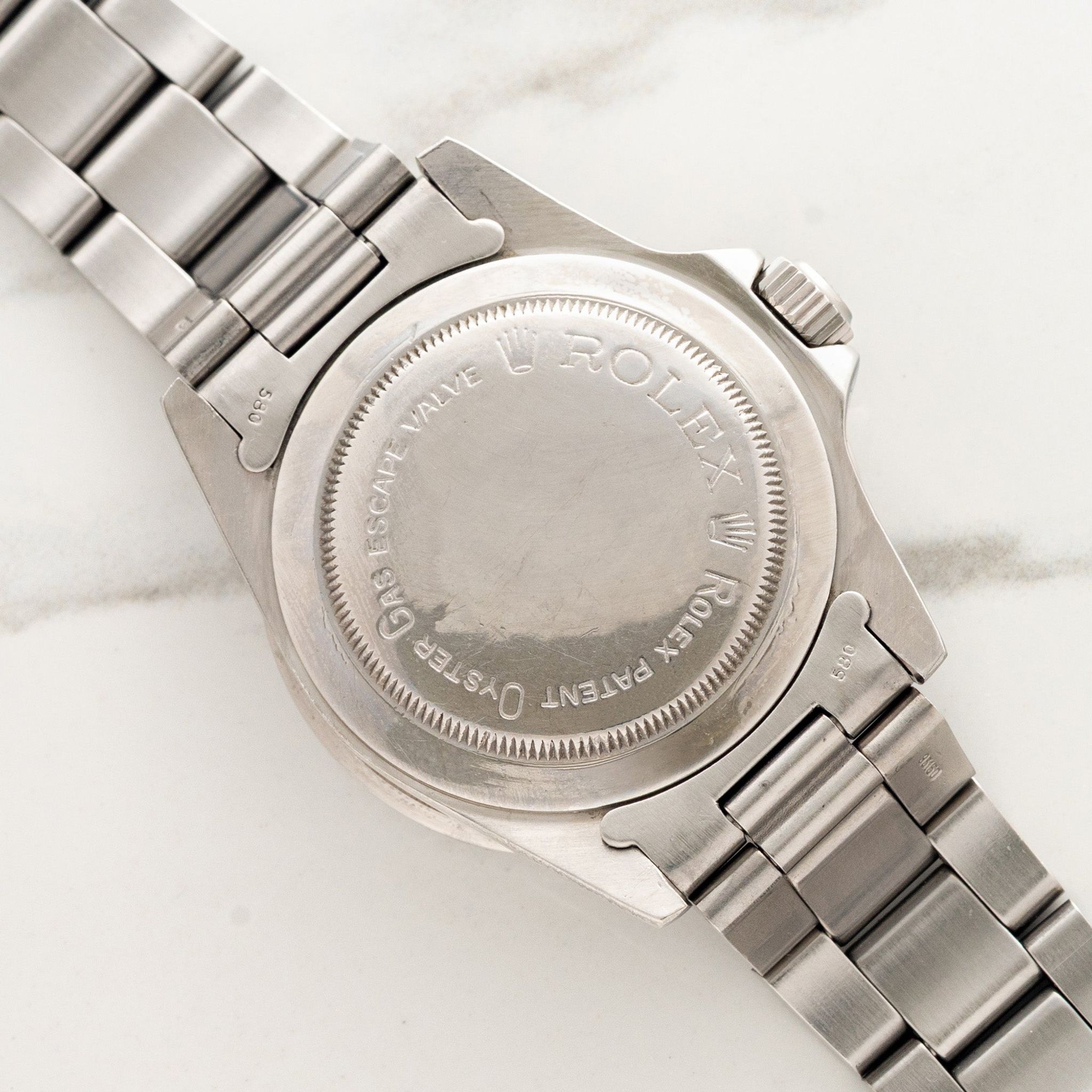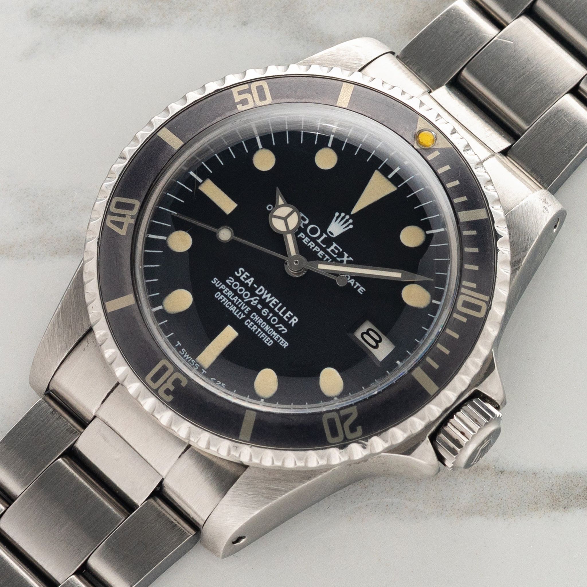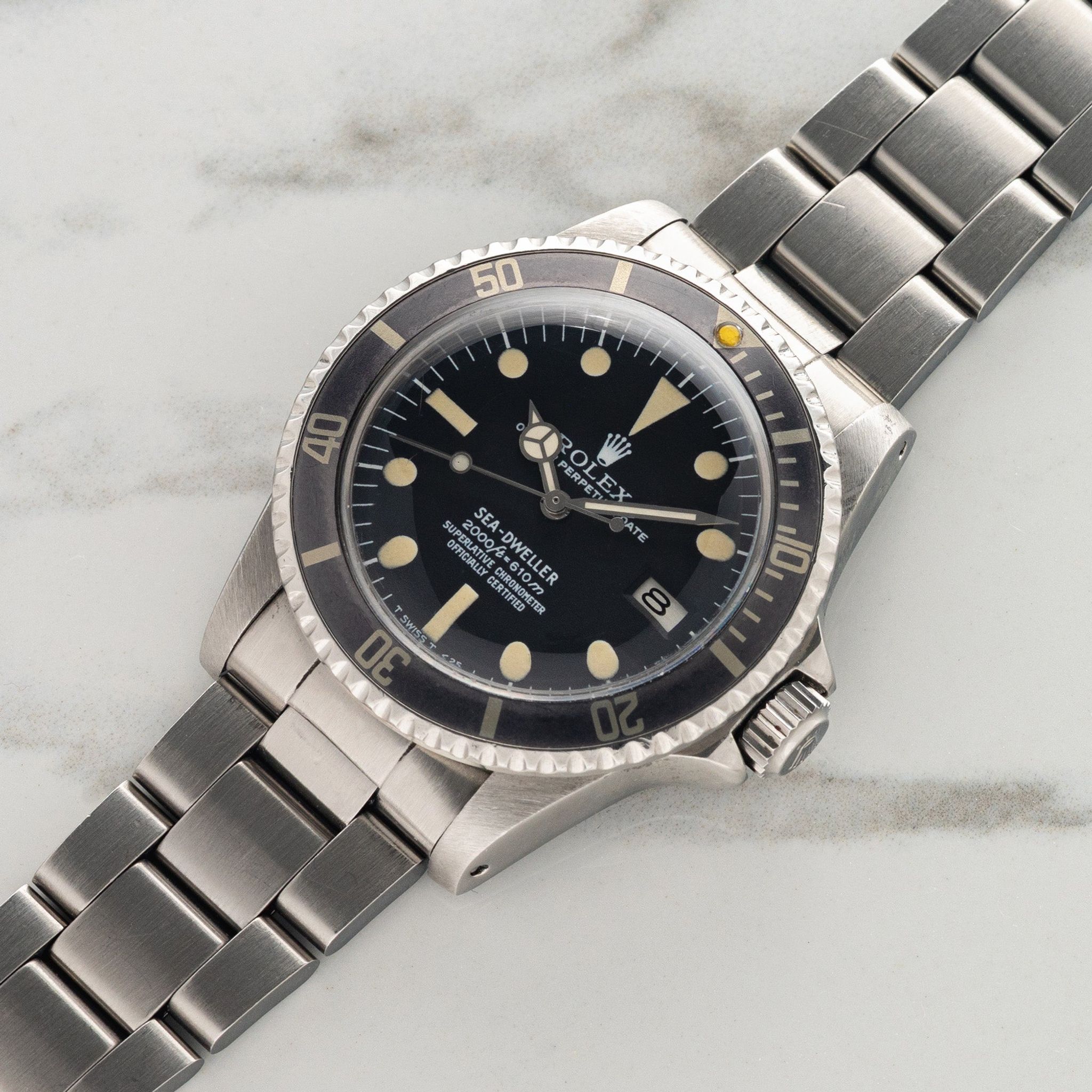 This example with 578X serial is circa 1979 and houses a rare and collectible "rail" dial. Some scholars estimate fewer than 1,000 were produced with this dial from '77 to '79 which is distinguished by the perfect alignment of its "Superlative Chronometer" and "Officially Certified" text. Remaining in excellent vintage condition, this piece boasts a mint dial with attractive cream patina, matching the hands and pip nicely. The insert has "ghosted" to a stunning grey with faint hits of blue and the case has seen some polishing in the past but retains thick and evenly proportioned lugs. The correct "VC" dated bracelet retains 11 links, shows light stretch and will fit an approximate 7.25 inch wrist. If you've been looking for a no-frills and near bomb proof tool watch that's not as commonly seen, this particular Sea Dweller has all the bells and whistles one could hope for.