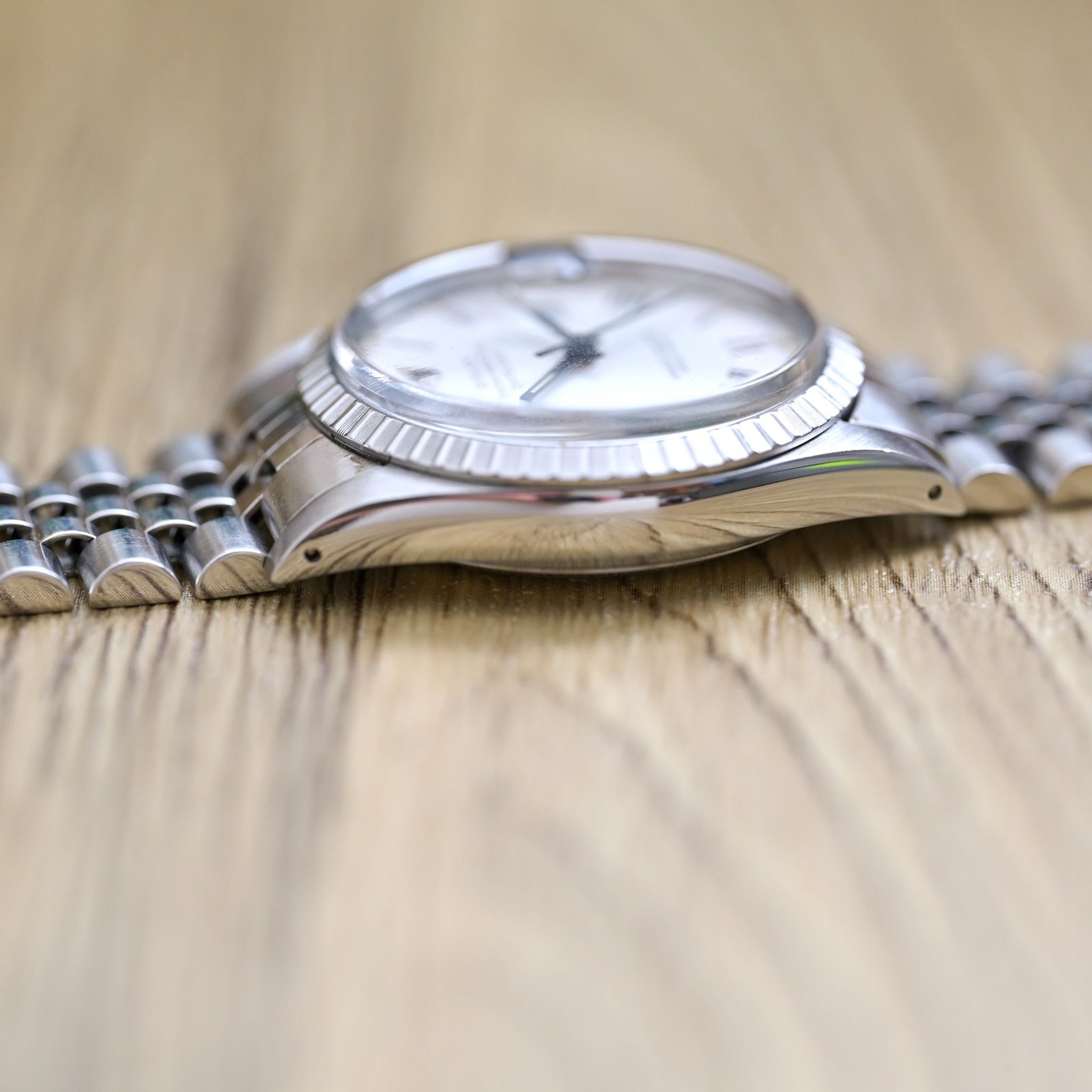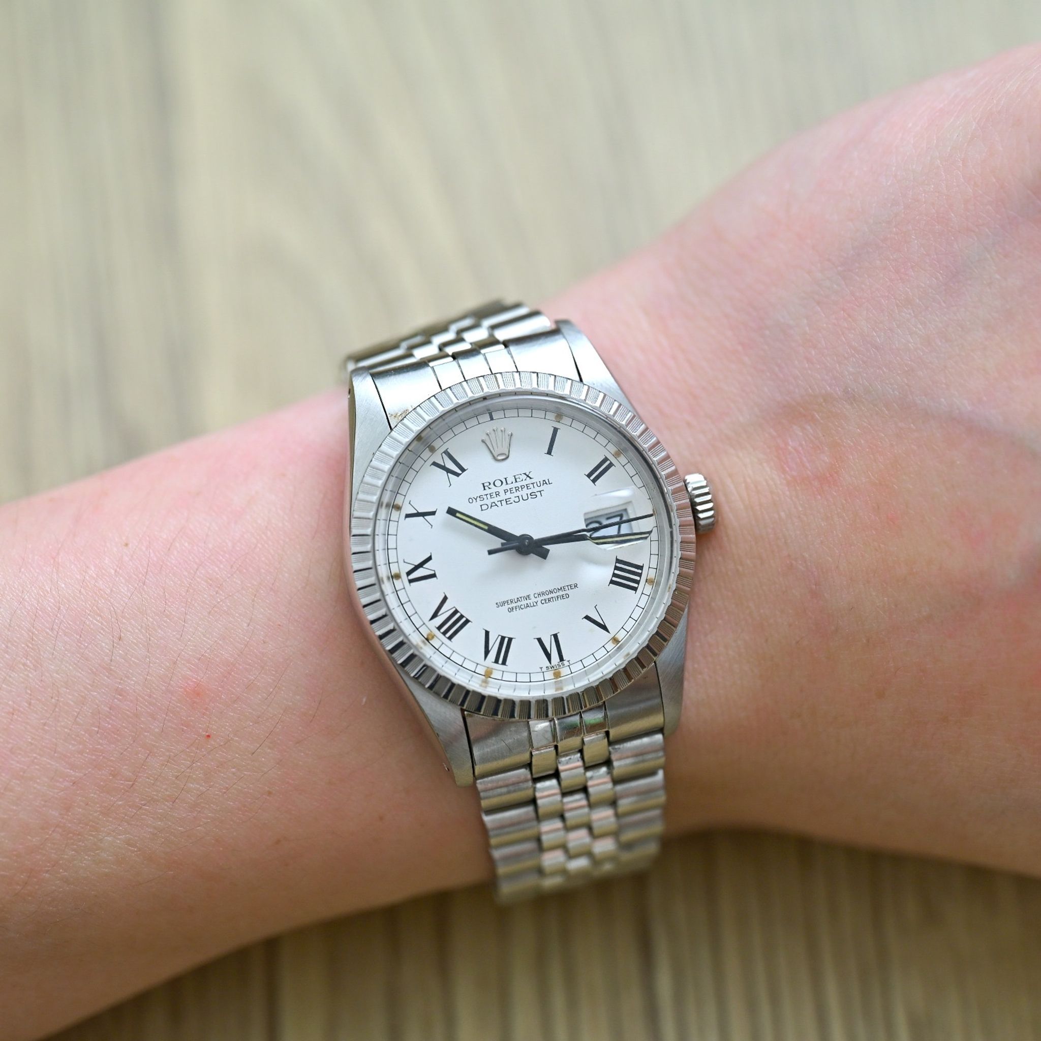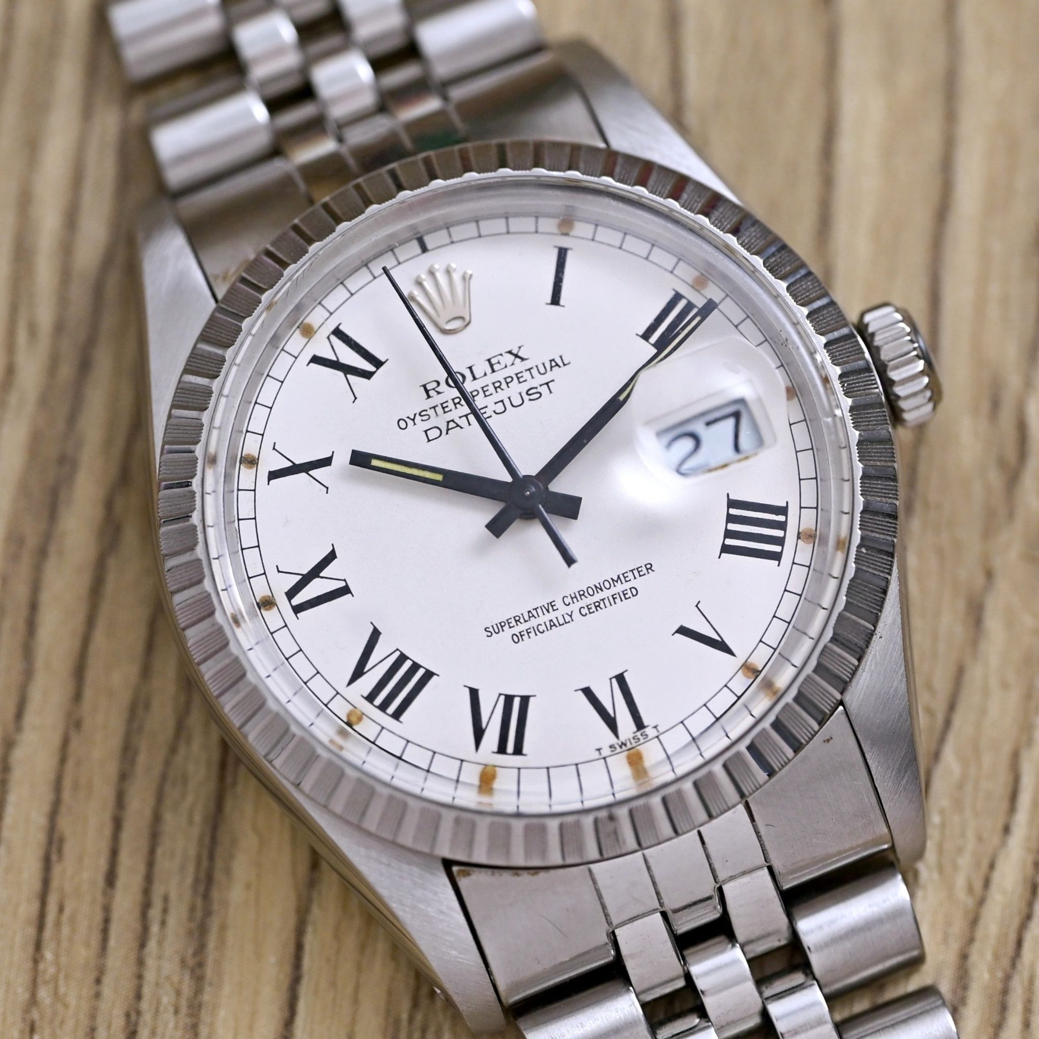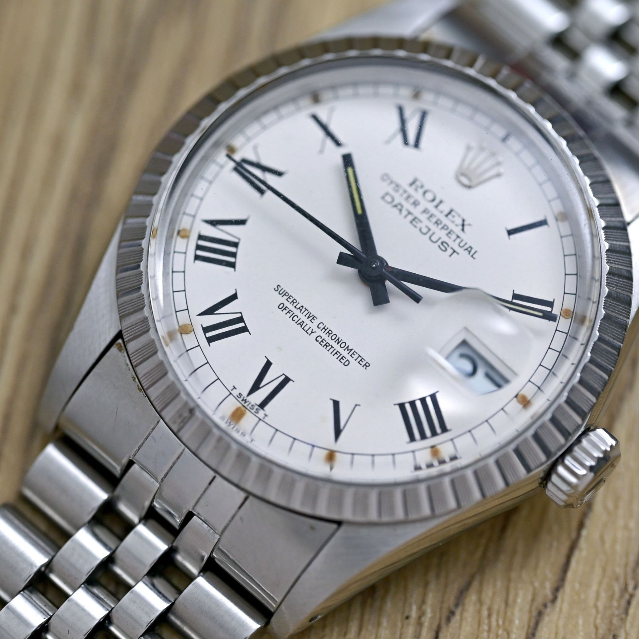 Dial: features a distinctive white Buckley dial, characterized by its elegant black Roman numeral indexes and matching hands. The aged lumes adds unique charm and character, making it a standout piece for any watch enthusiast.