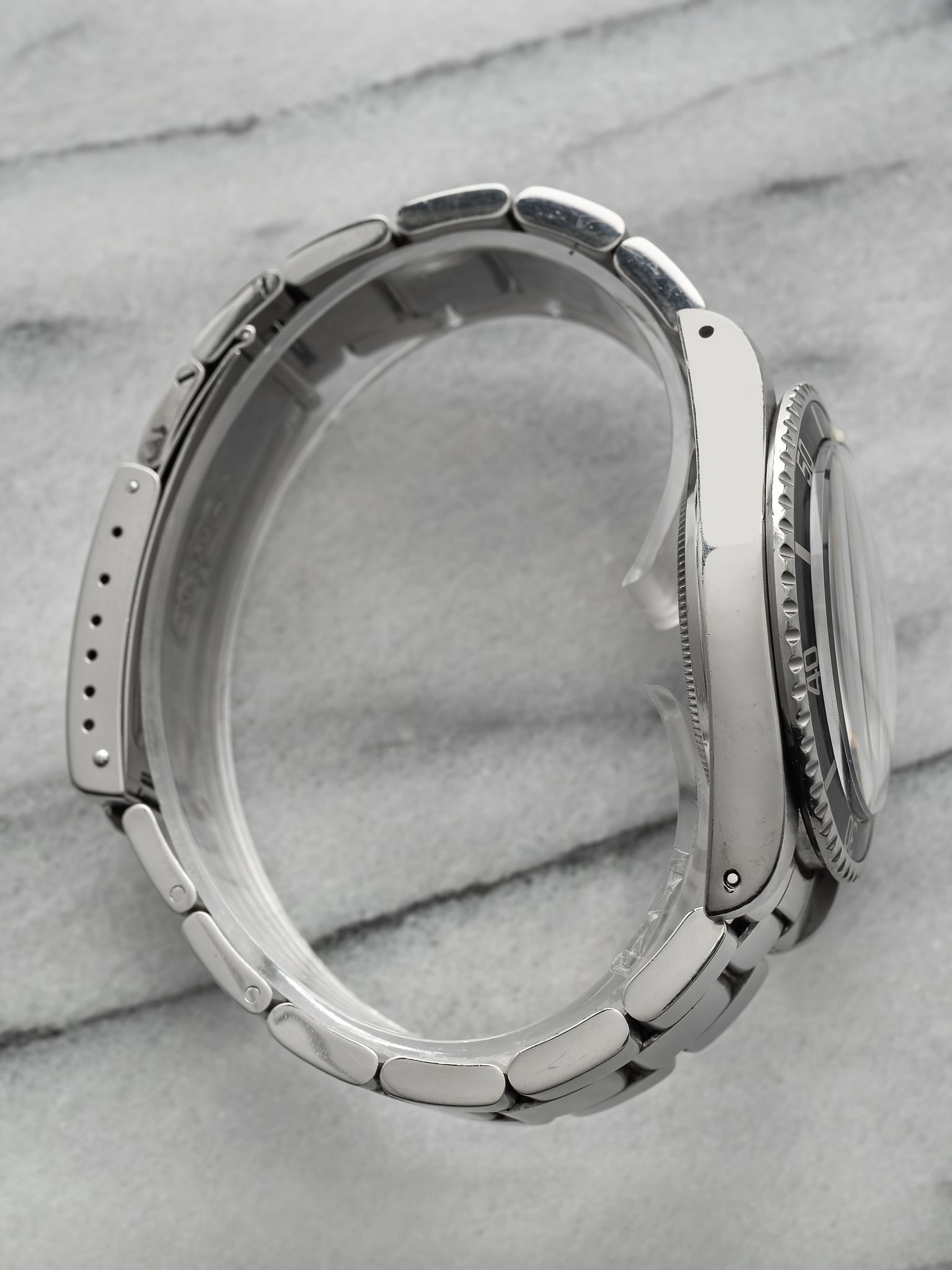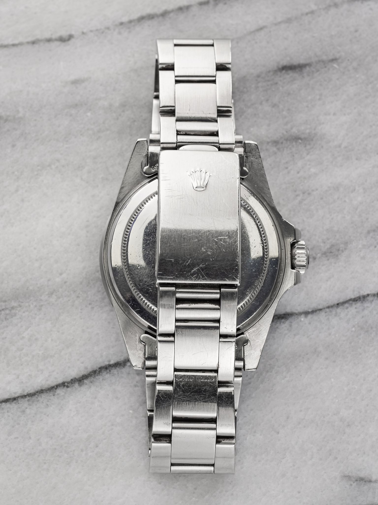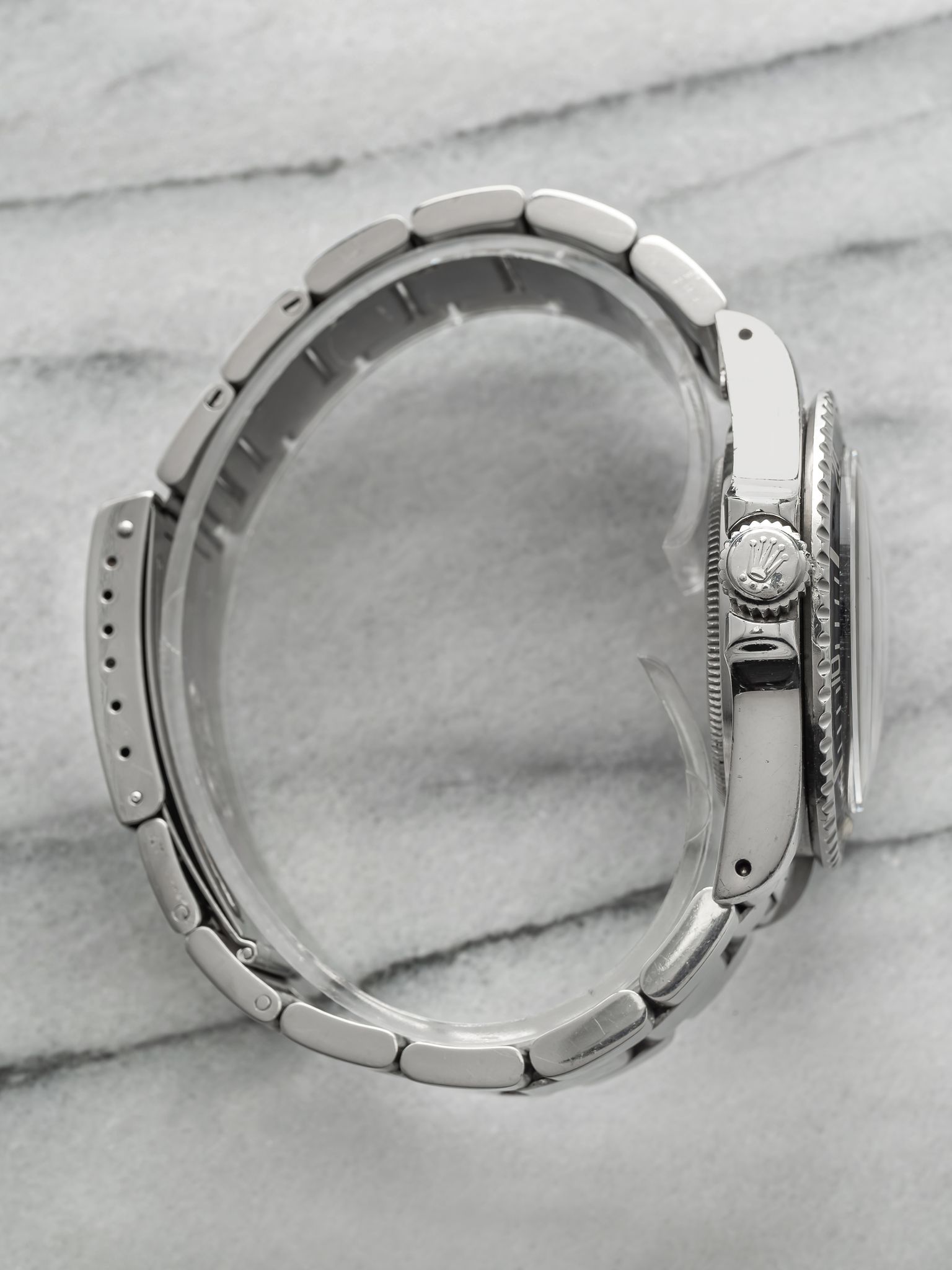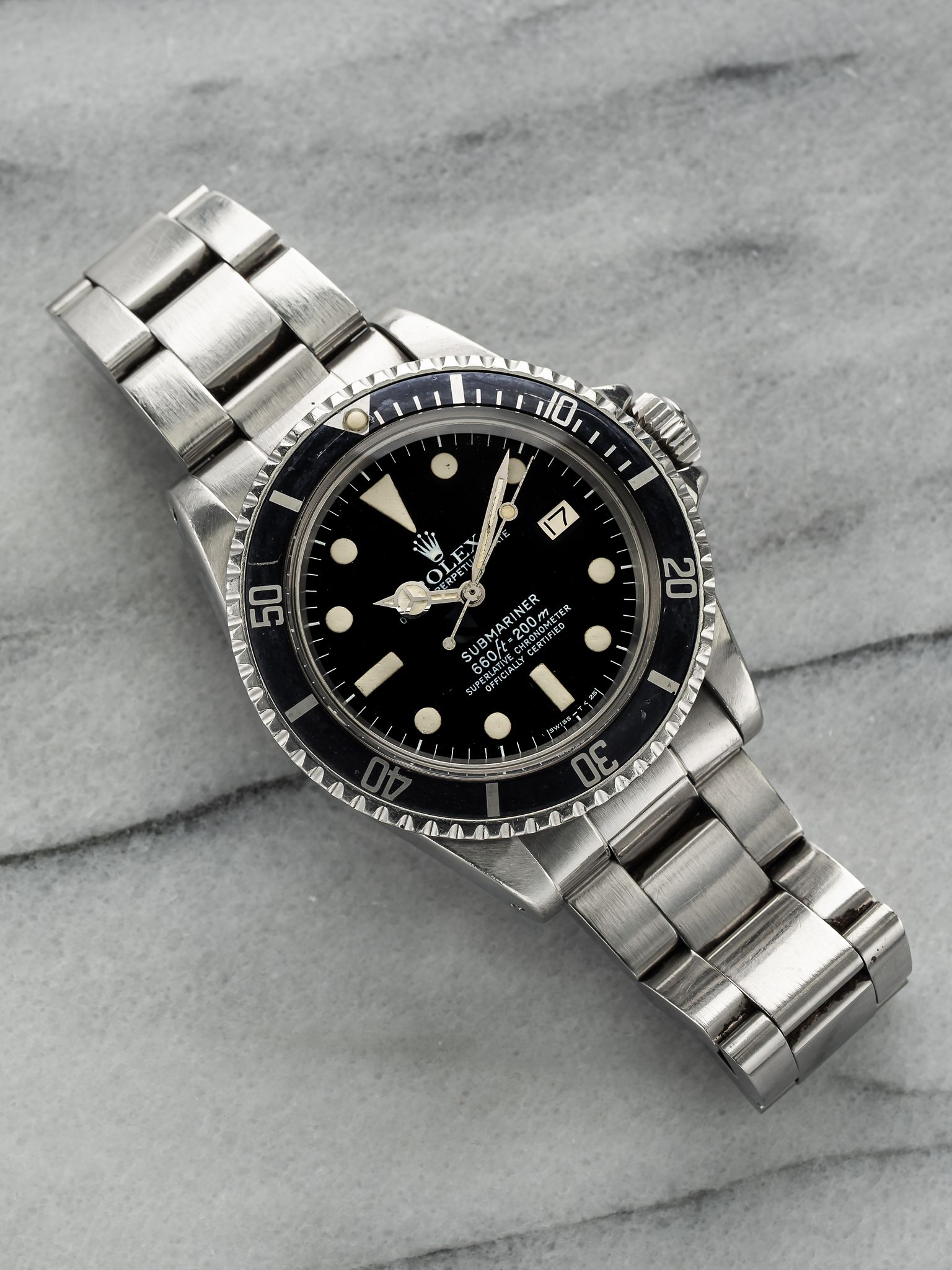 Here's a Rolex Submariner reference 1680 automatic with a black dial and tritium hour markers from the 1970-1980s. Measurements include a 40mm steel case and 20mm lug width. The lume has aged to a uniform patina. The bracelet fits up to a 7 inch wrist. Ready to wear!