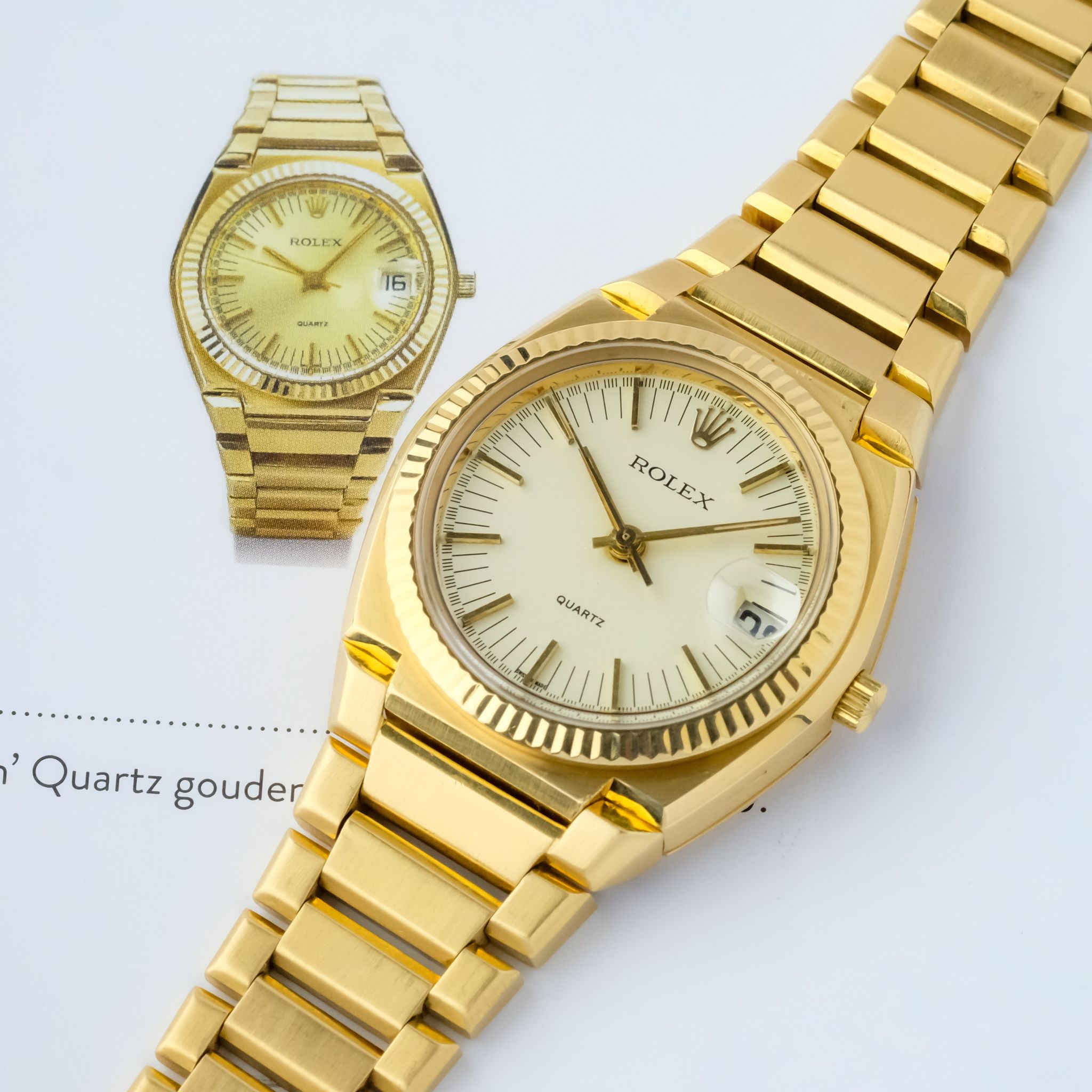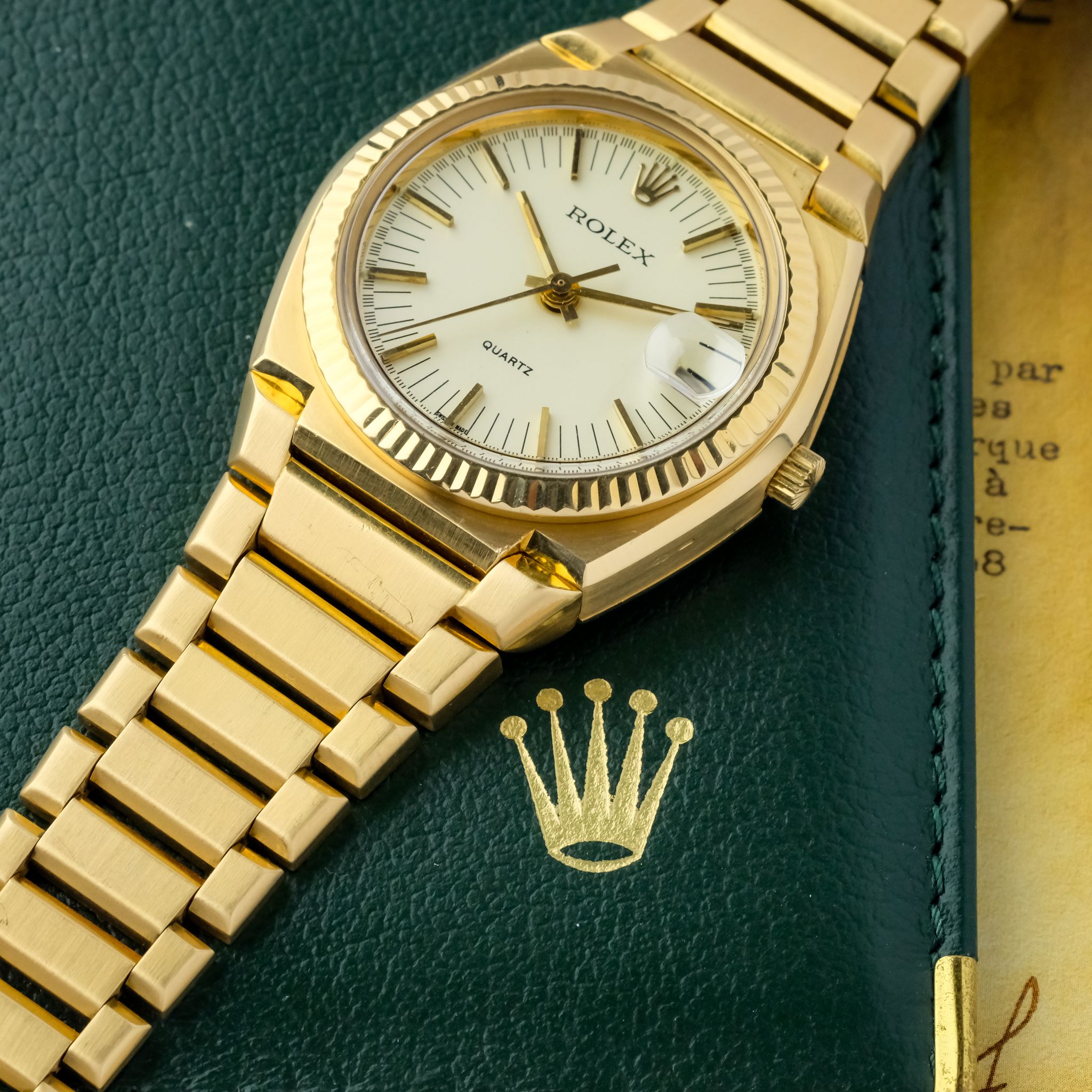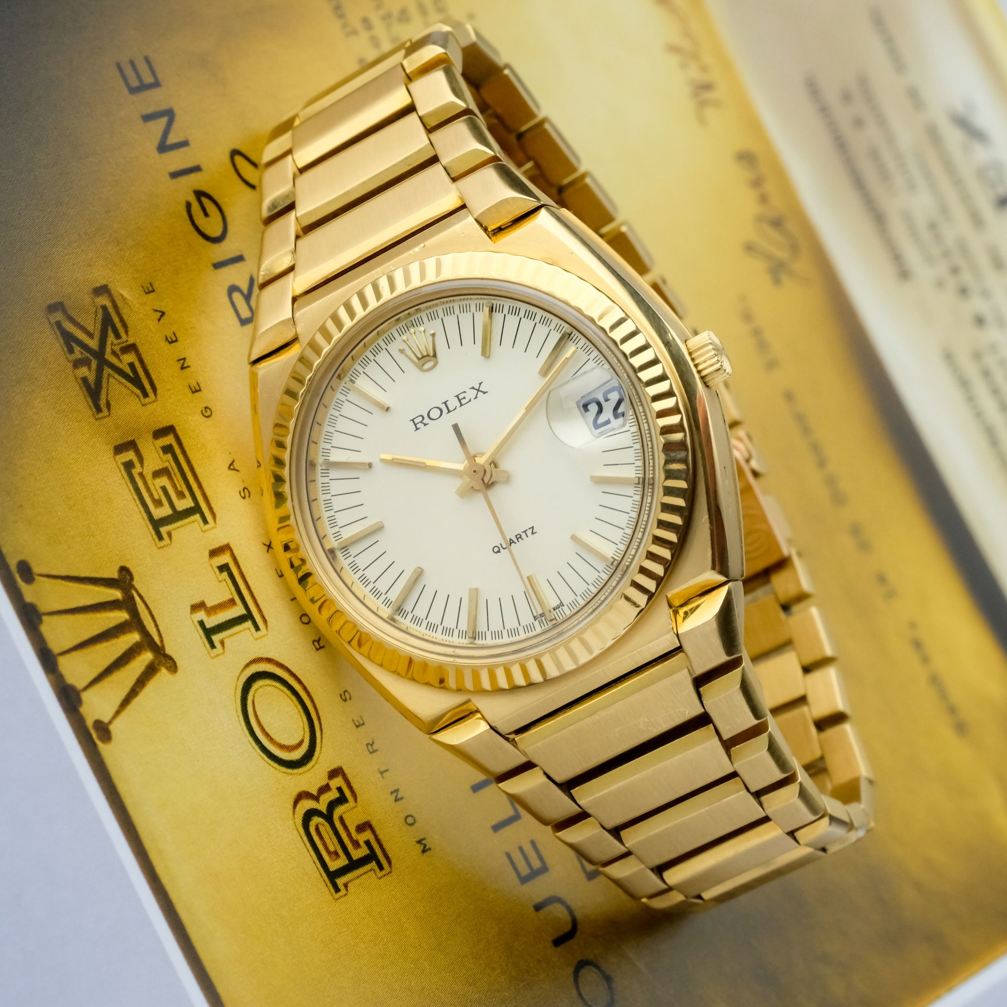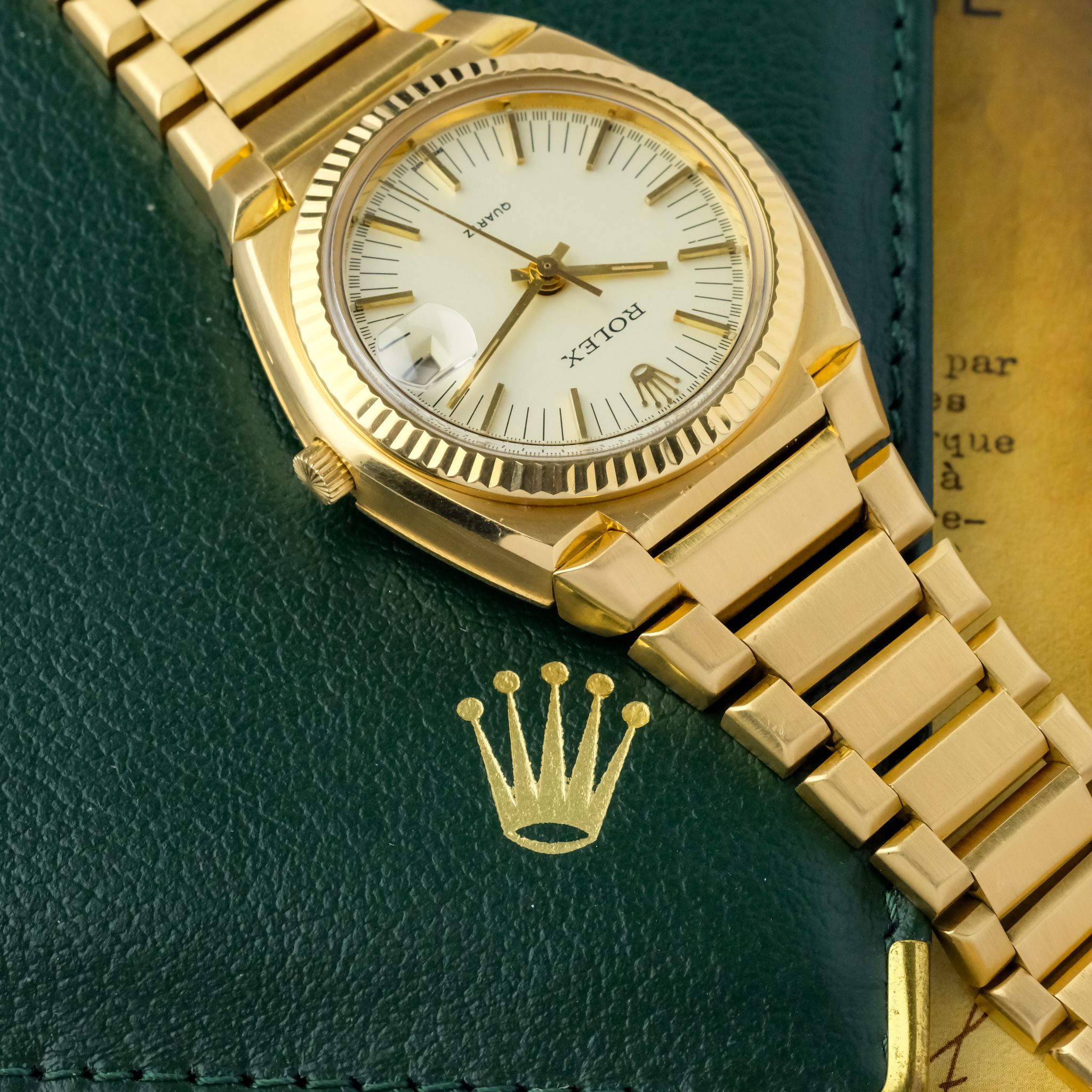 The Rolex Ref. 5100, known as the “Texano”, is one of the most historically important and visually striking watches ever produced by Rolex. Released in 1970, it was the brand’s very first quartz-powered model, equipped with the Beta 21 movement, developed jointly by a Swiss consortium of top manufacturers. Housed in a bold, angular case with integrated bracelet, the Texano was made in extremely limited numbers and only in precious metals. This example, crafted from yellow gold, features the early and rare Single Logo clasp, adding further collector appeal. The watch is in good condition overall, with a strong case and clean dial, showing only light signs of age. As one of the most significant and unusual watches in Rolex history, the Ref. 5100 stands as a true collector’s piece from the golden age of Swiss innovation.