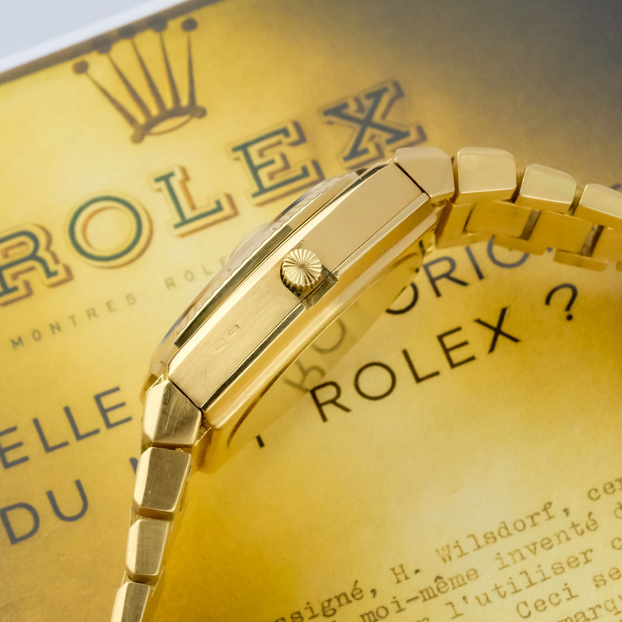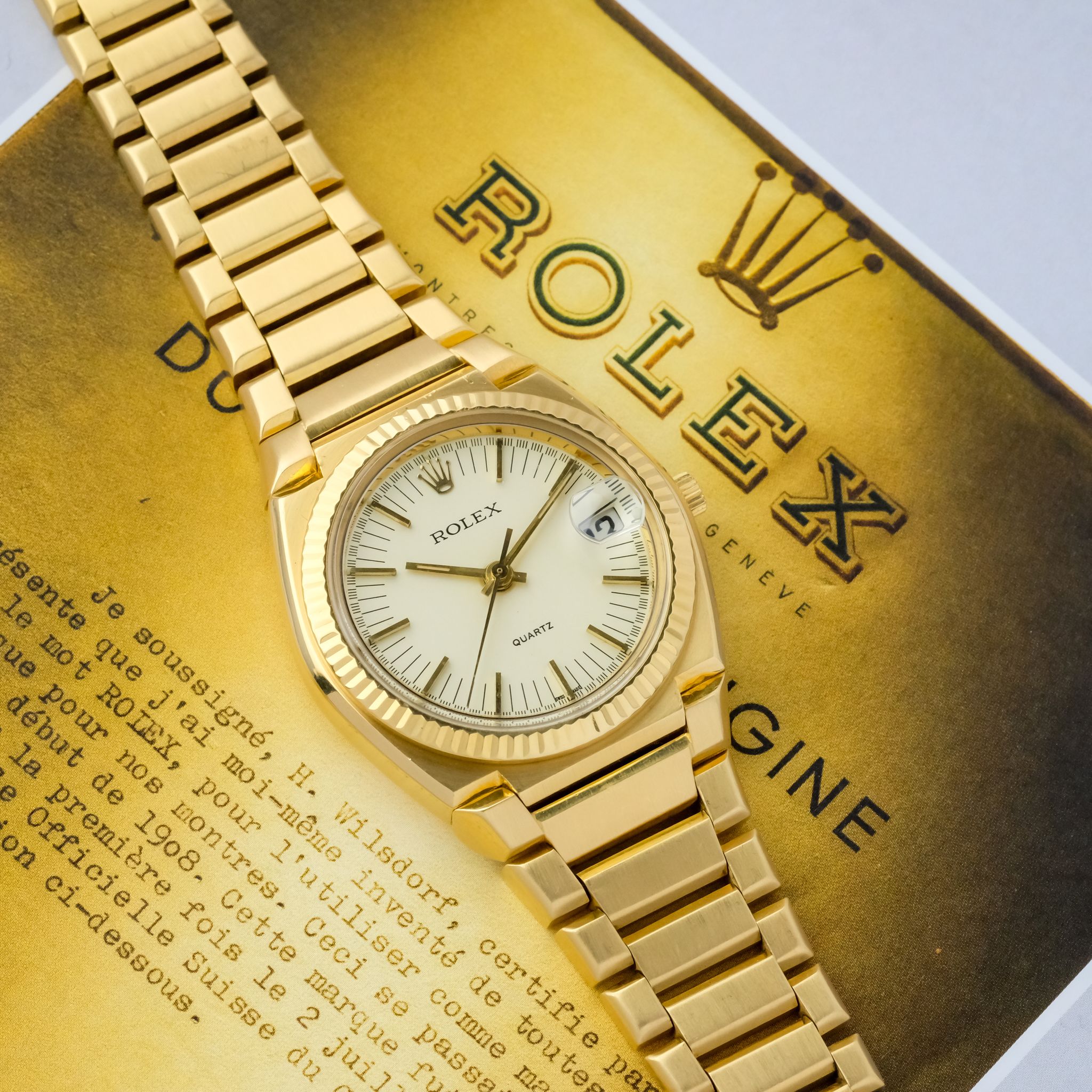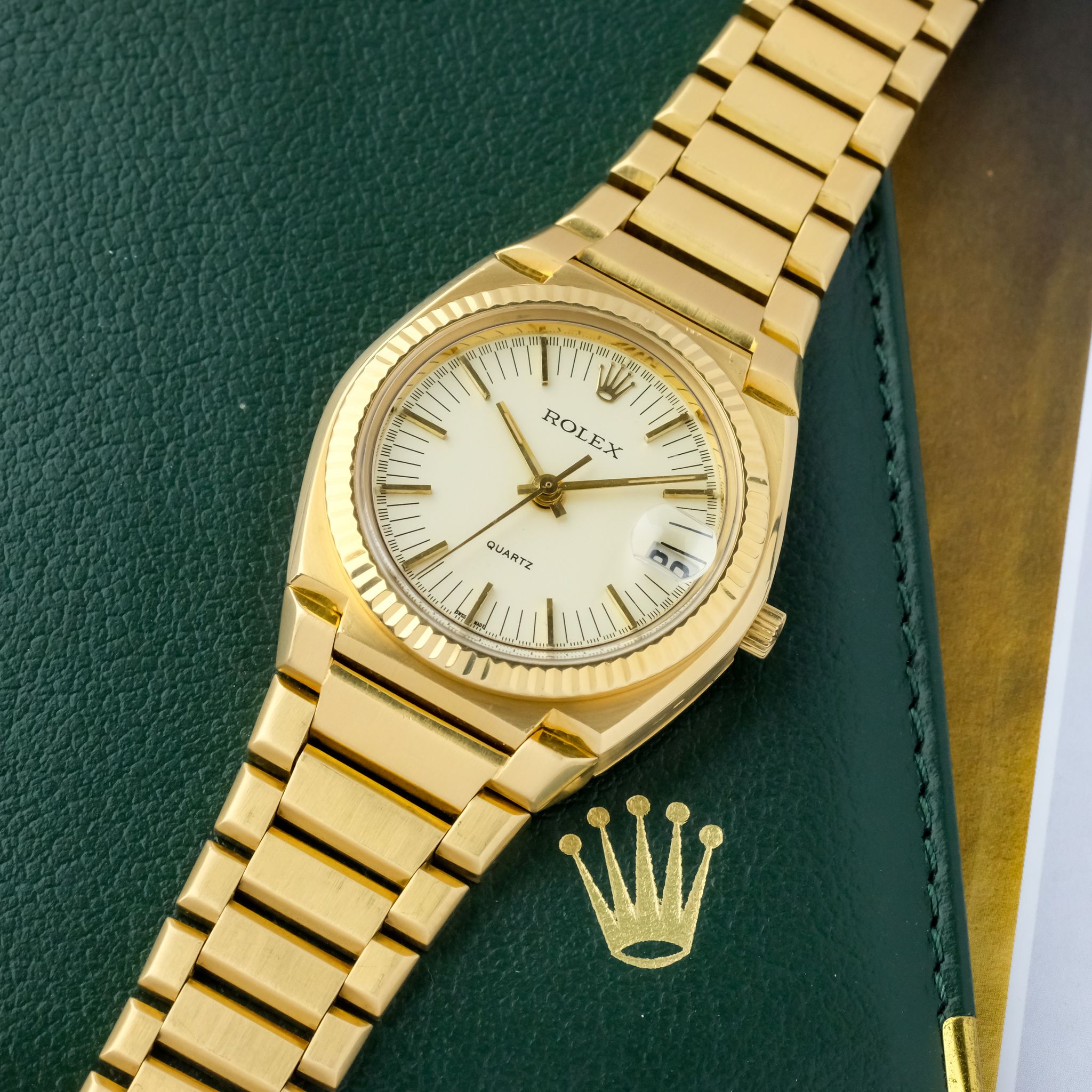 The Rolex Ref. 5100, known as the “Texano”, is one of the most historically important and visually striking watches ever produced by Rolex. Released in 1970, it was the brand’s very first quartz-powered model, equipped with the Beta 21 movement, developed jointly by a Swiss consortium of top manufacturers. Housed in a bold, angular case with integrated bracelet, the Texano was made in extremely limited numbers and only in precious metals. This example, crafted from yellow gold, features the early and rare Single Logo clasp, adding further collector appeal. The watch is in good condition overall, with a strong case and clean dial, showing only light signs of age. As one of the most significant and unusual watches in Rolex history, the Ref. 5100 stands as a true collector’s piece from the golden age of Swiss innovation.