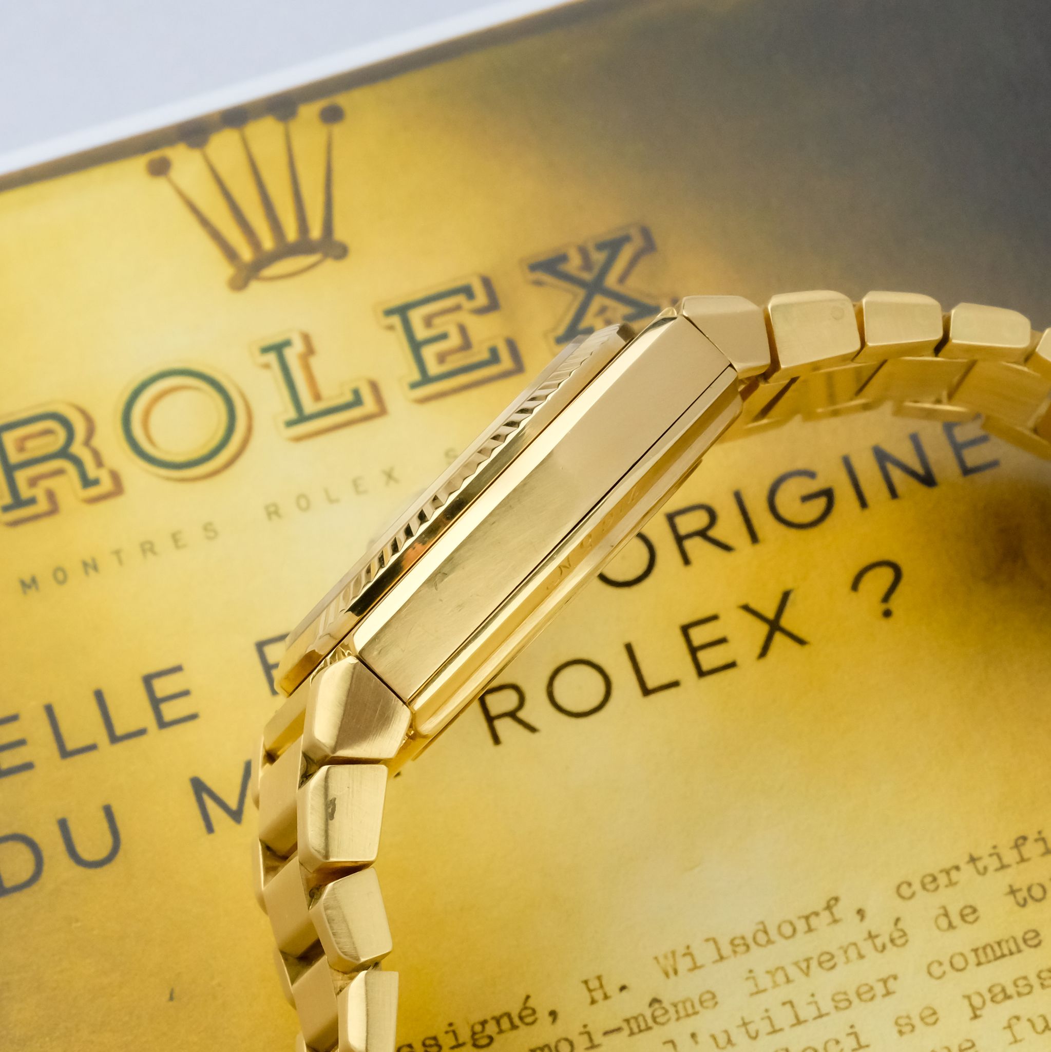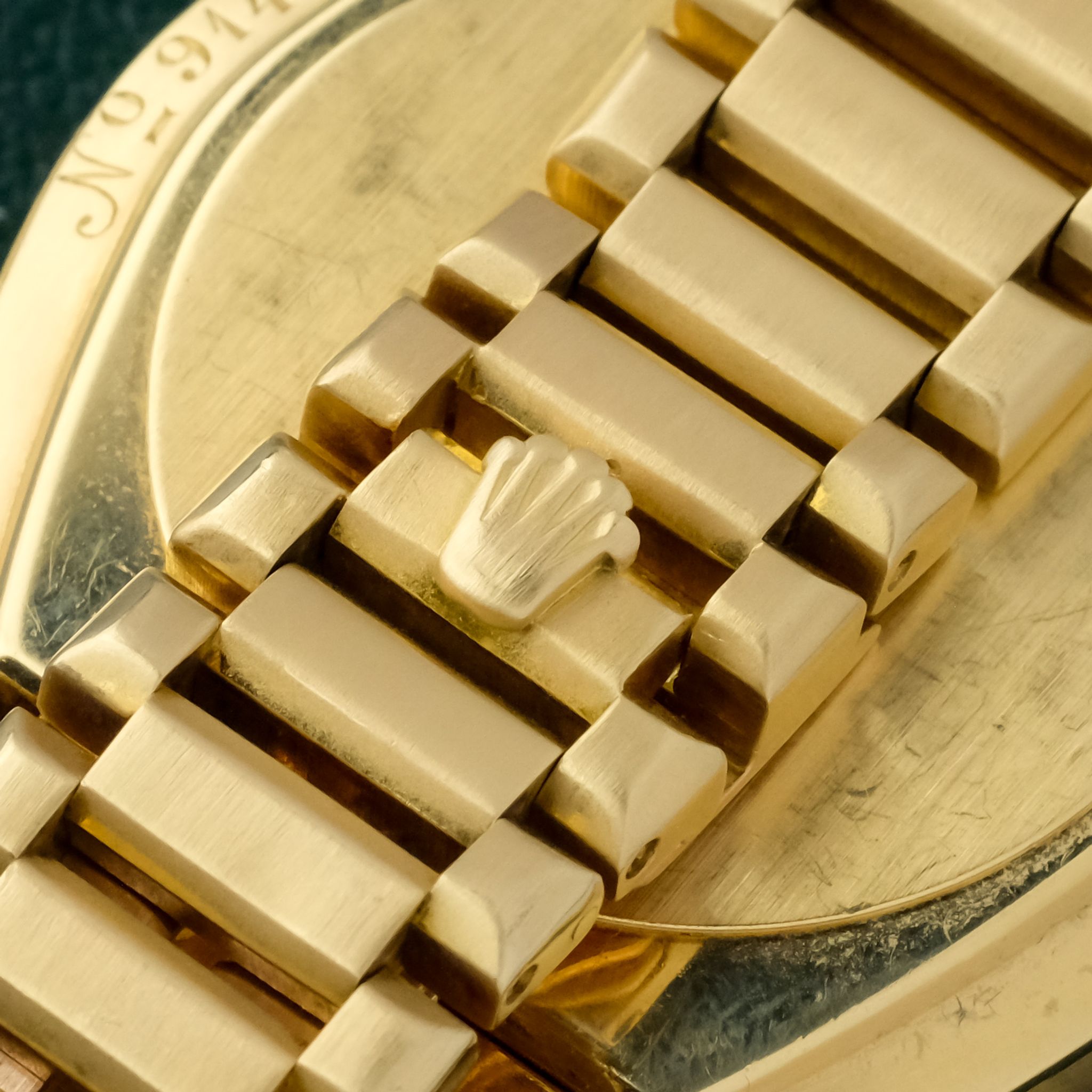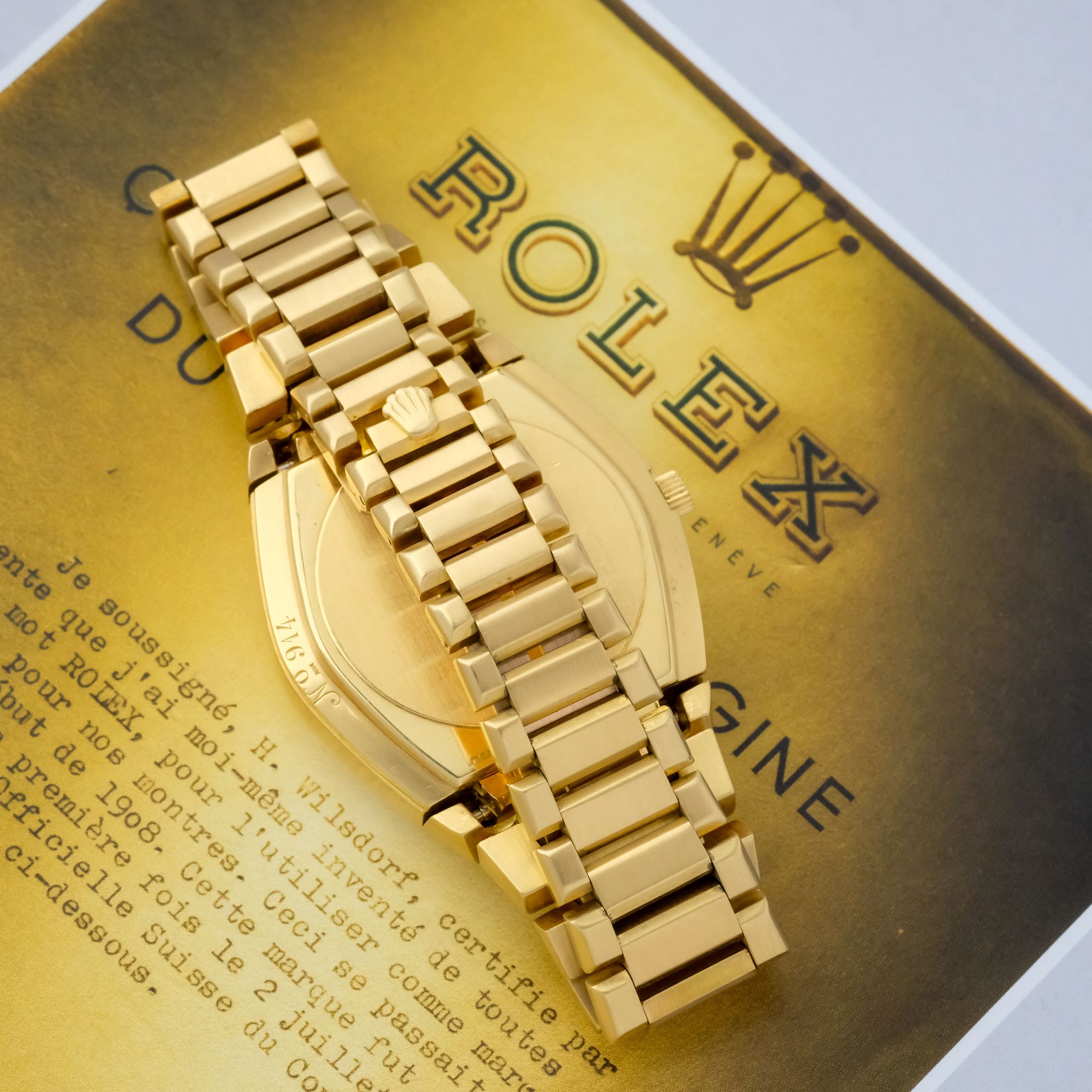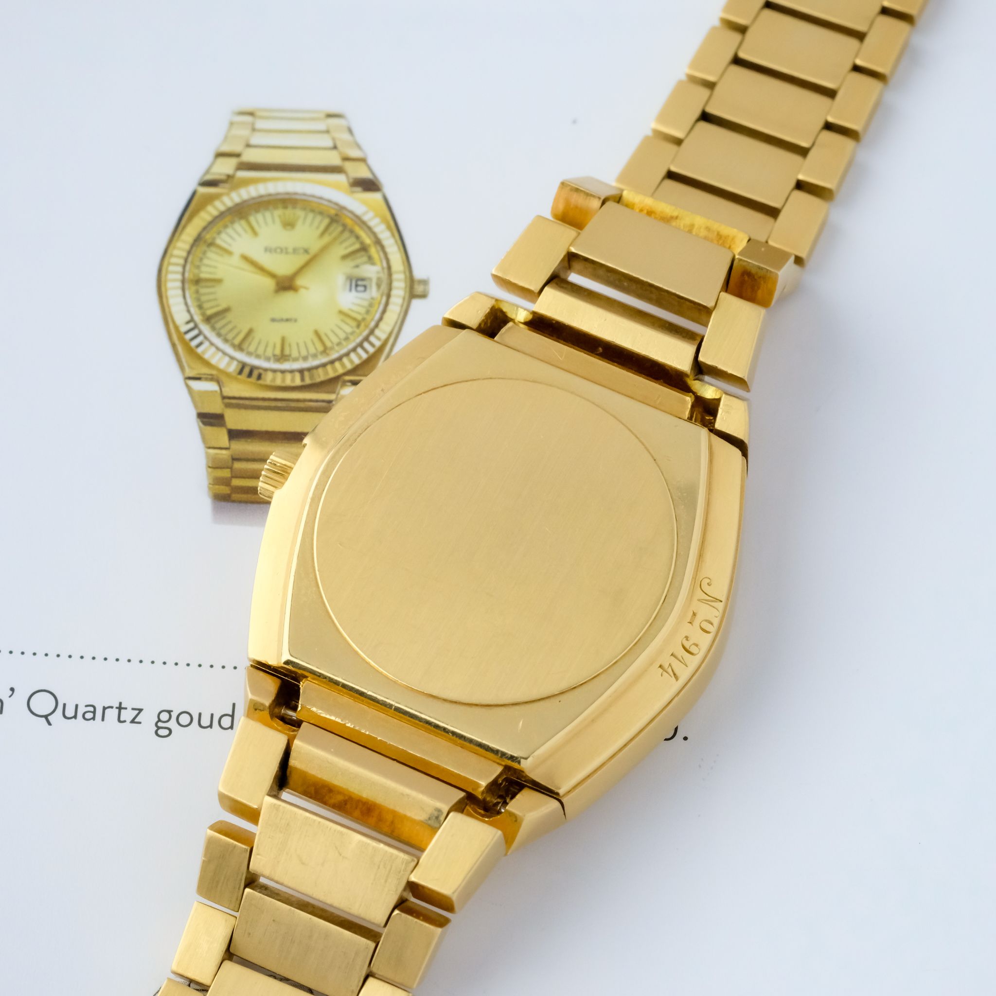 The Rolex Ref. 5100, known as the “Texano”, is one of the most historically important and visually striking watches ever produced by Rolex. Released in 1970, it was the brand’s very first quartz-powered model, equipped with the Beta 21 movement, developed jointly by a Swiss consortium of top manufacturers. Housed in a bold, angular case with integrated bracelet, the Texano was made in extremely limited numbers and only in precious metals. This example, crafted from yellow gold, features the early and rare Single Logo clasp, adding further collector appeal. The watch is in good condition overall, with a strong case and clean dial, showing only light signs of age. As one of the most significant and unusual watches in Rolex history, the Ref. 5100 stands as a true collector’s piece from the golden age of Swiss innovation.