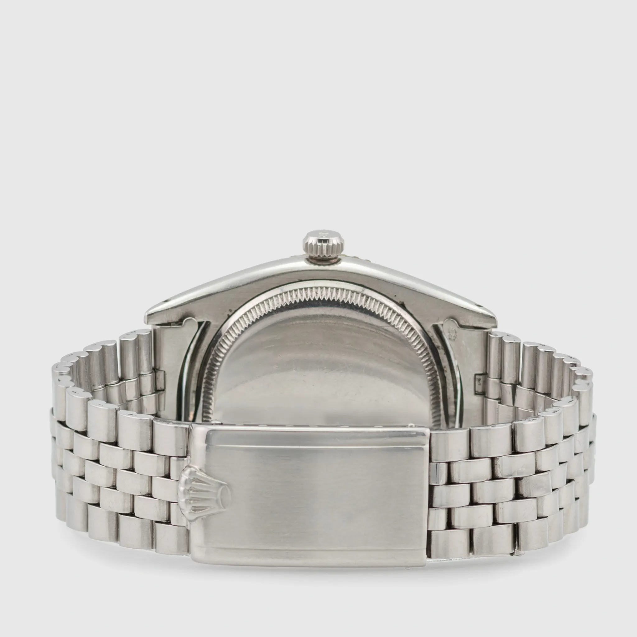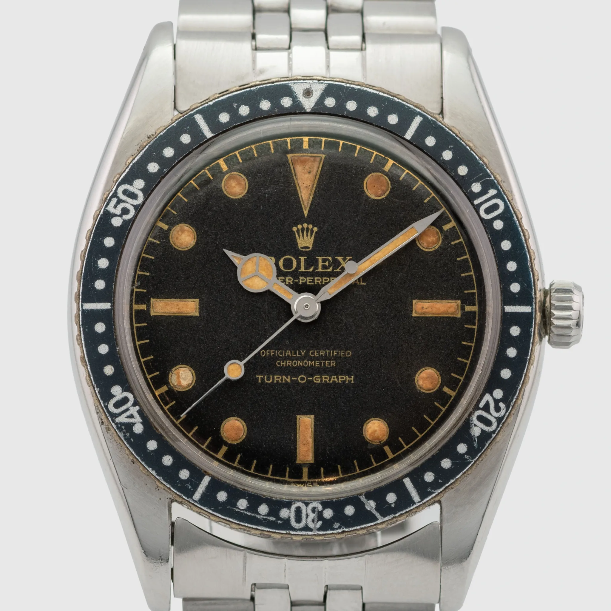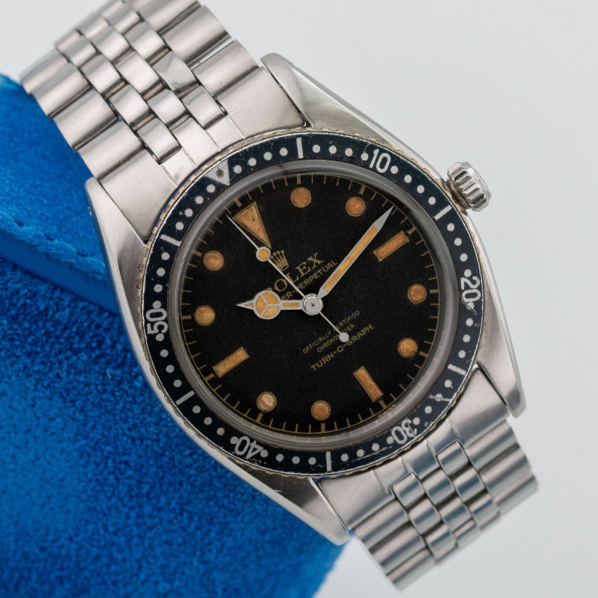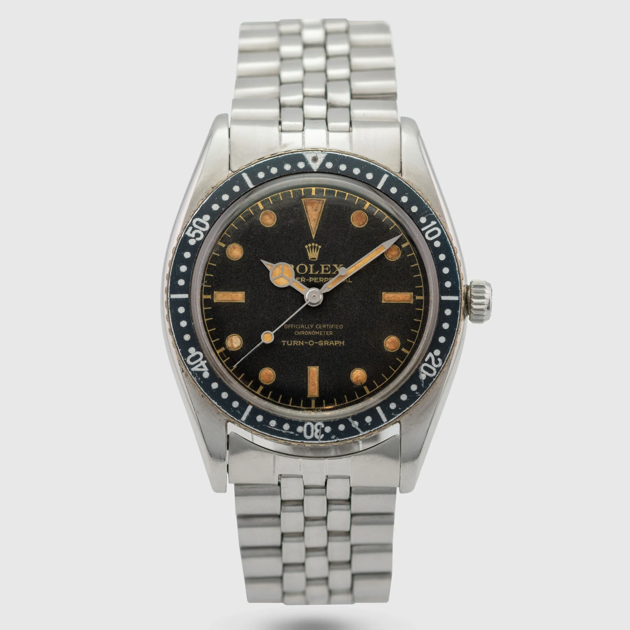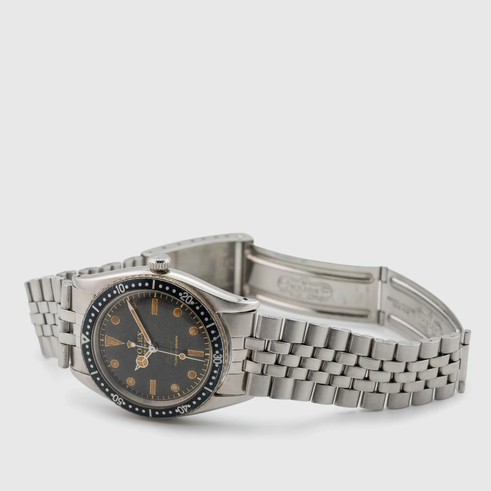 The Rolex 6202 is a vintage model that holds significant importance in the history of Rolex dive watches. Released in the early 1950s, it is commonly referred to as the Rolex Turn-O-Graph. The Rolex 6202 was one of the first Rolex watches to feature a rotating bezel, designed to measure time intervals, especially useful for divers. It is powered by the A260 automatic movement, one of Rolex’s earlier automatic movements which stood for robustness and reliability. It came in a 36mm stainless steel case, which was relatively large for the 1950s but now considered modest by modern standards. The Rolex 6202 is often seen as a precursor to the Rolex Submariner, which was introduced in 1953. The rotating bezel concept that became a hallmark of the Submariner was first experimented on with this model. This 6202 is retained in very nice vintage condition with a case that has been loved and worn and is showing wear from almost 70 years of age. The lugs still remain straight and even. The bezel, for the age is still in unblemished and nice condition, the crown with Brevete cross still present. The black gilt dial has completely and consistently matted out and bears very crisp graphics that are fully intact. The radium luminous is fully present apart from the 8 o’ clock marker where it has deteriorated. The watch is fitted to a later Jubilee bracelet showing some wear from age.