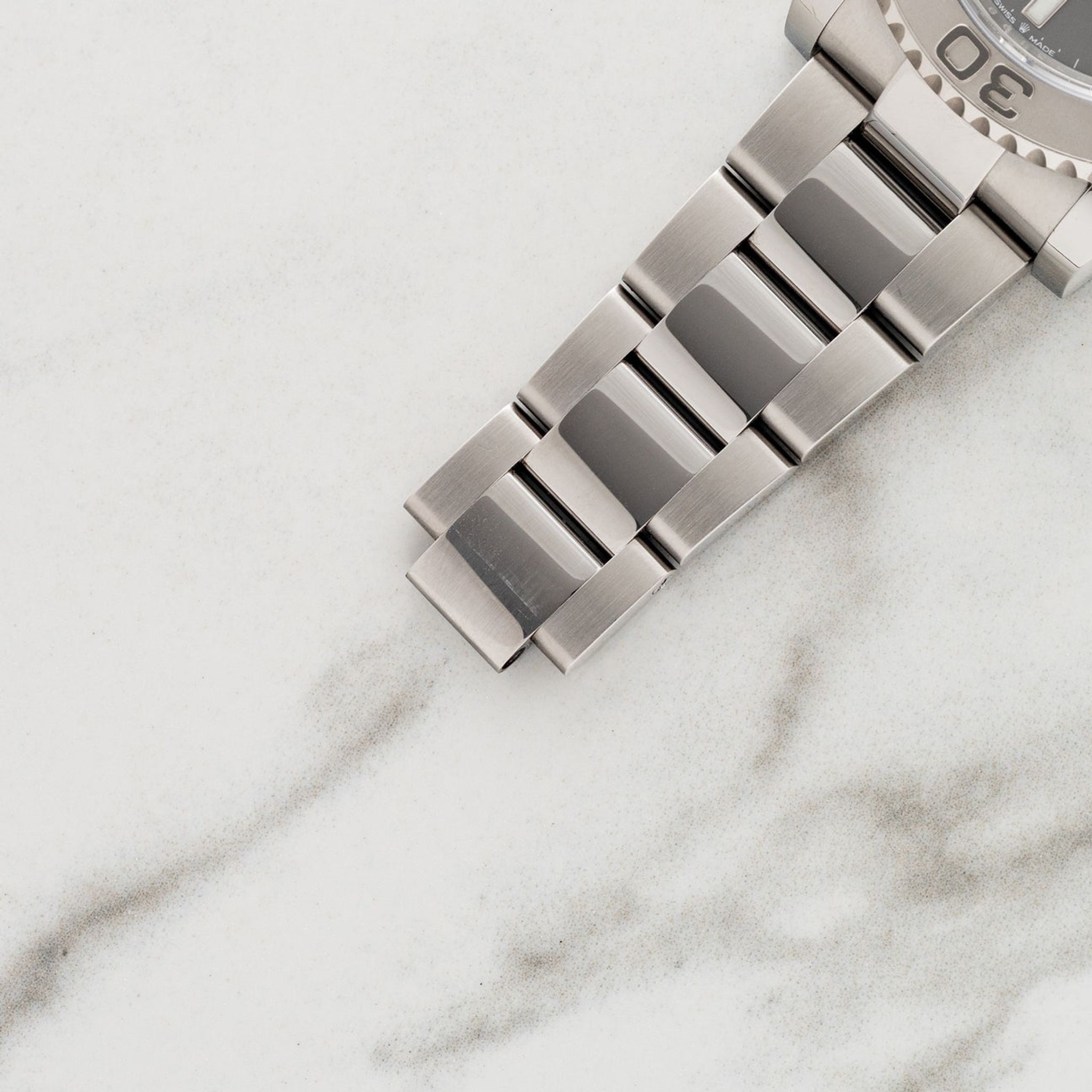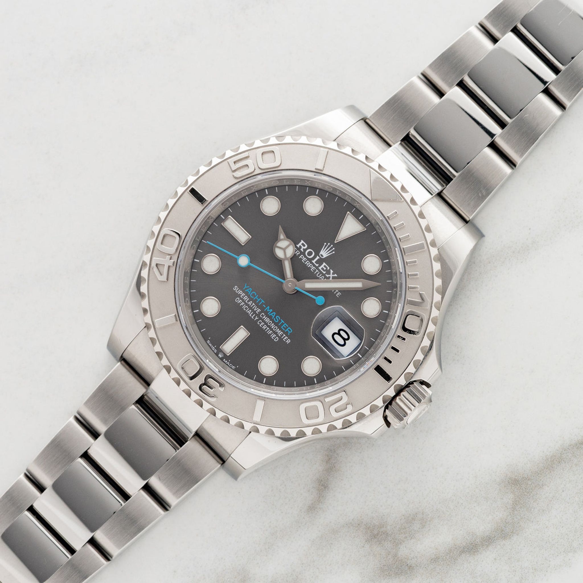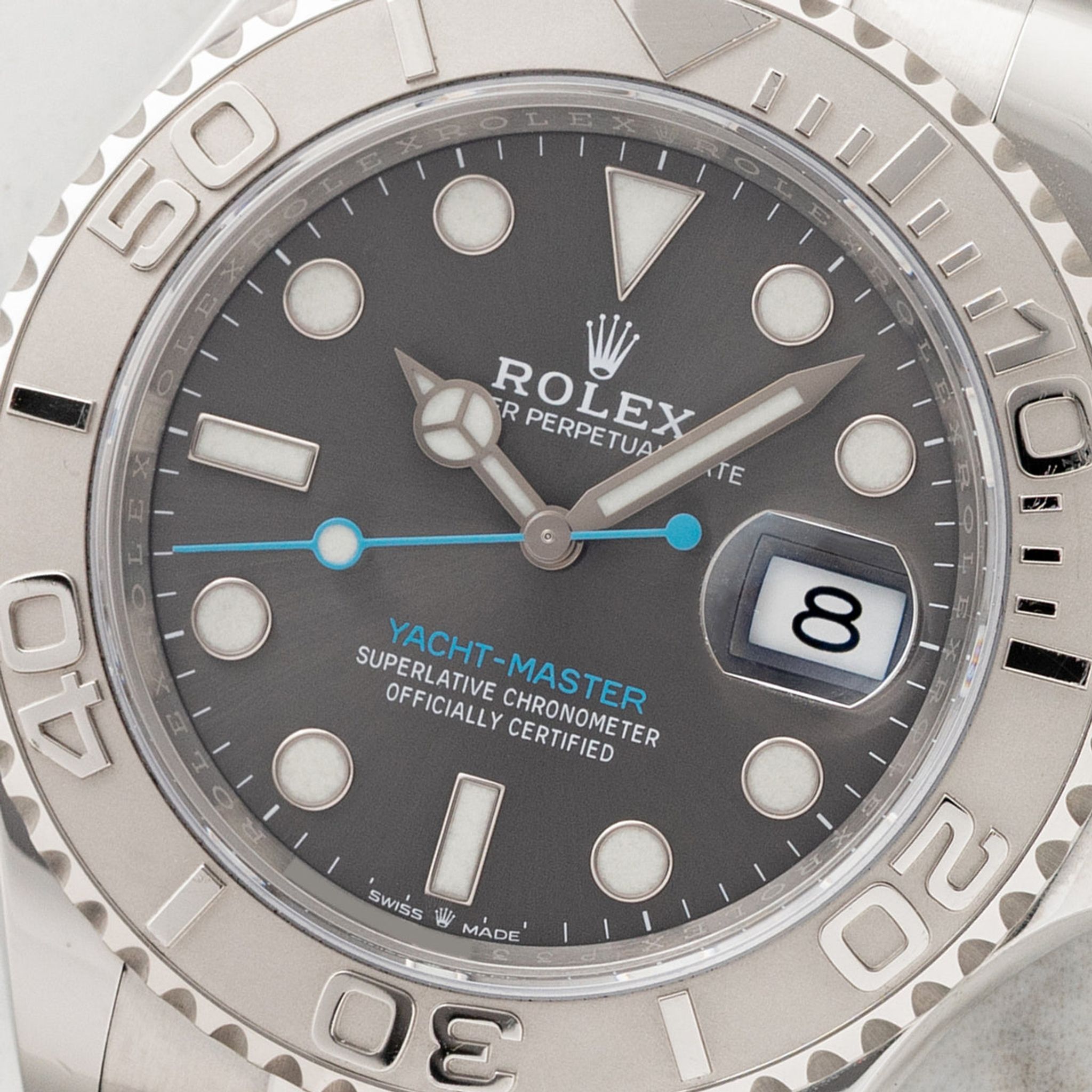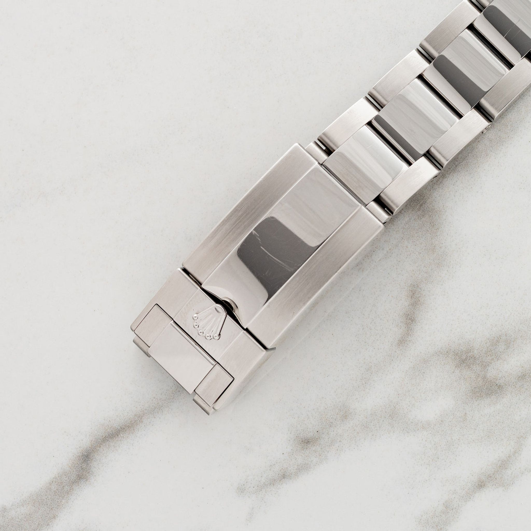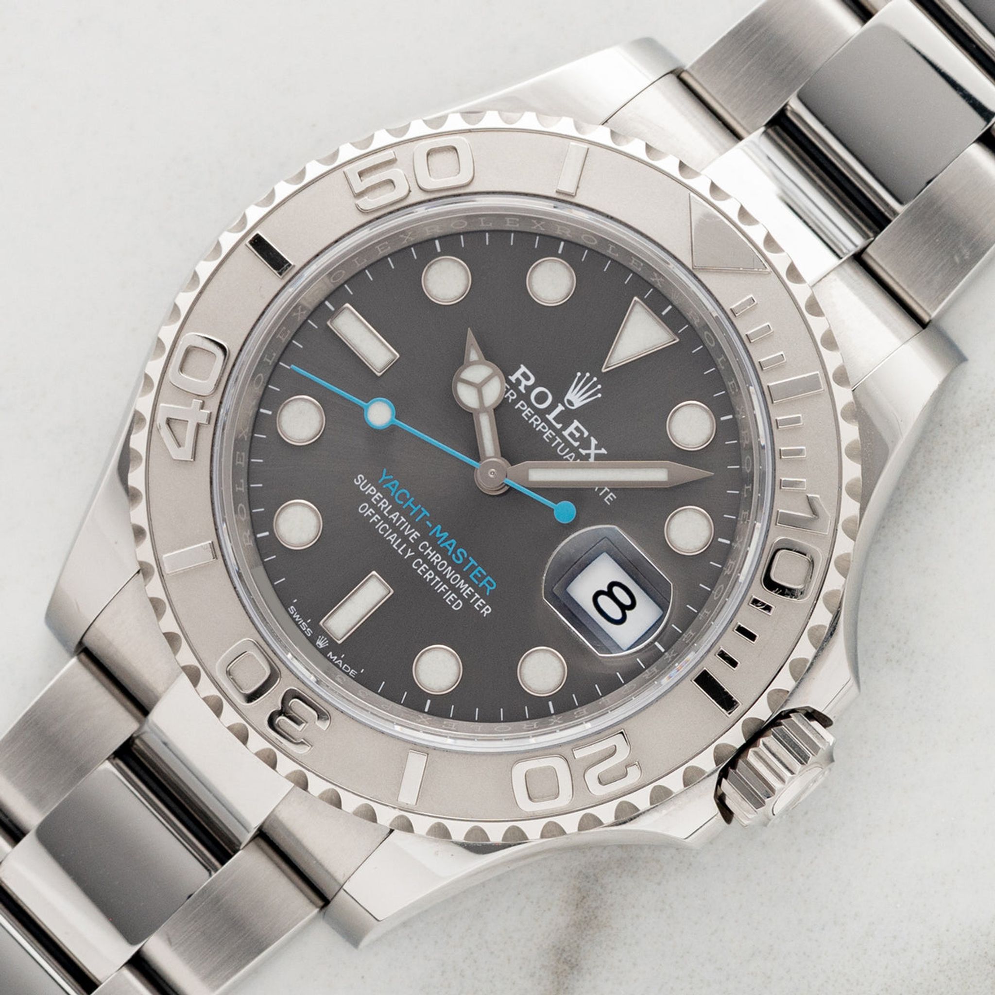 On offer is a complete set, circa 2019 remaining in excellent pre-owned condition. This example boasts an unpolished case/bracelet which is fully linked and comes with everything from new. Overall, the watch is in close-to-new condition. This particular variant features a beautiful grey rhodium dial, accented by aqua blue text and its seconds hand which is an unusual but very nice combination for Rolex. The bezel insert is also made of platinum, subtly elevating this practical daily driver.