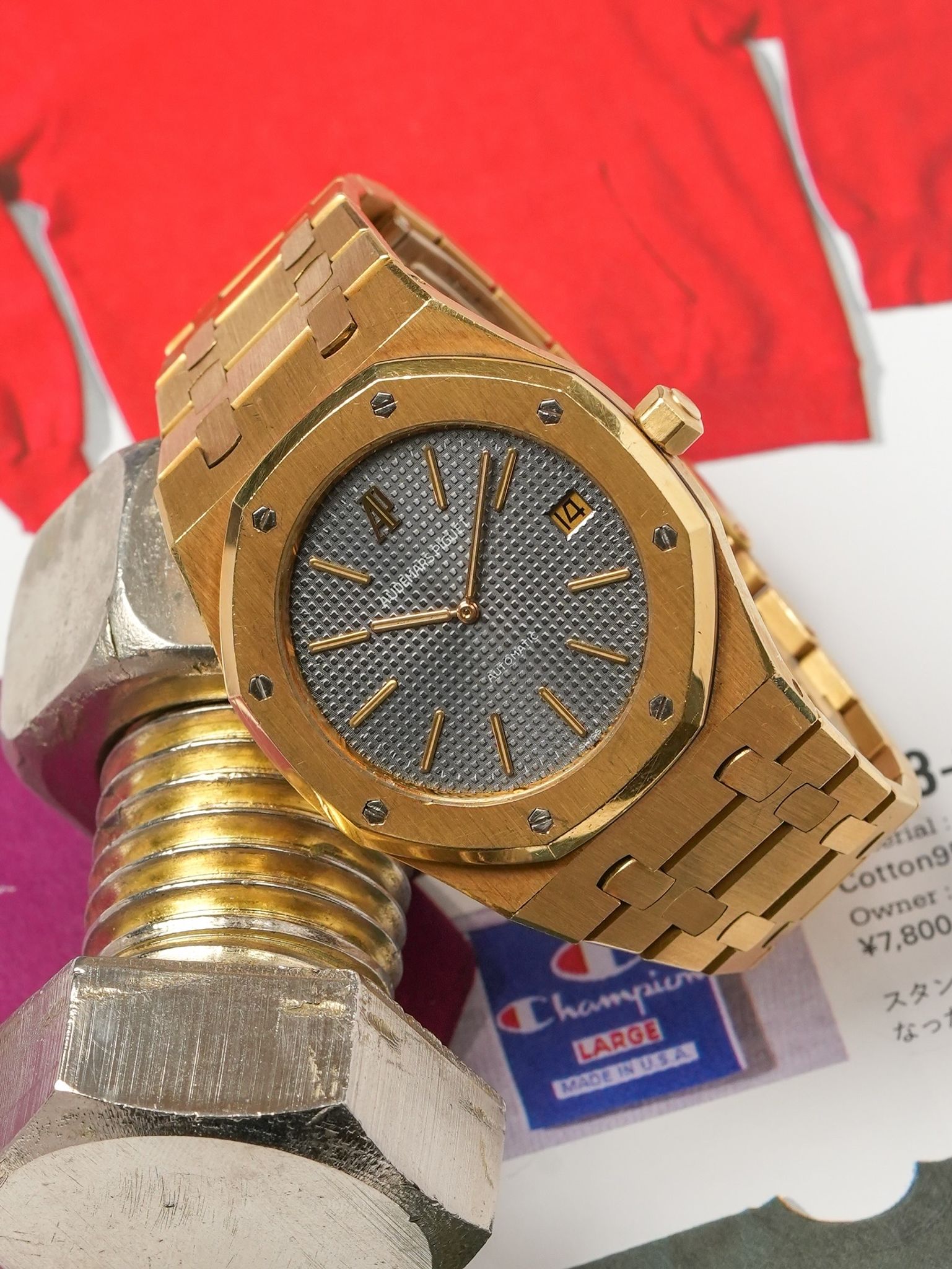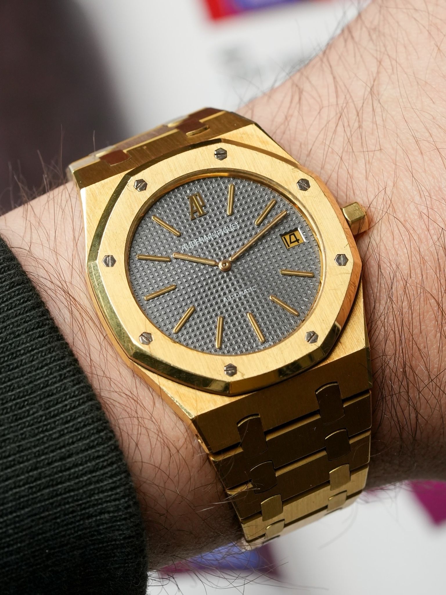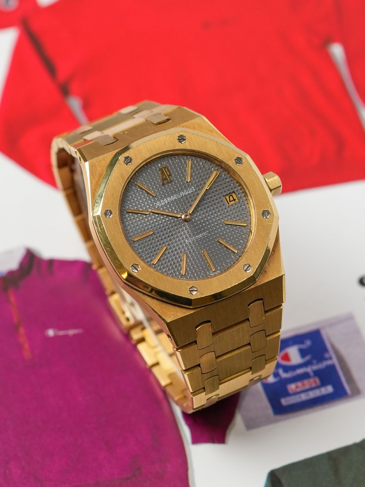 A Royal Oak ref. 5402BA from Audemars Piguet. The original Jumbo, this was the very first solid 18k Oak. The warm grey dial pairs perfectly with the aged gold, giving this one a softer, more approachable feel.