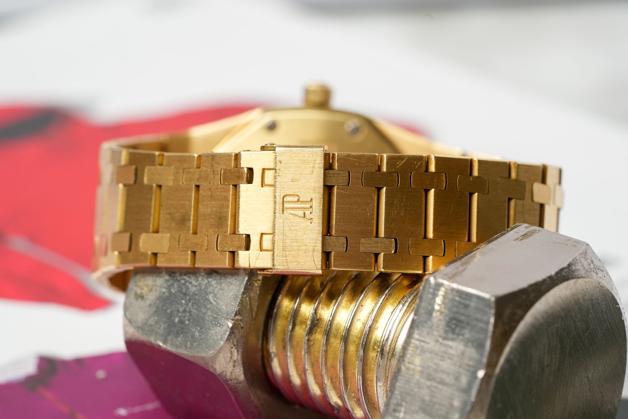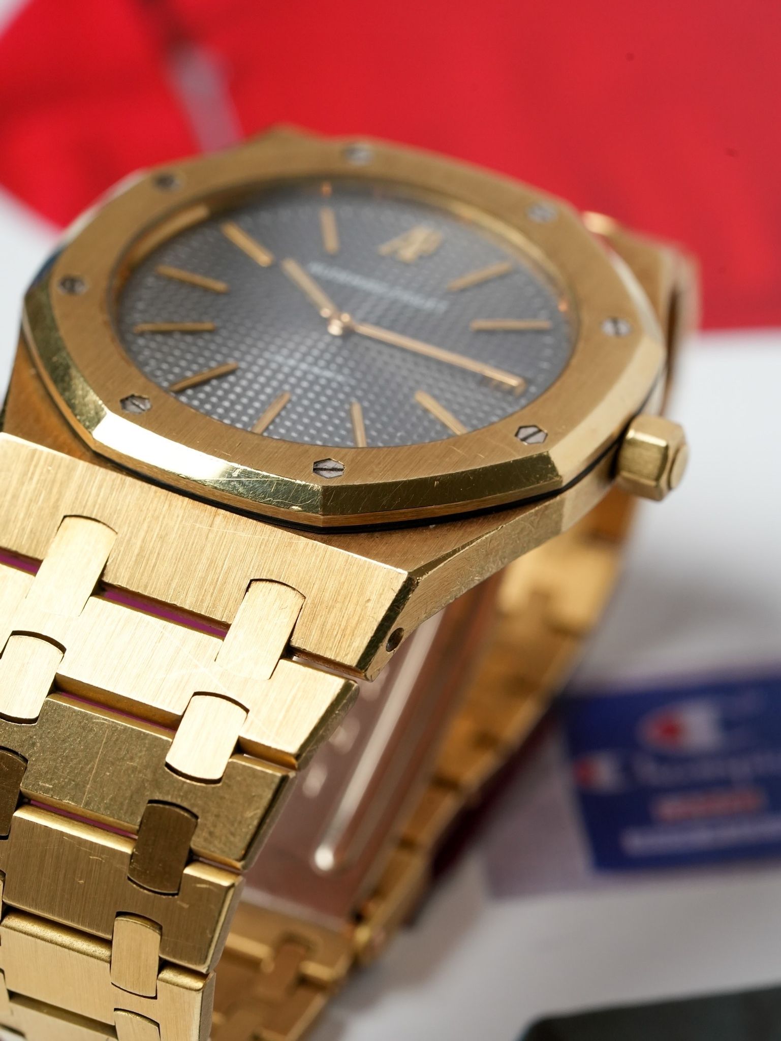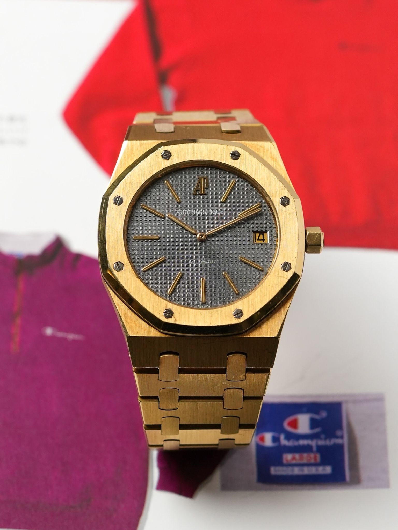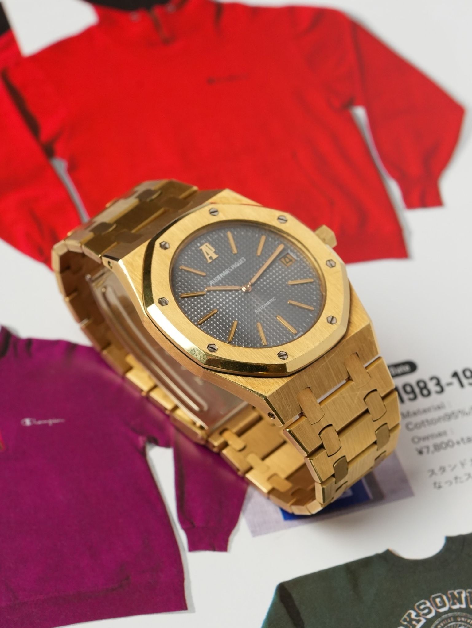 A Royal Oak ref. 5402BA from Audemars Piguet. The original Jumbo, this was the very first solid 18k Oak. The warm grey dial pairs perfectly with the aged gold, giving this one a softer, more approachable feel.
