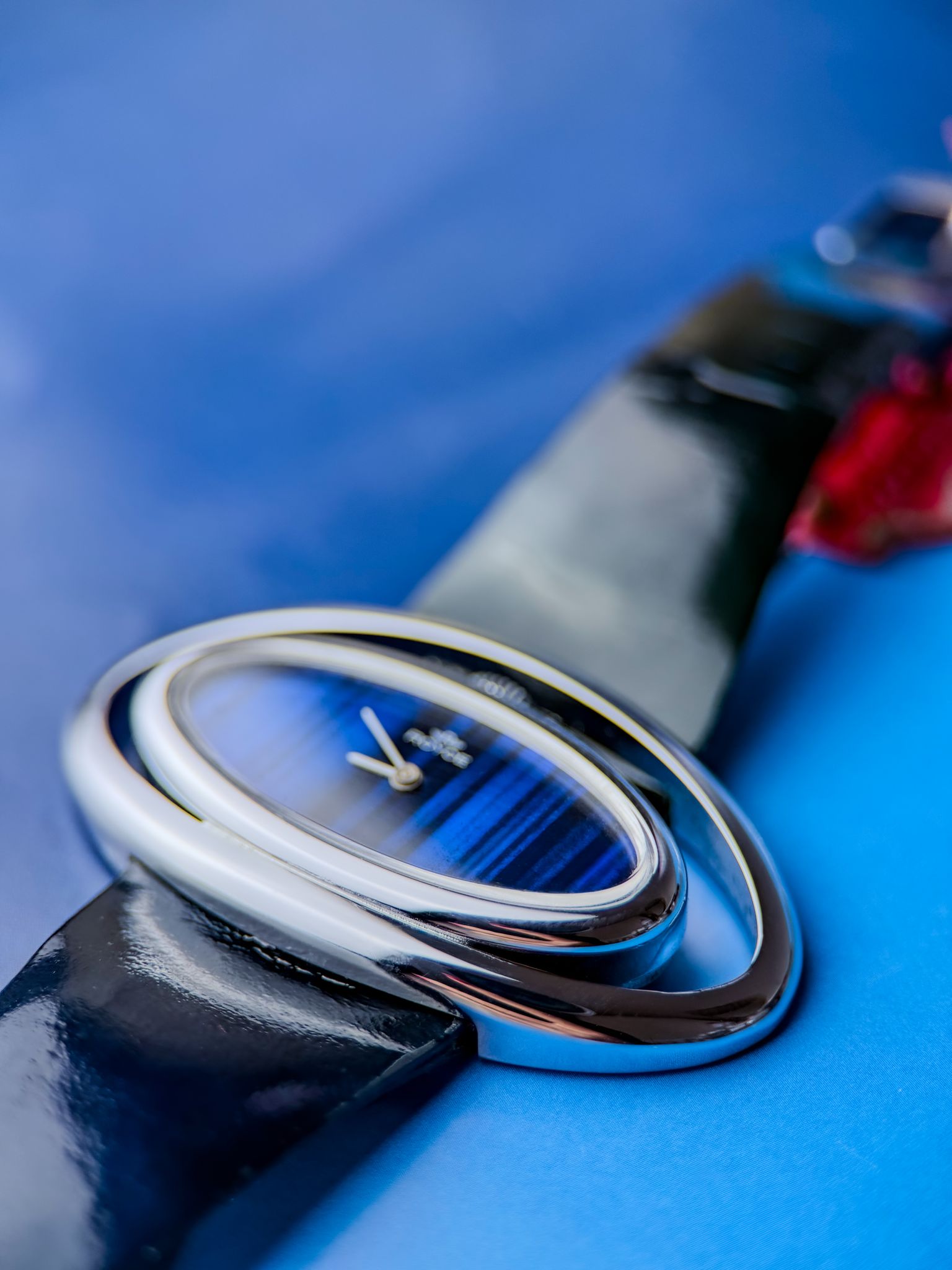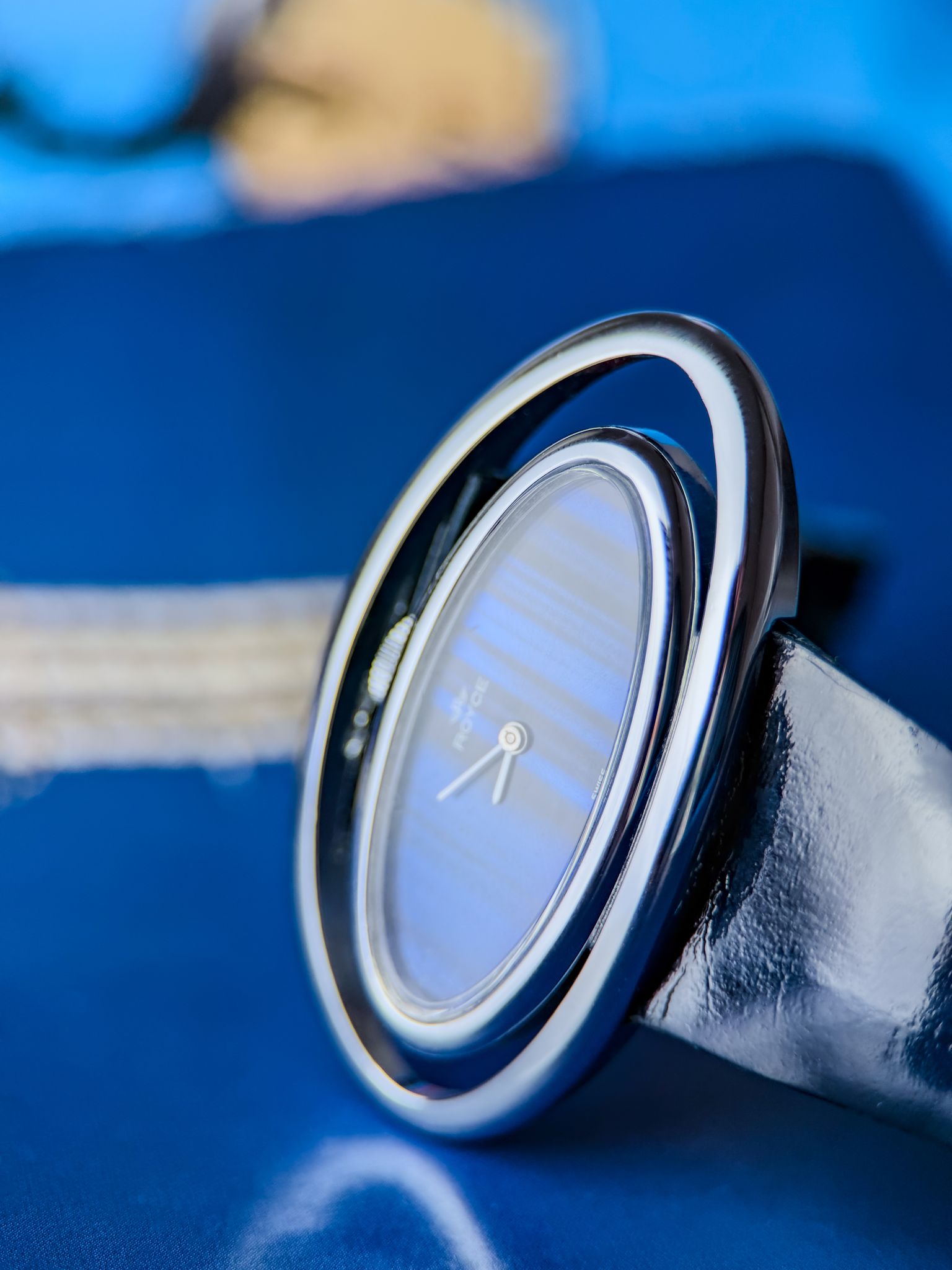 The deep blue dial catches the light beautifully, embodying the avant-garde spirit of its era.