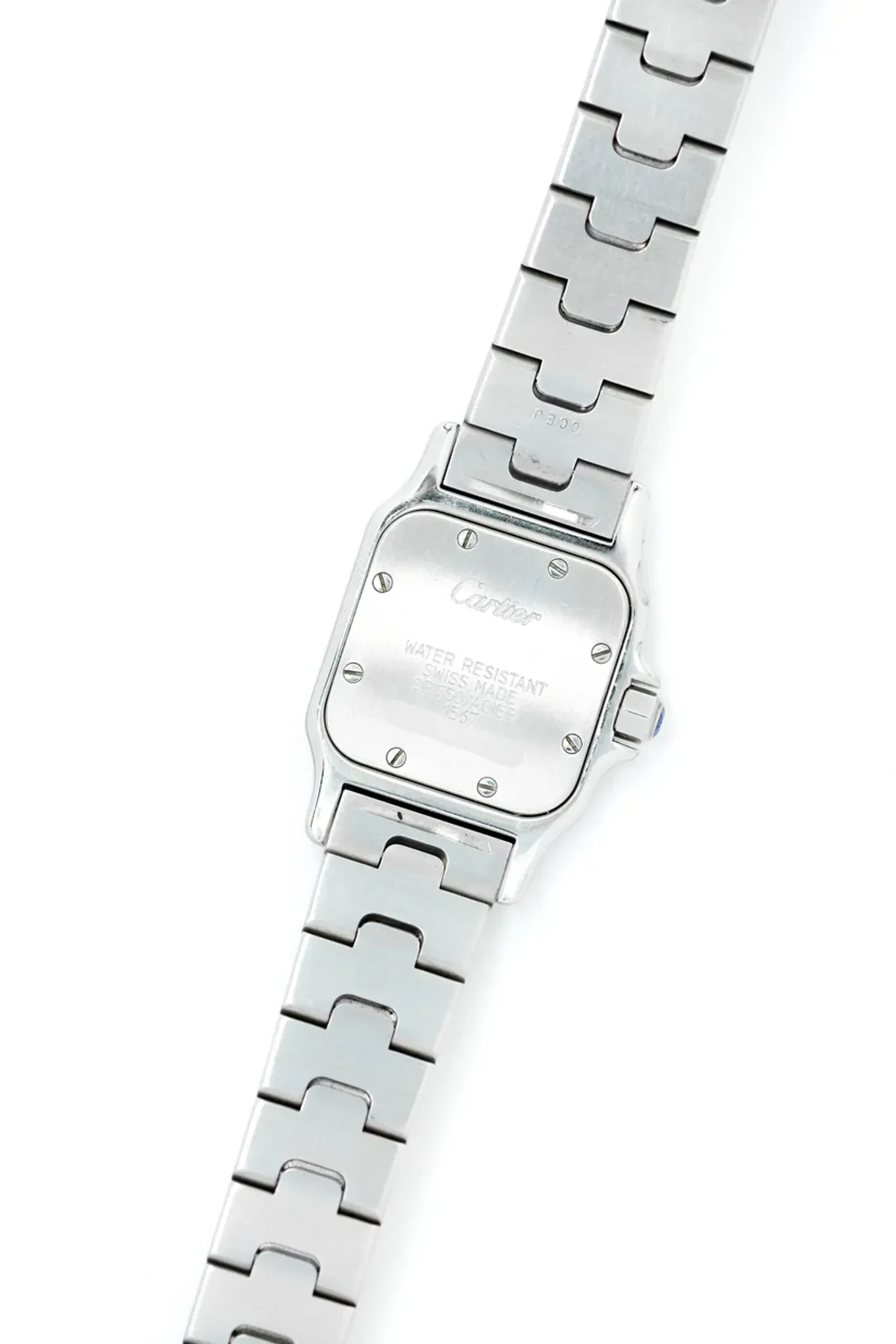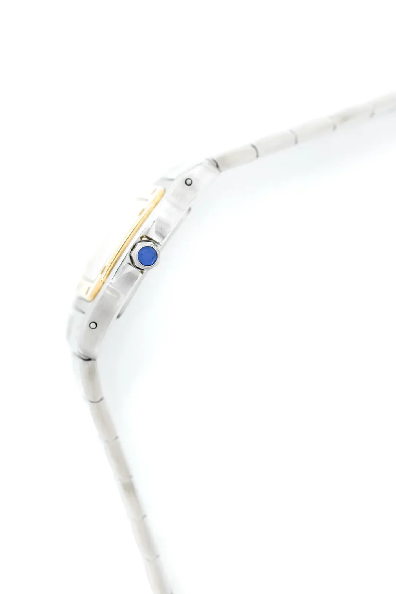 In theory rather sporty with its integrated steel bracelet, this Cartier Santos remains elegant with its smaller dimensions, its traditional Cartier dial with Roman numerals on a white background and the presence of the yellow gold bezel.
