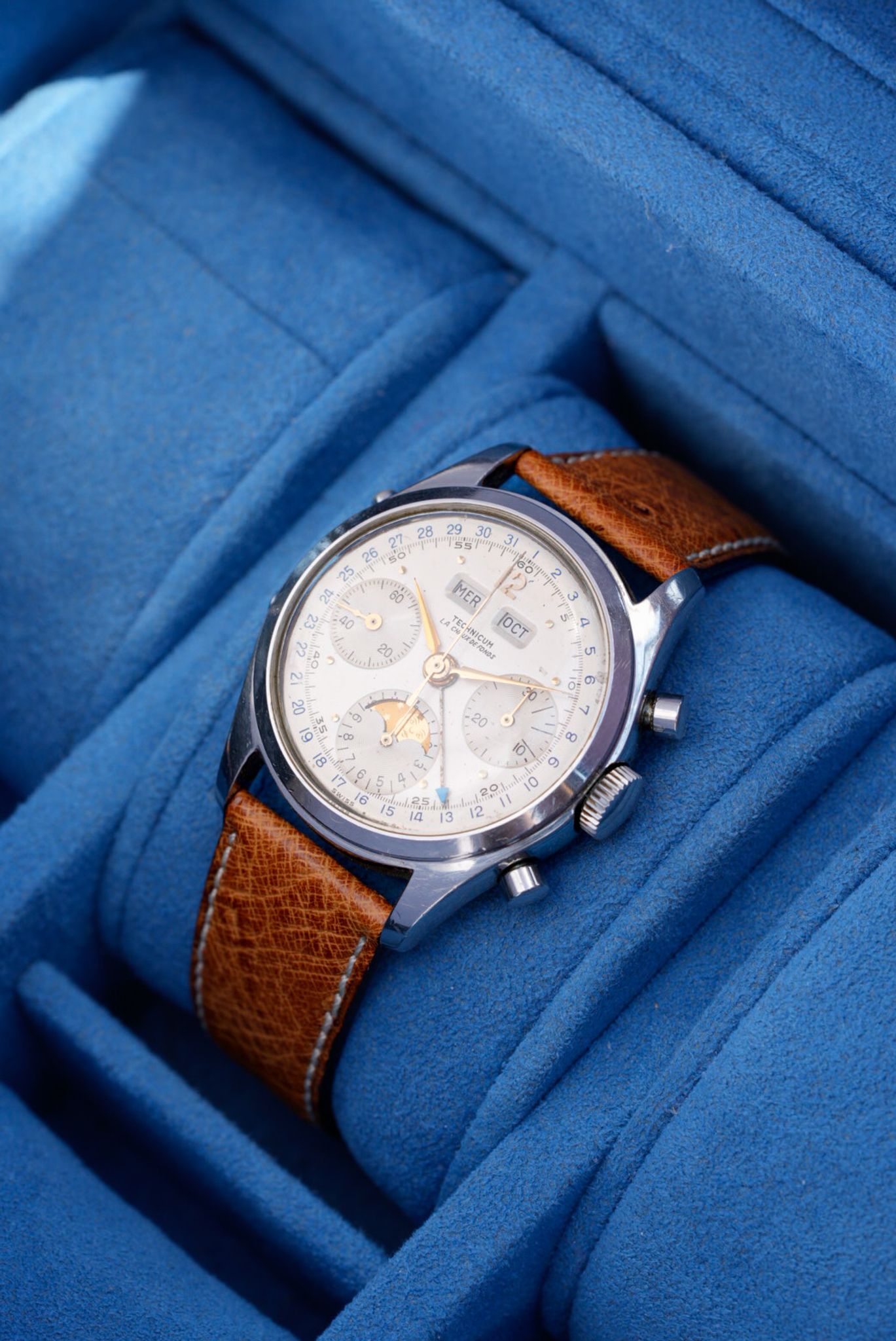 The watchmaking school of La Chaux-de-Fonds, the Technicum Neuchâtelois, required students to complete their university curriculum by creating a fully functional watch, the result of several years of training. This final project, the culmination of their studies, demanded dozens of hours of meticulous workshop work. In the 1960s, Michel Fivaz produced, as part of this program, a triple-date chronograph with moon phase, powered by a Valjoux 88 caliber. Its 36 mm steel case, silver dial signed “Technicum La Chaux-de-Fonds,” applied indexes, and the layout of the registers are reminiscent of the Rolex Dato-Compax “Killy,” with the added moon phase complication. Unique and entirely hand-finished, this piece is akin to the work of today’s independent watchmakers, with the added charm of being a one-of-a-kind creation.