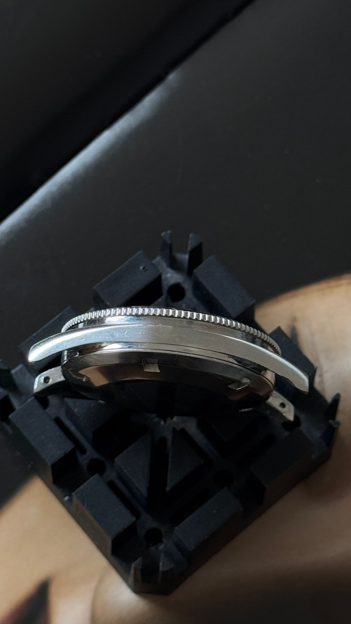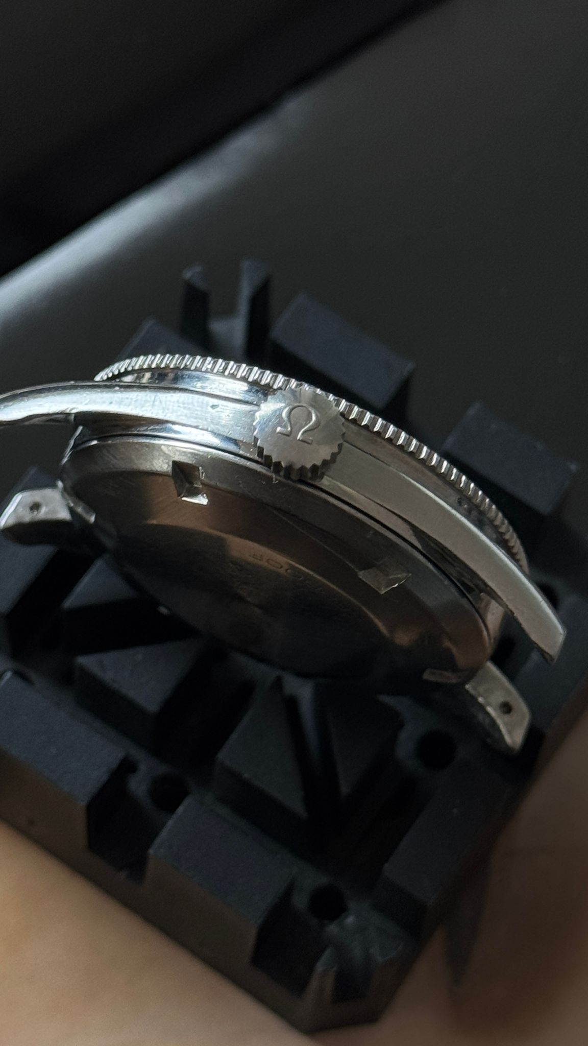 Its plexiglass crystal, still bearing the Omega logo at the center, is original. The rotating bezel, with its inverted 60-minute scale, has been restored as faithfully as possible to the original. A piece that perfectly captures the elegant simplicity of the early straight-lug models.