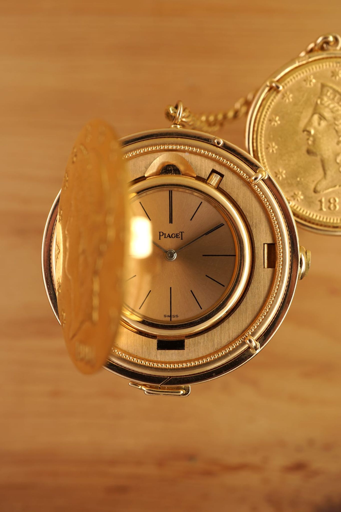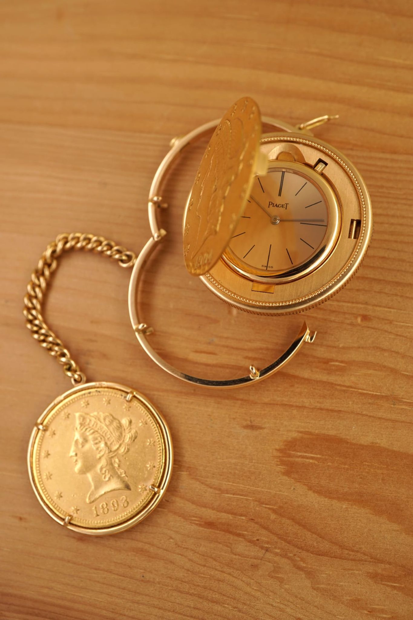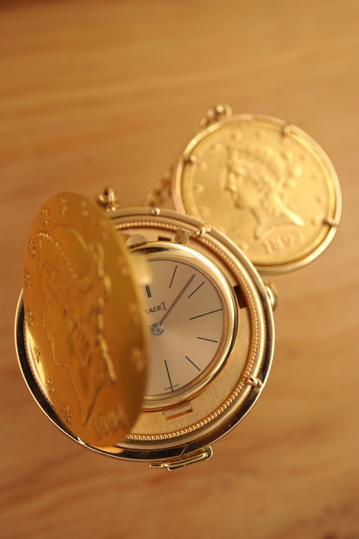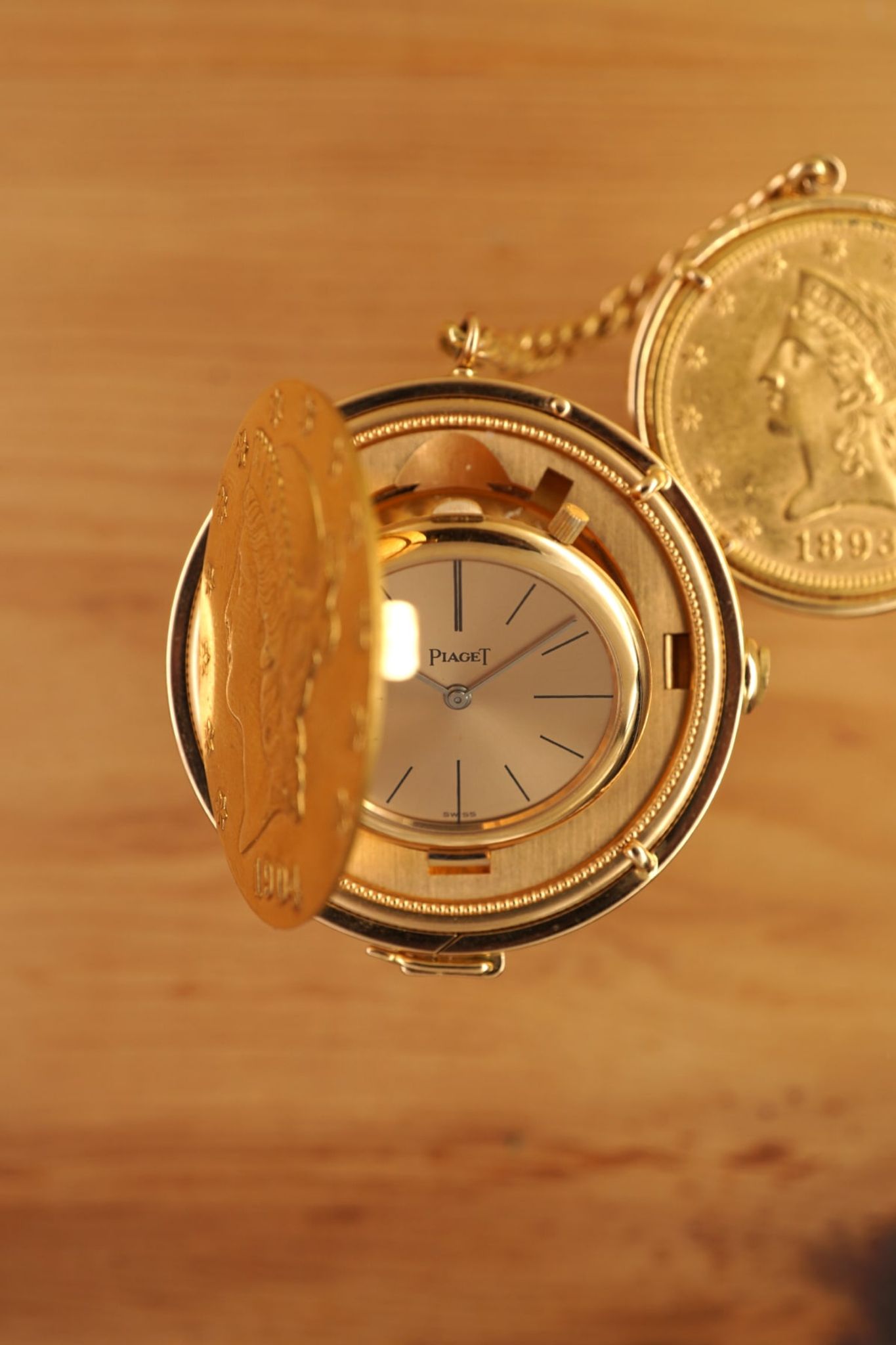 Ultra-Thin -- Piagets DNA since 1950s until today. The 20-USD coin-watch was one of Piagets masterpieces: made in 1972 or 1973, encased in a Liberty-goldcoin from 1904, which has a hidden pusher to open the lid and reveal the golden-dial under a flawless crystal and above the reliable- and precise-working cal9P. And it was all made in-house by the outstanding manufacturer from La-Cote-Aux-Fees: the case and the movement, the dial and the chain-connected counterweight with a 10-Dollar coin from 1893.