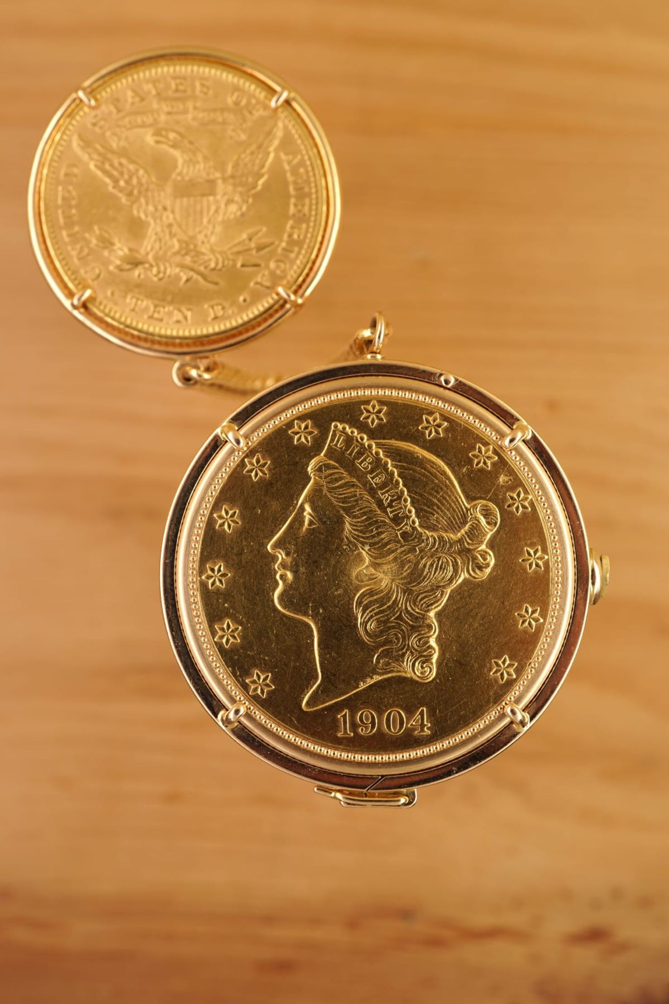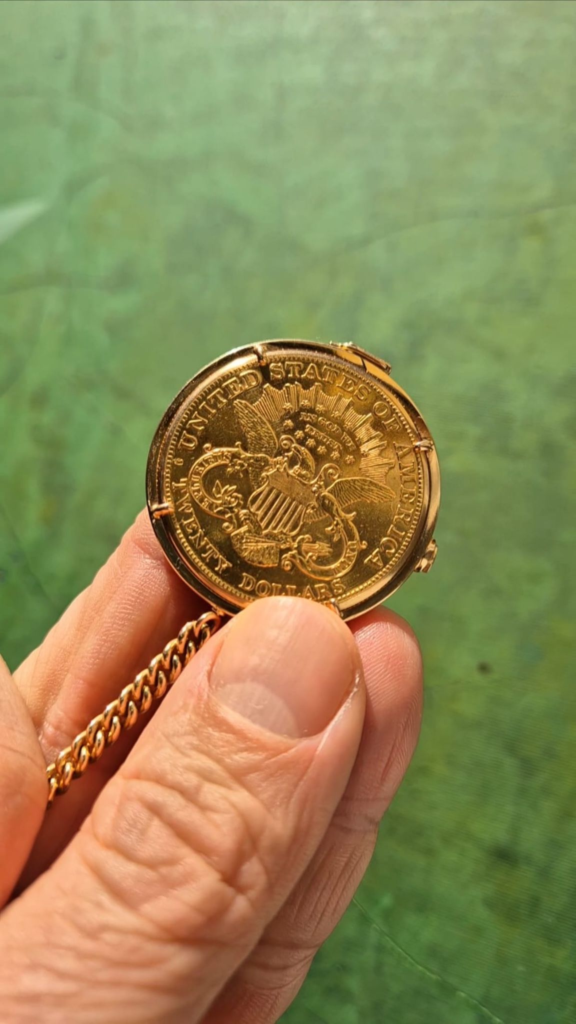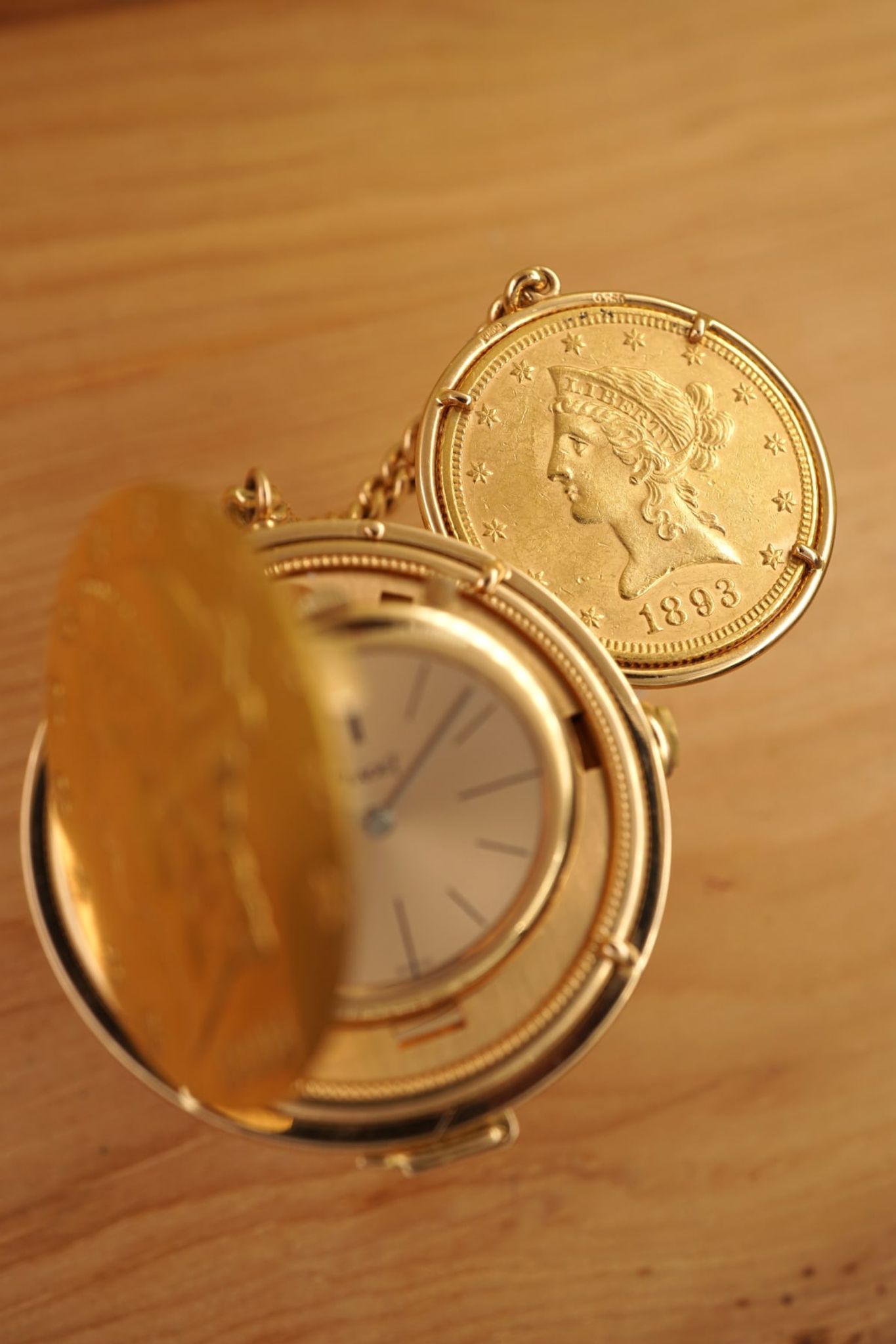 Ultra-Thin -- Piagets DNA since 1950s until today. The 20-USD coin-watch was one of Piagets masterpieces: made in 1972 or 1973, encased in a Liberty-goldcoin from 1904, which has a hidden pusher to open the lid and reveal the golden-dial under a flawless crystal and above the reliable- and precise-working cal9P. And it was all made in-house by the outstanding manufacturer from La-Cote-Aux-Fees: the case and the movement, the dial and the chain-connected counterweight with a 10-Dollar coin from 1893.