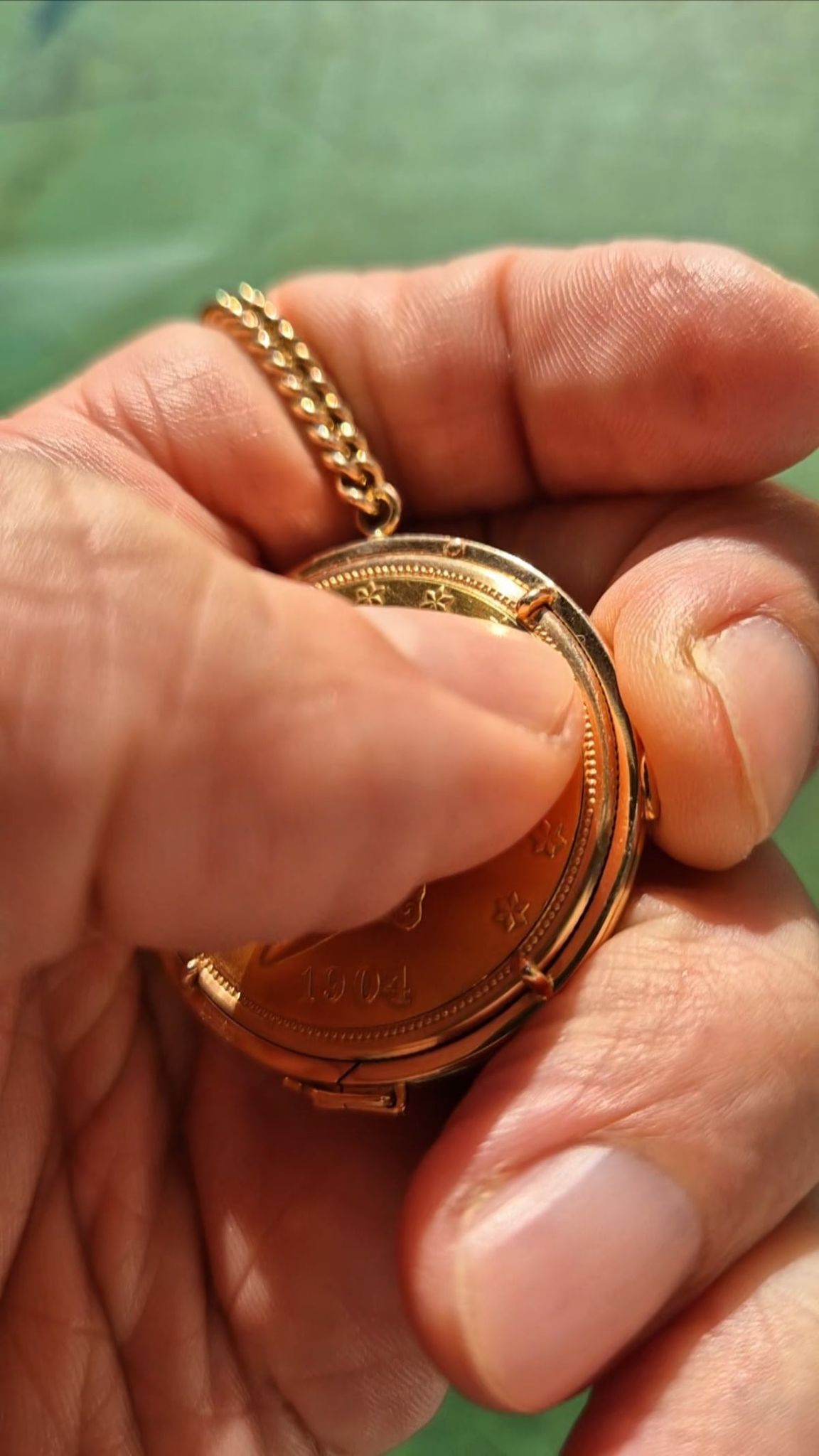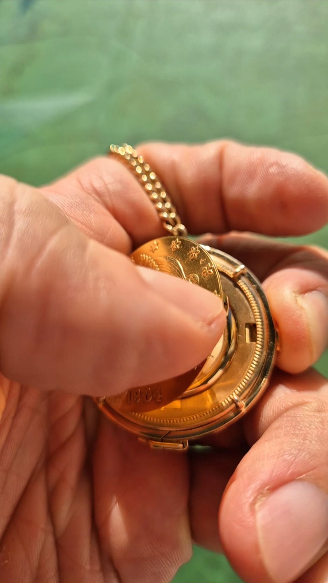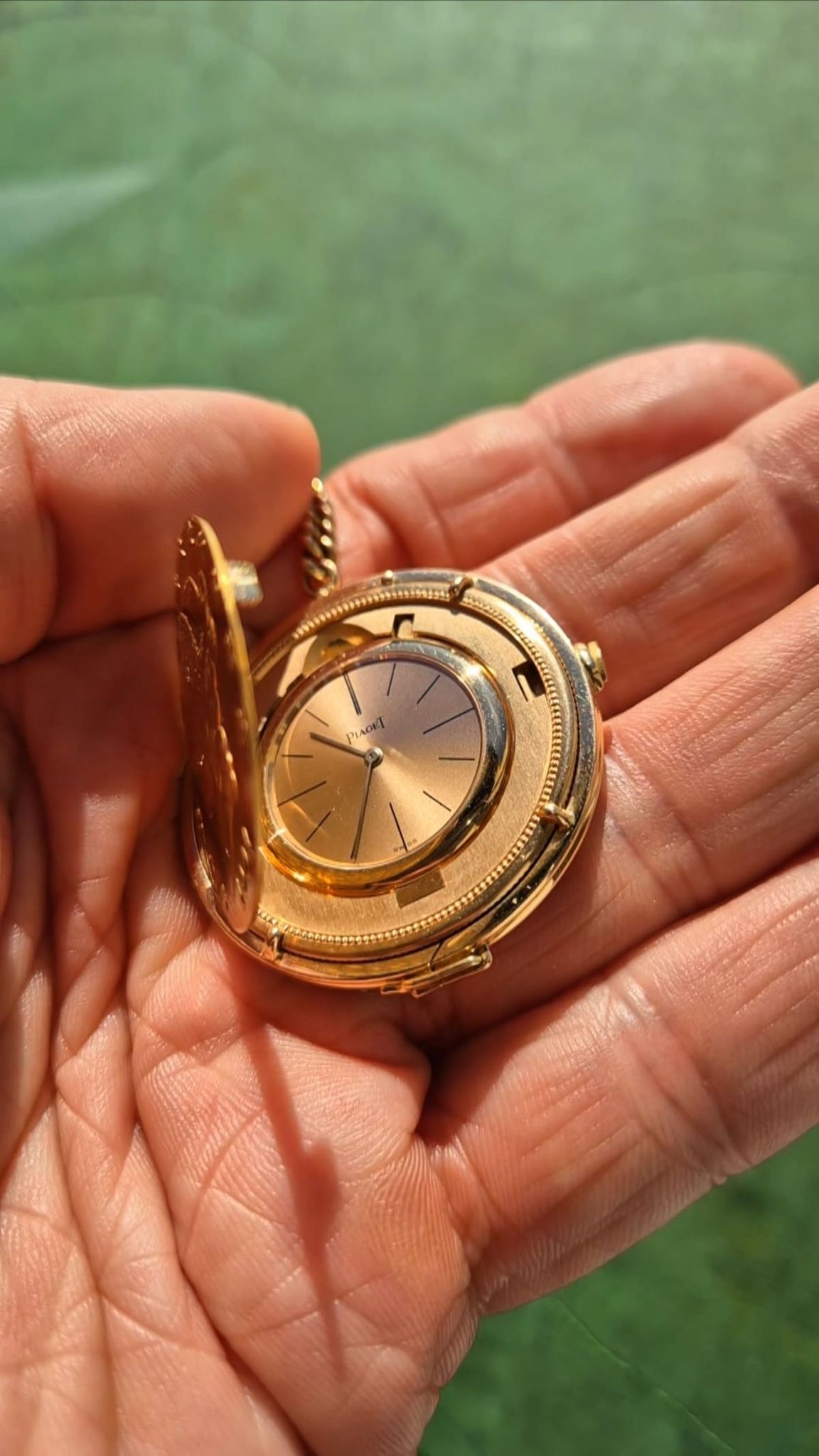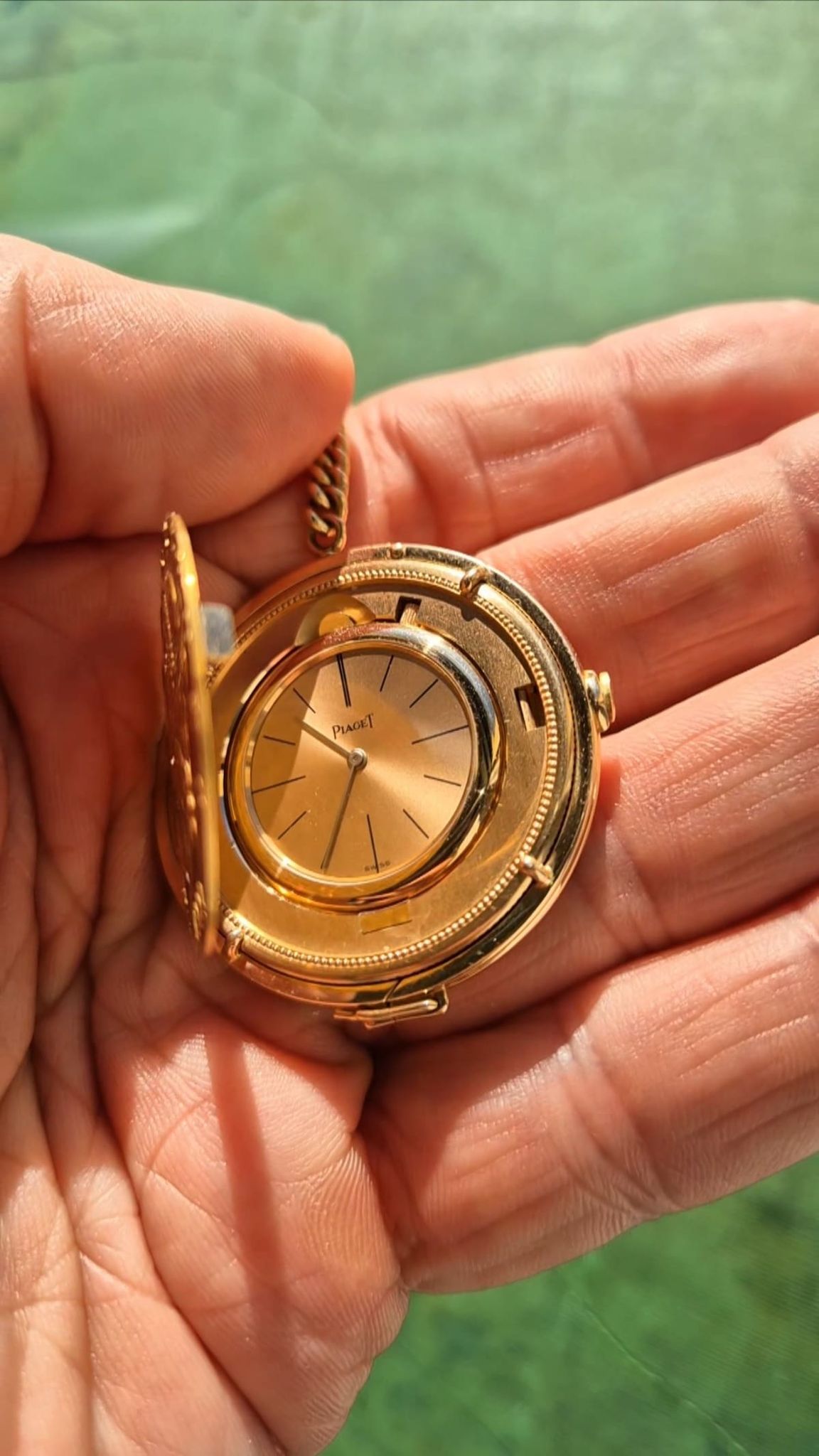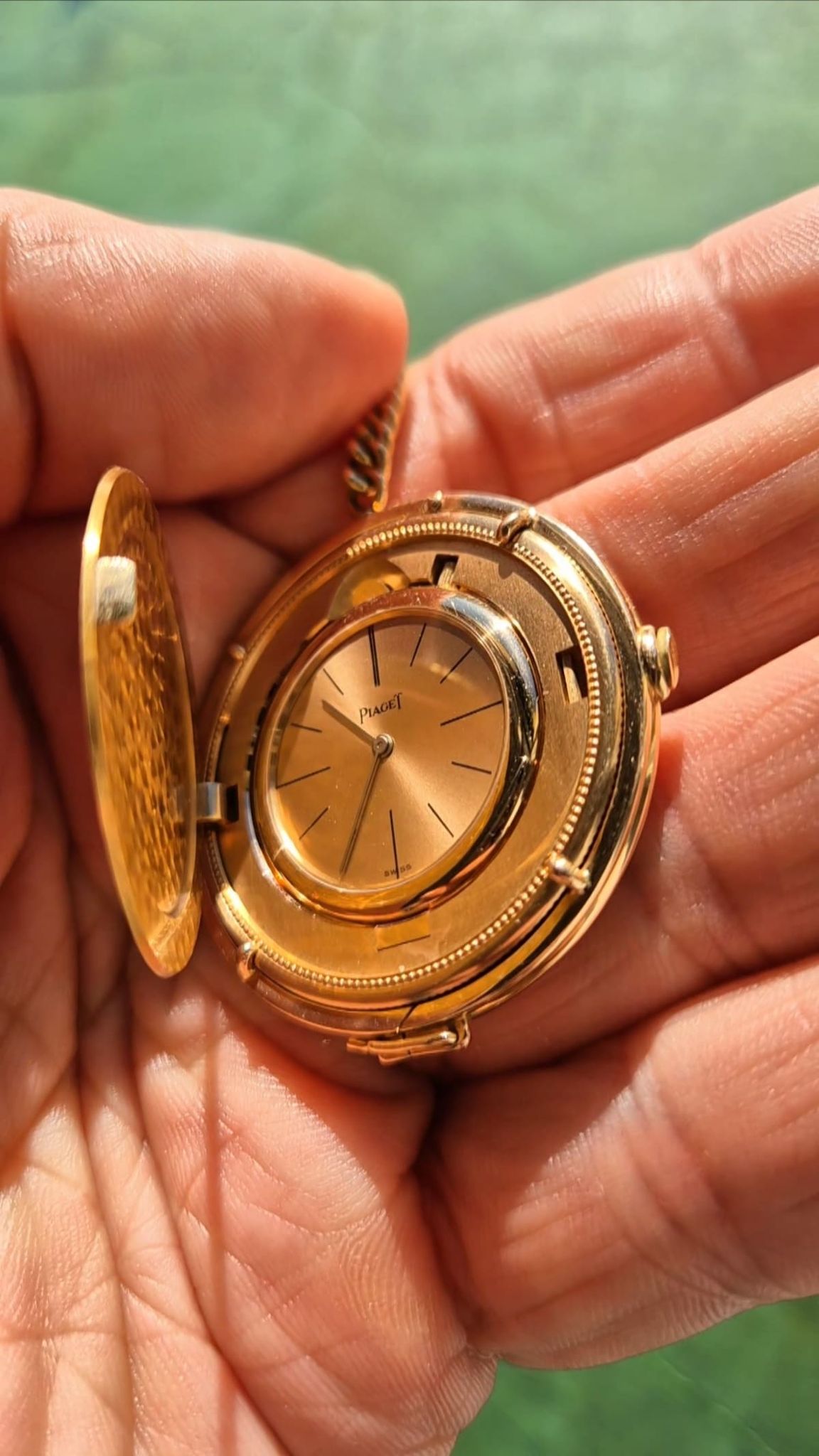 Highest precision case- & watchmaking by Piaget. The rare configuration with the golden sunburst-dial and coming with the even rarer holding-ring (with pusher for case opening even when mounted) and the Piaget-made chain and ringed counterweight 10-Dollar coin. Signed: dial, movement, case, watch holding ring, chain and counterweight holding ring.