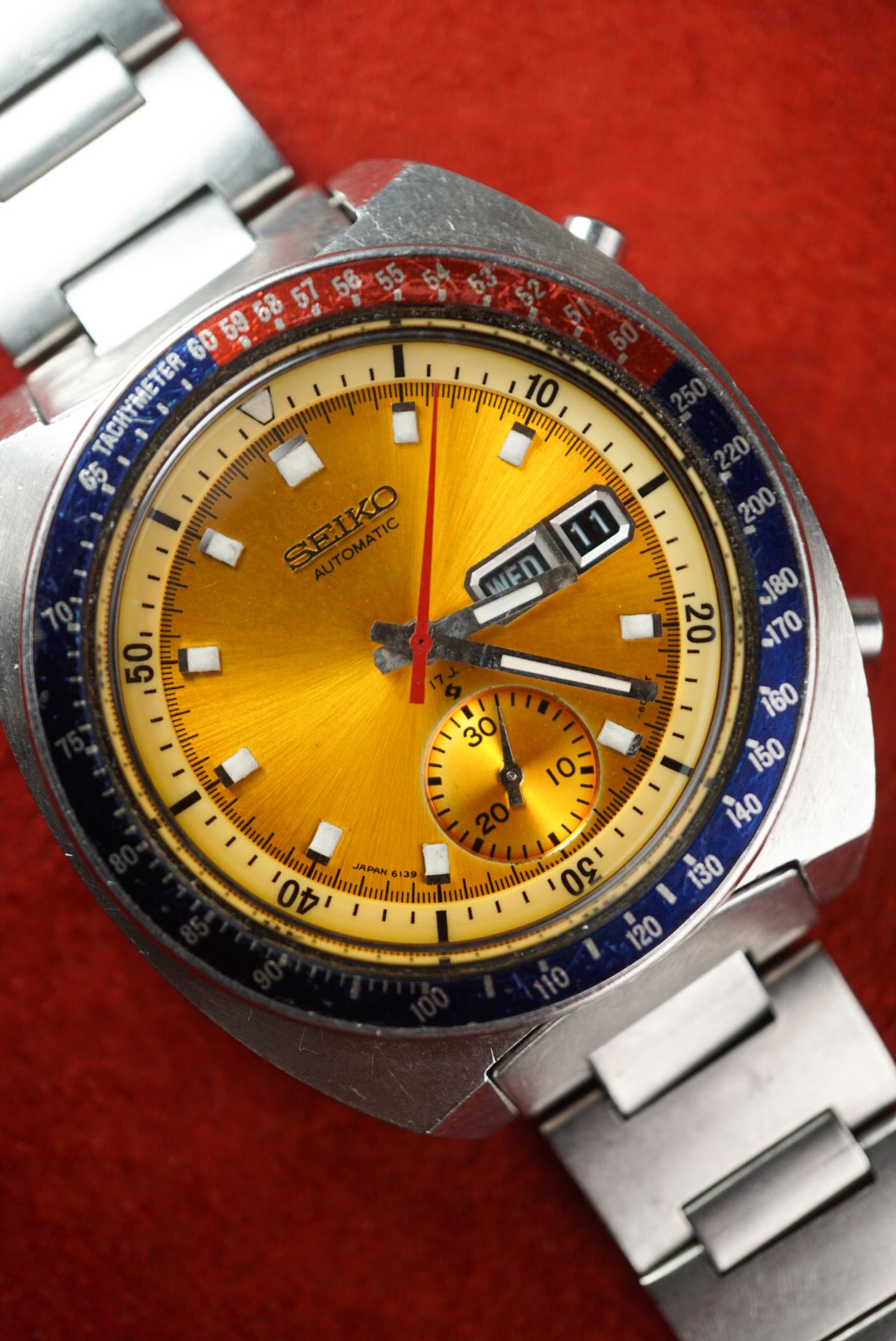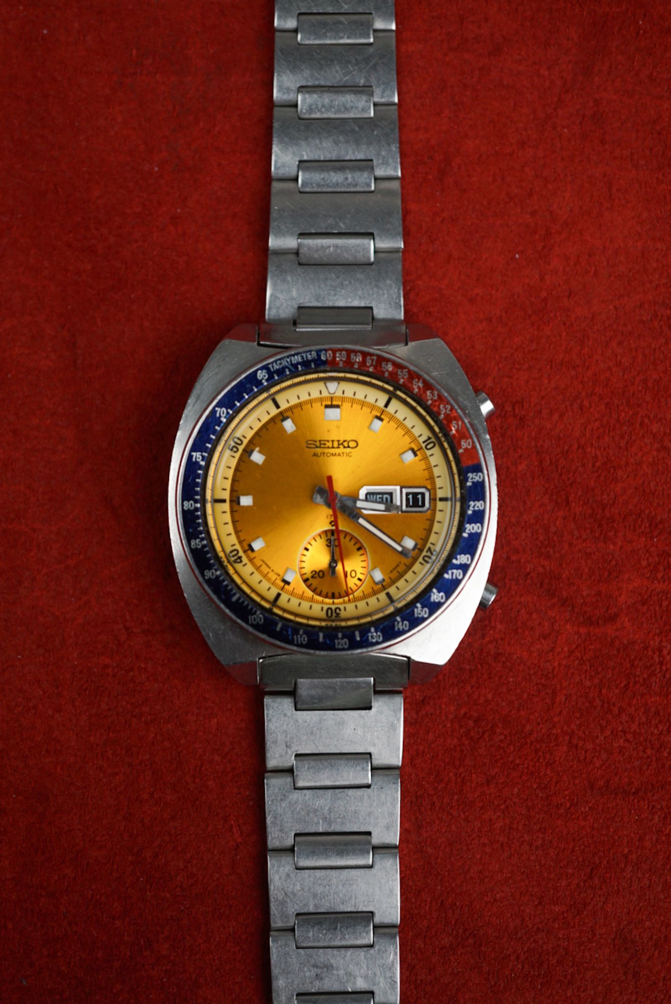 A well-known and iconic model from one of my favorite brands, this Seiko Pogue is in excellent original condition. It features a clean, bright yellow sunburst dial, a sharp case, and a long bracelet. The watch has undergone a full service and is running perfectly. A staple in any serious Seiko collection, it’s also a fun and vibrant piece to wear — thanks to the bold dial and colorful bezel insert.