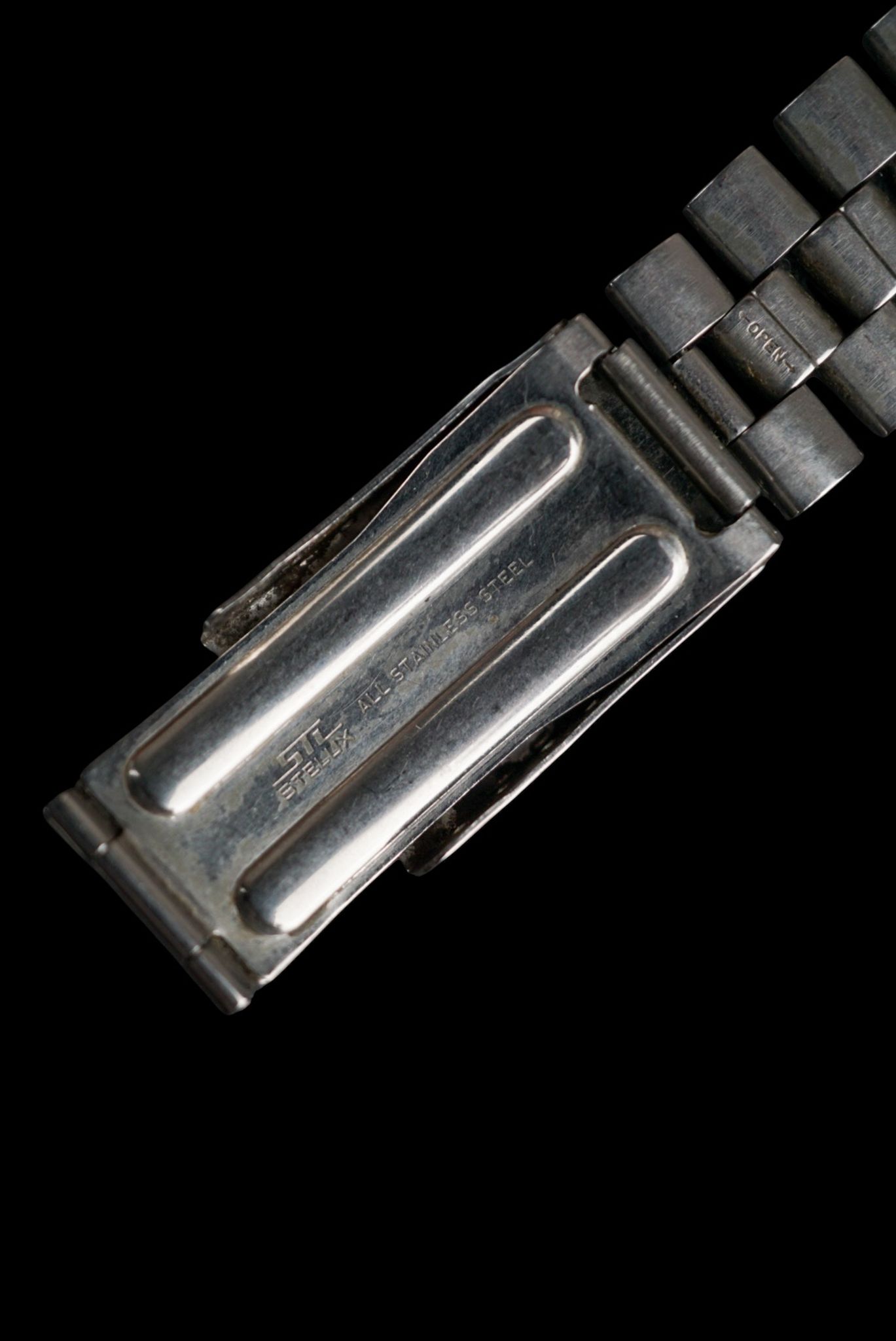 The stainless steel case retains very sharp edges and shows normal wear without any deep scuff or scratches. The stelux japanese bracelet is in great shape showing normal stretch, it would comfortably fit a 7.5 inch bracelet.
