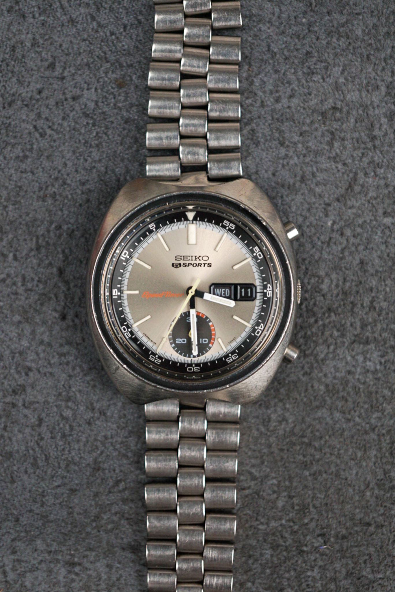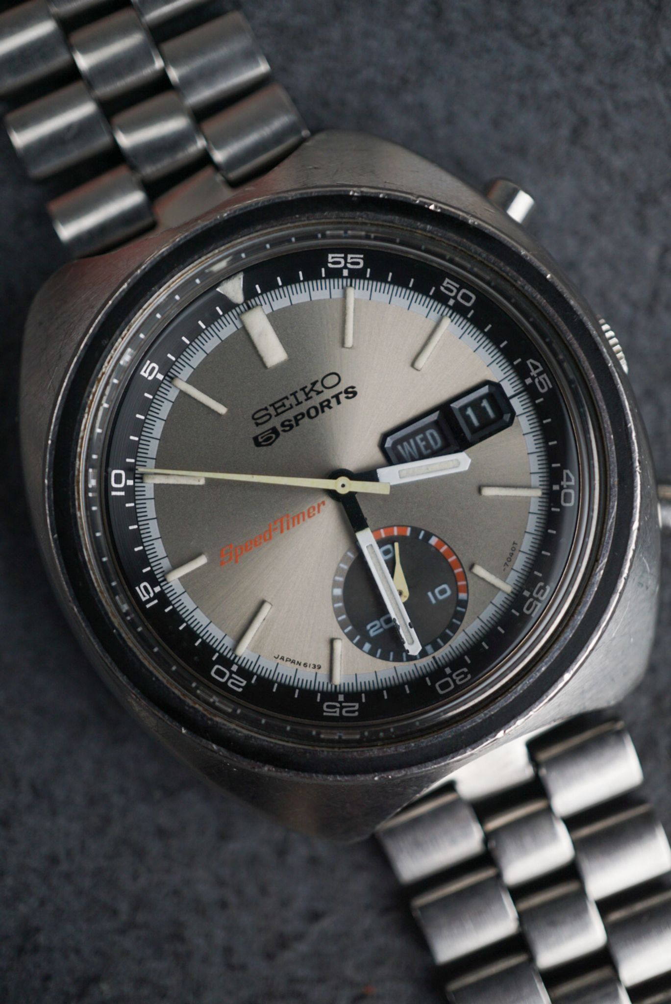 A super rad Speedtimer also powered by the beloved 6139 movement. I like this one in particular because of the sober tones on the dial. Silver and black work perfectly, it’s not as funky as the other Seiko chronograph models but still manages have a splash of character with the yellow chronograph hands and the orange “Speedtimer”.