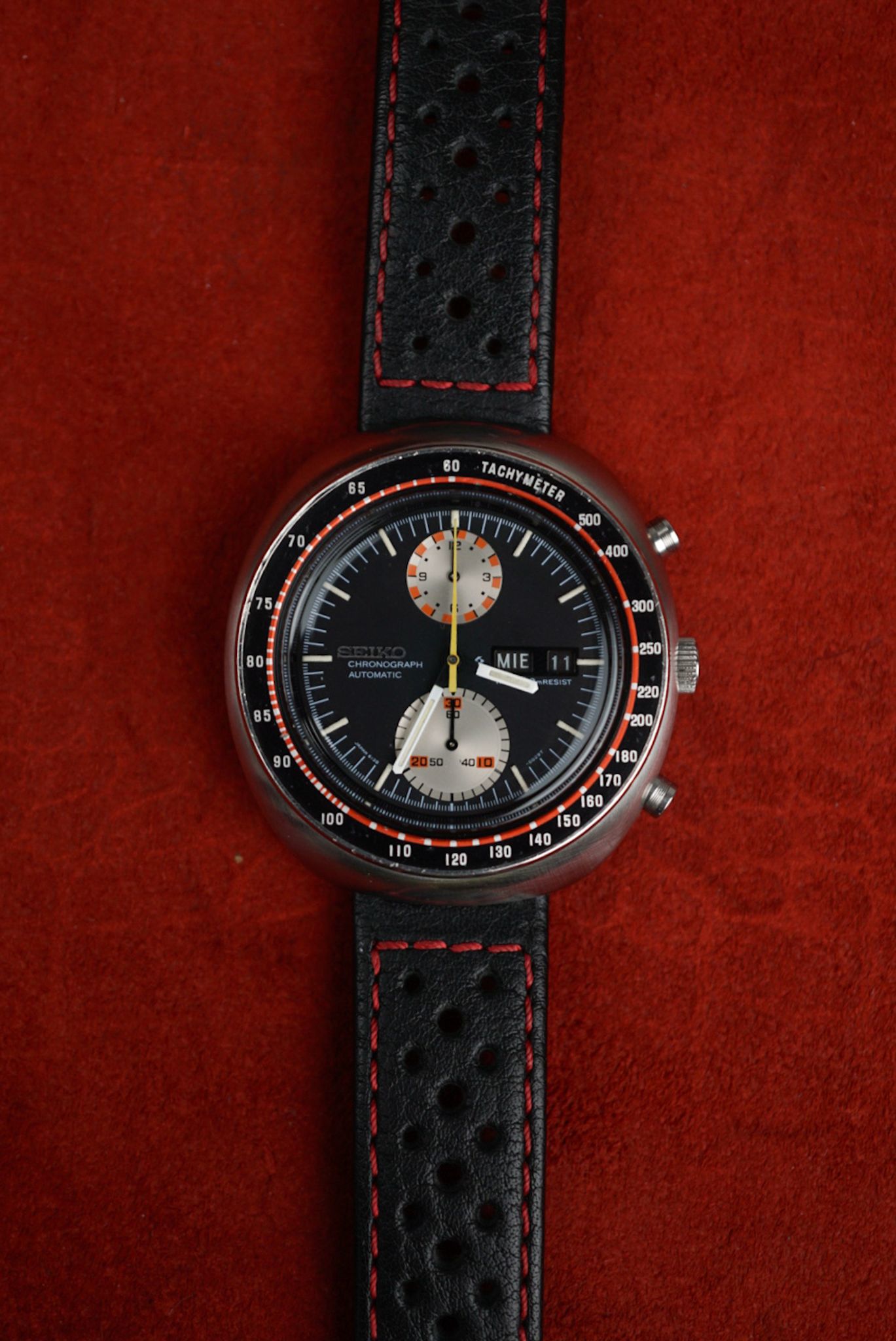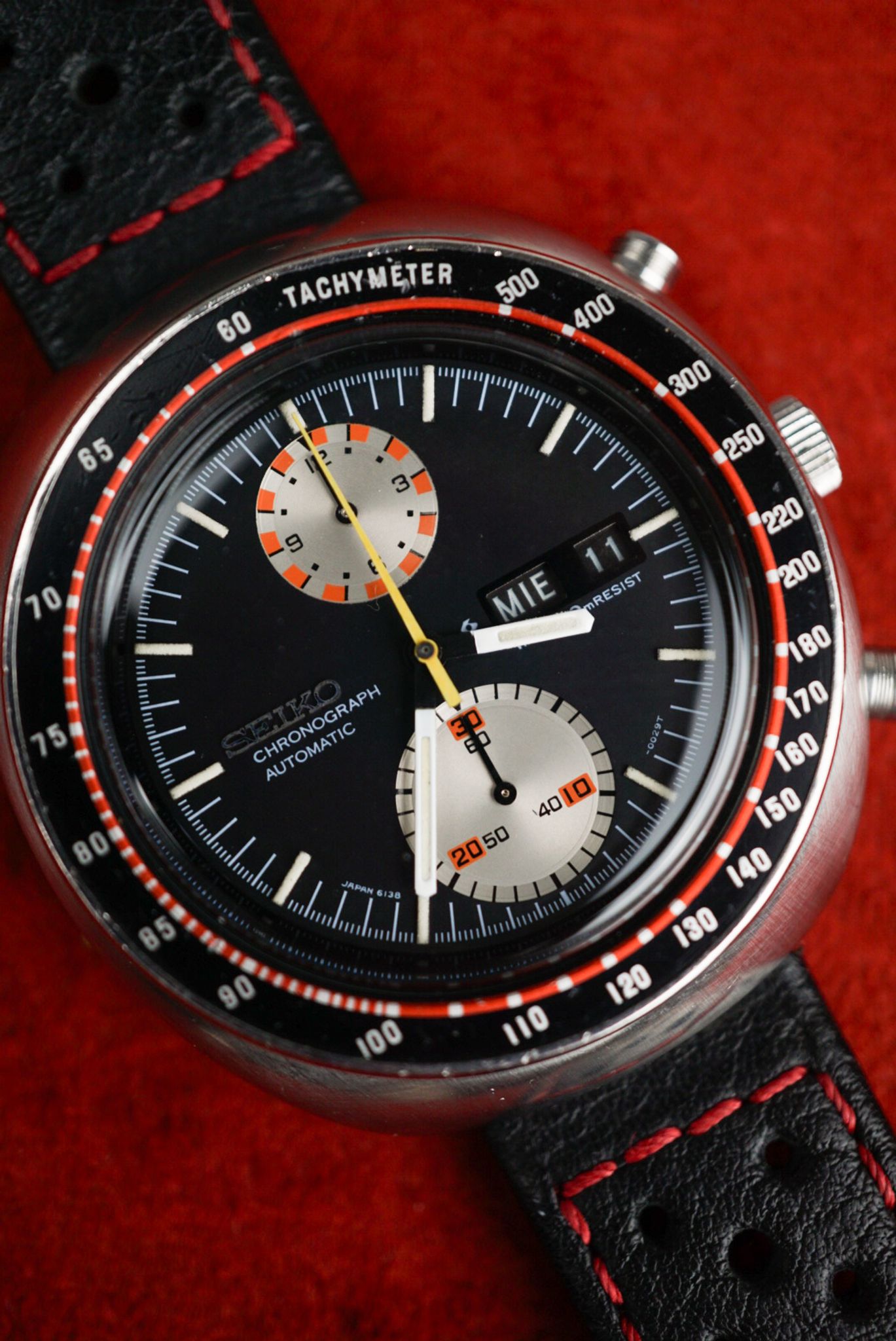 Bold & Colorful Seiko UFO This cool and hefty Seiko UFO measures 42mm across and 14mm thick — a great fit for larger wrists. It shares the same bold spirit as the Seiko Pogue, thanks to its daring design and colorful dial. The red and black accents give it immediate presence, while the subtle orange tones on the dial add a playful touch, especially when hit by sunlight. There’s something undeniably special about vintage Seiko — and this piece is no exception.
