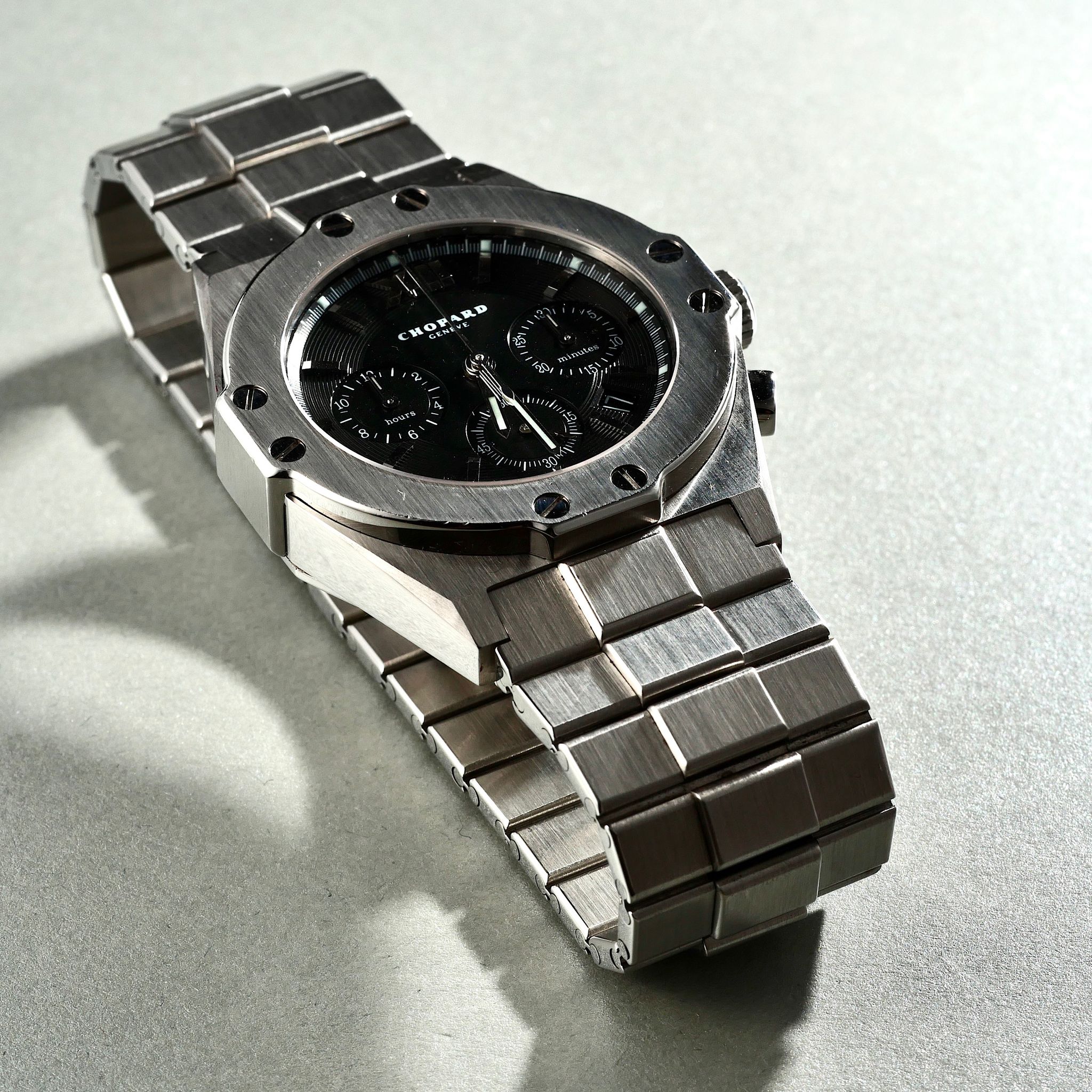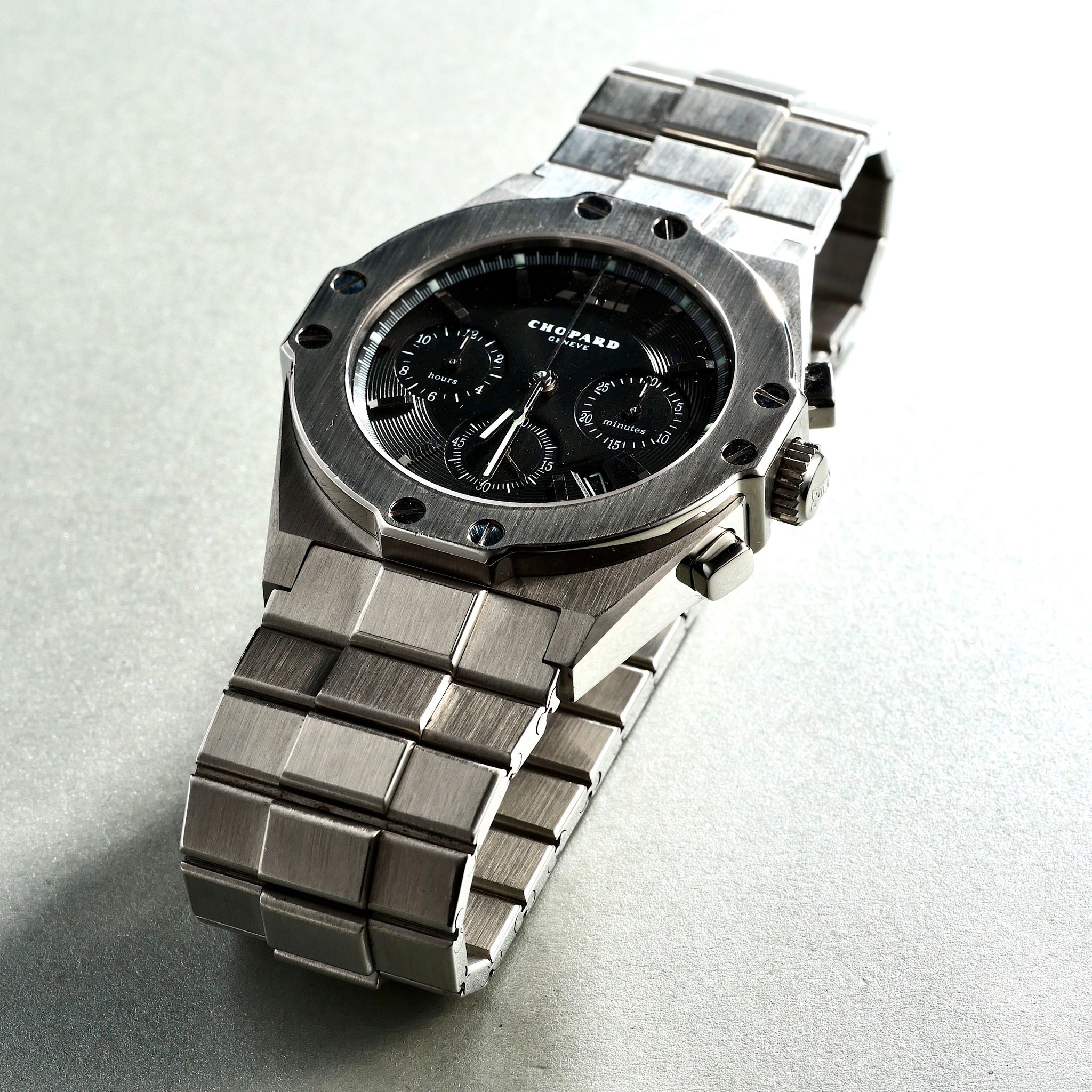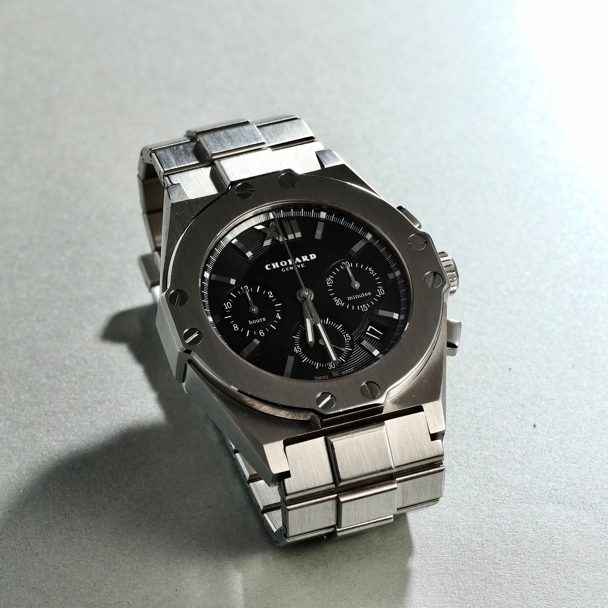 SPECIFICATIONS: Stainless Steel Case, Original Black Dial with 1st Gen Block Logo, Original Chopard Stainless Steel Bracelet, Very Rare