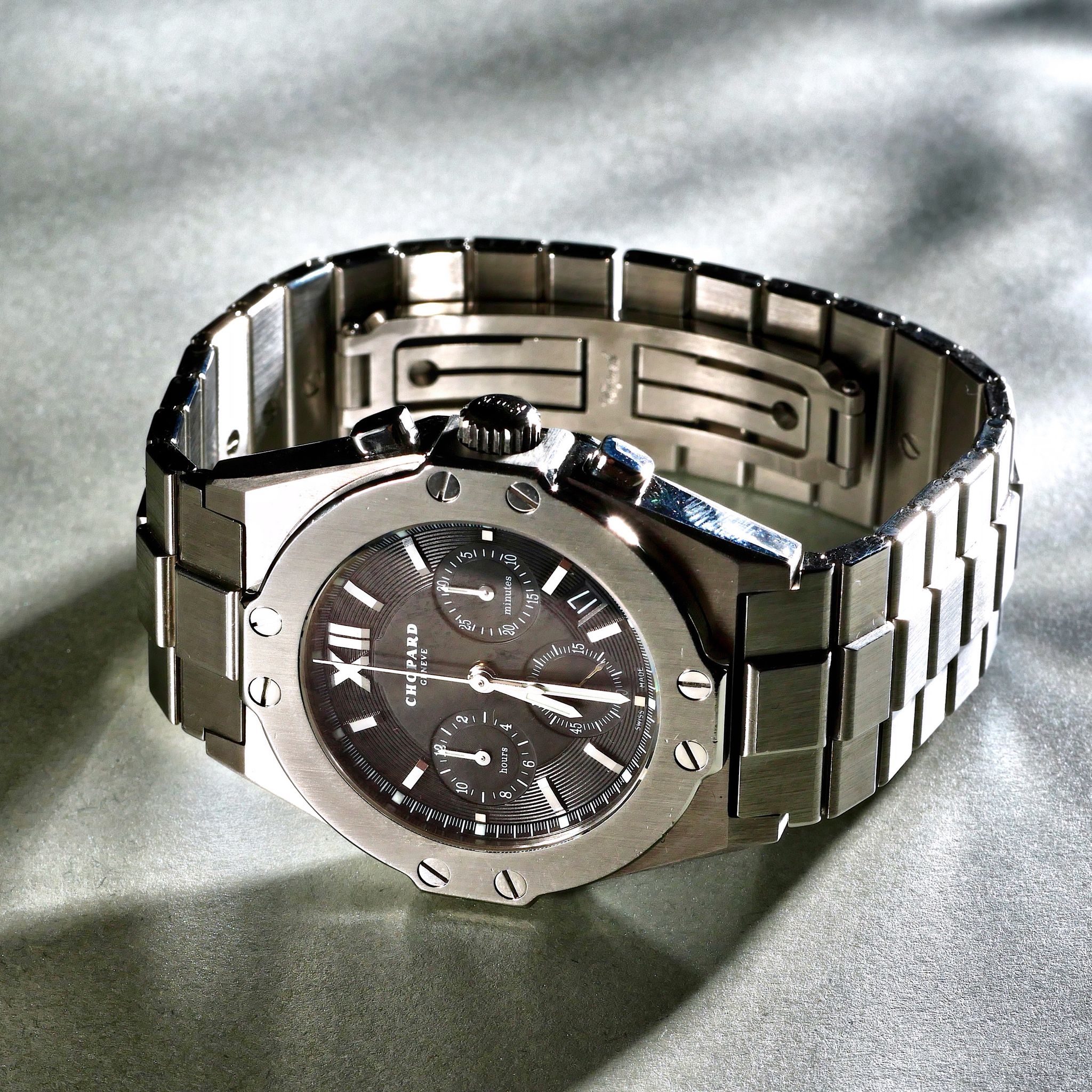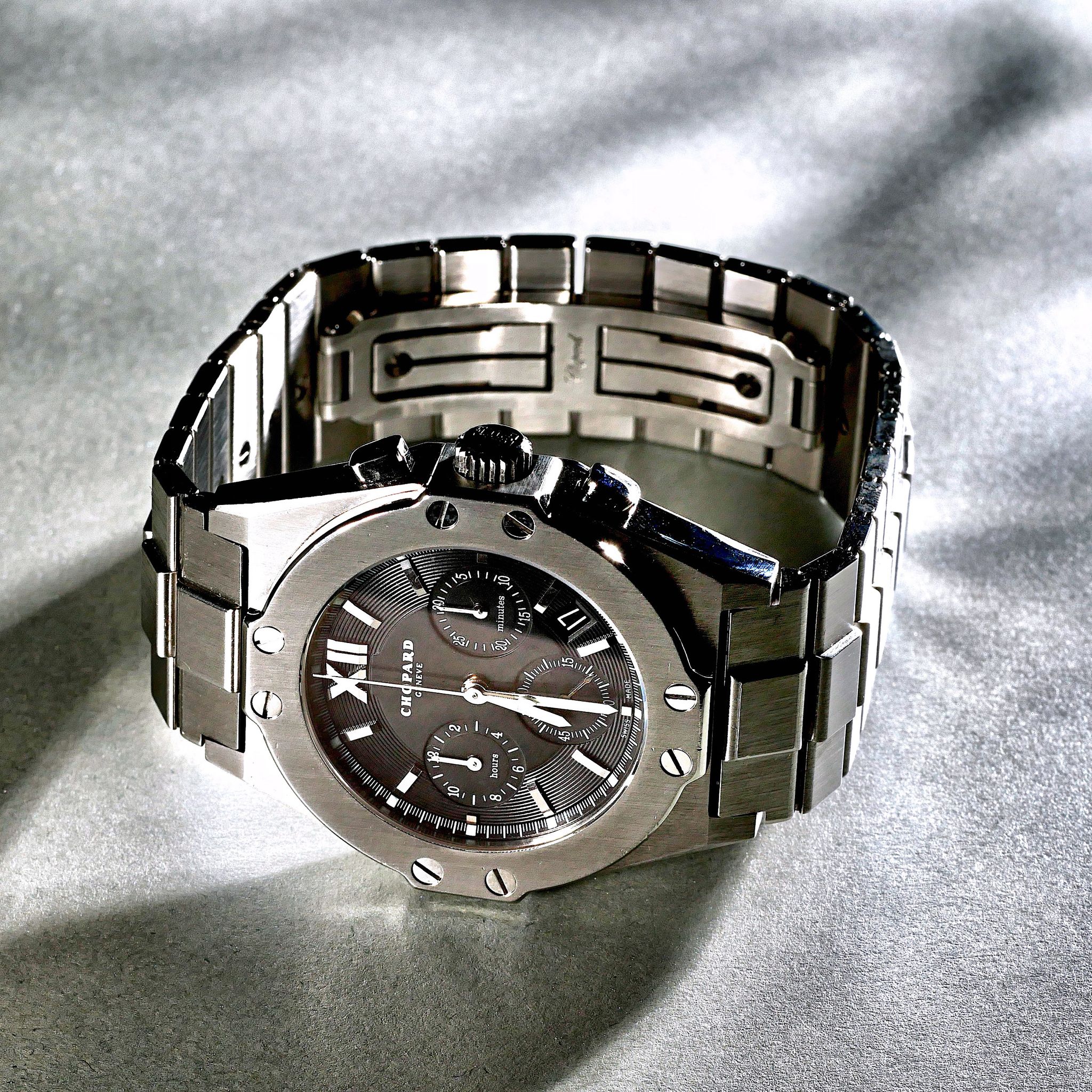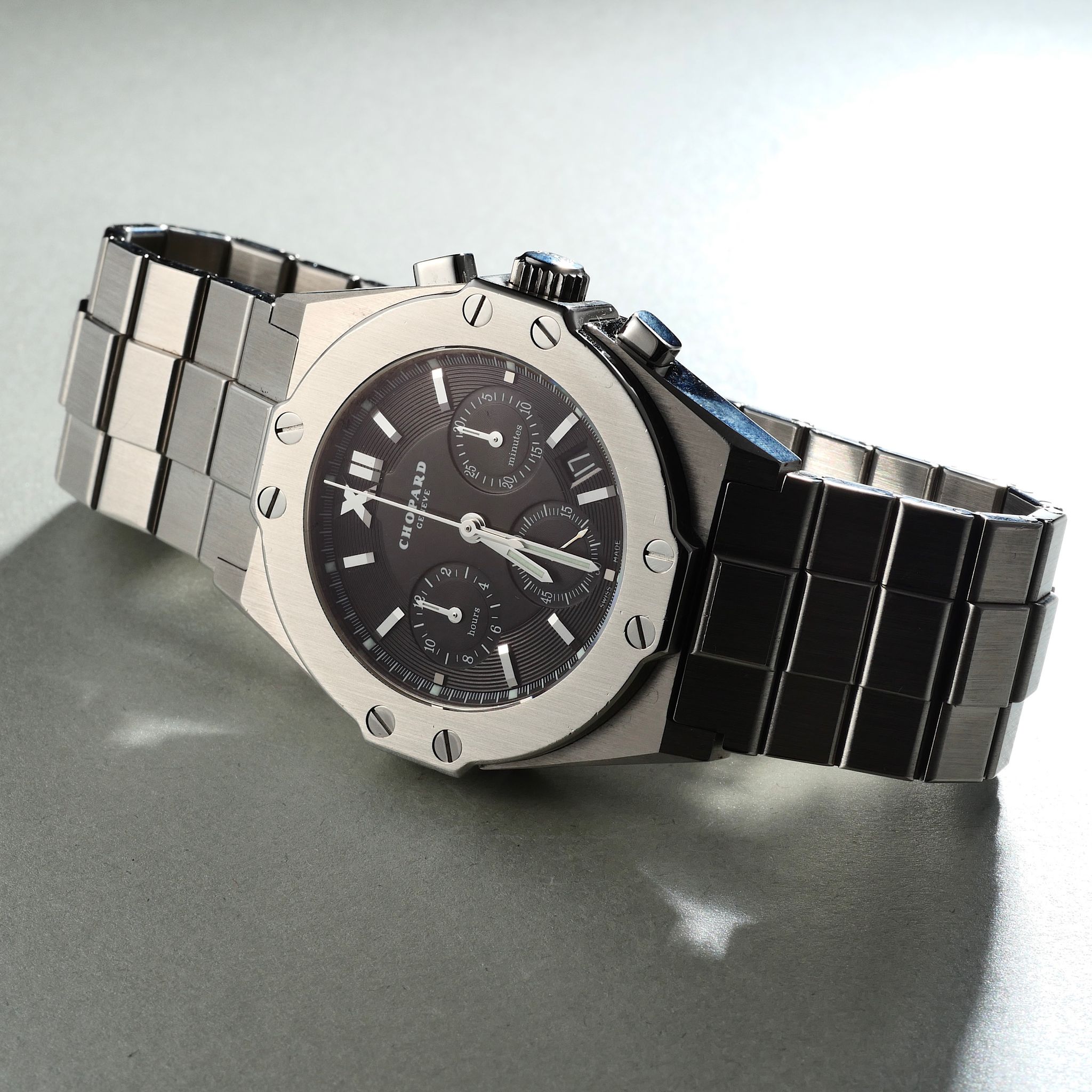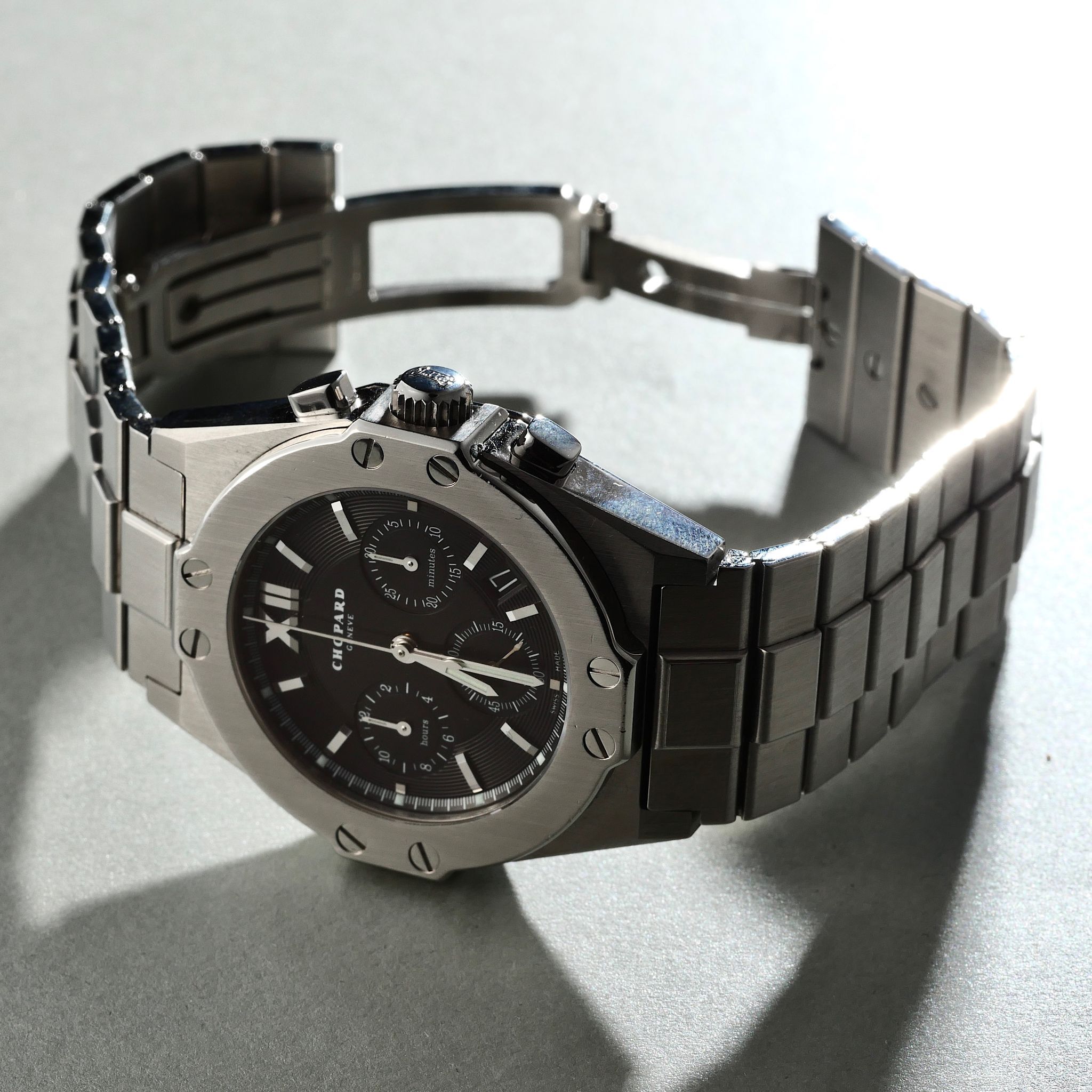SPECIFICATIONS: Stainless Steel Case, Original Black Dial with 1st Gen Block Logo, Original Chopard Stainless Steel Bracelet, Very Rare
