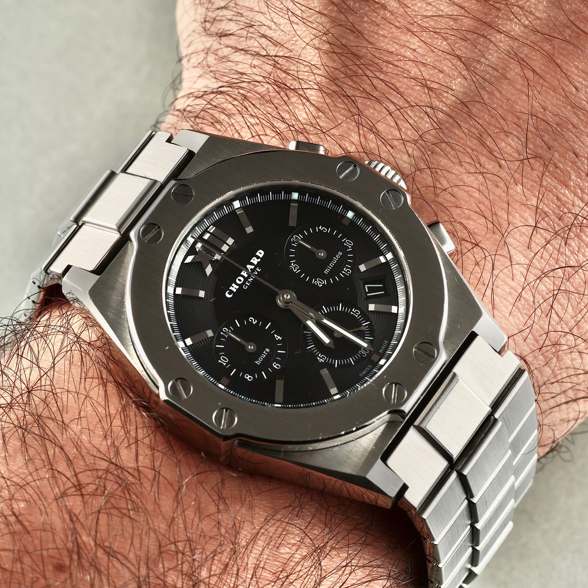 Every detail of this watch feels like a love letter to horological excellence. The black-dial variant with the old style Chopard block logo, produced in the lowest numbers, is the crown jewel of the reference. The uneven octagon case is pure rebellion, a shape that refuses to conform to the symmetry of its peers. It’s not trying to be the Royal Oak or the Nautilus; this one stands on its own.