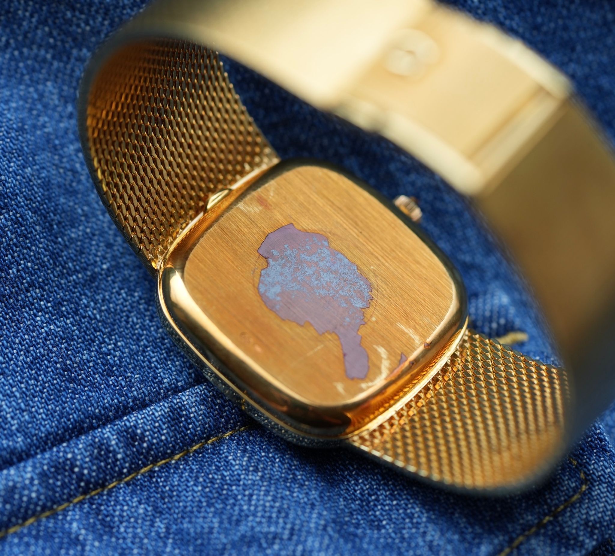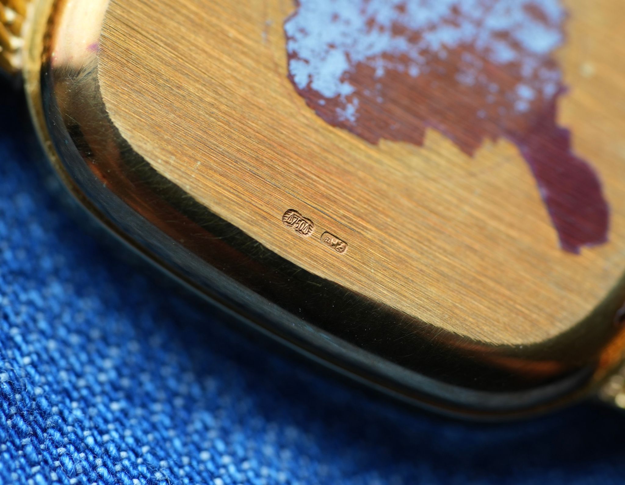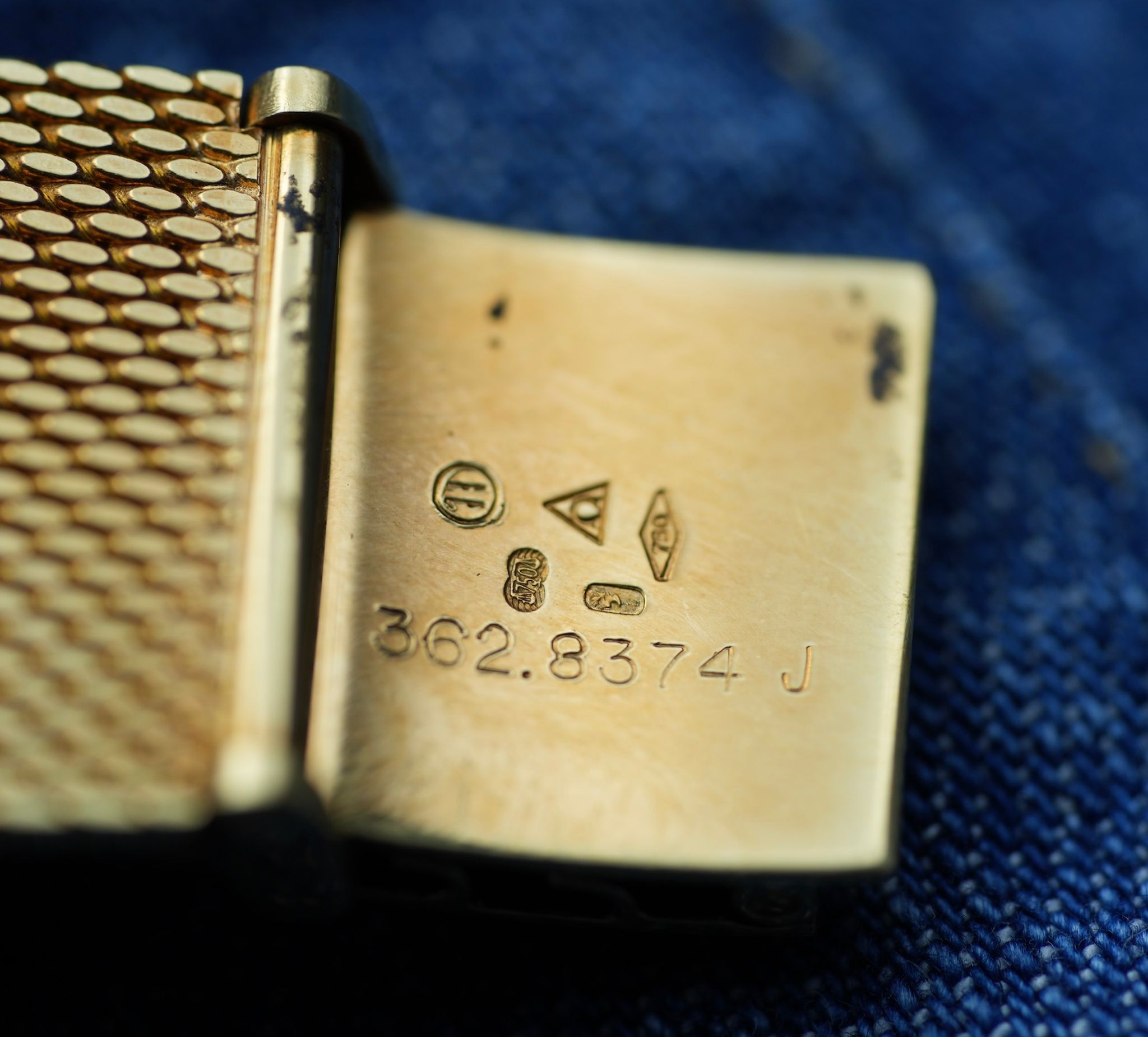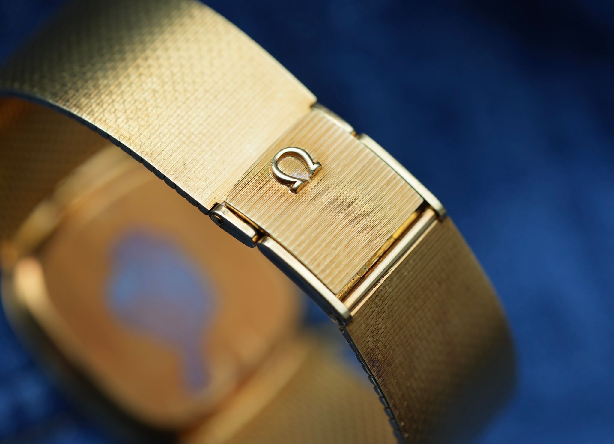 Here we have an interesting automatic Omega ref. 362.8374 J cased in solid 18k yellow gold. The star of the show here is the gorgeous oxblood stella-esque dial made special for the State of Qatar as it was likely given as a diplomatic gift. The watch is preserved in incredibly crisp condition, having seen very limited wear. There are even remnants of the original caseback sticker. The dial has some spidering, noticeable when viewed through a loupe but remains very attractive to the naked eye. The bracelet is tight and will fit up to a 7.5 inch wrist. The entire watch weighs 99.7g. The case measures 32mm in diameter but wears quite a bit larger due to the stature provided by the integrated bracelet. It’s not common to find a solid 18k watch on bracelet in this condition, with special order dial, for under 10k.