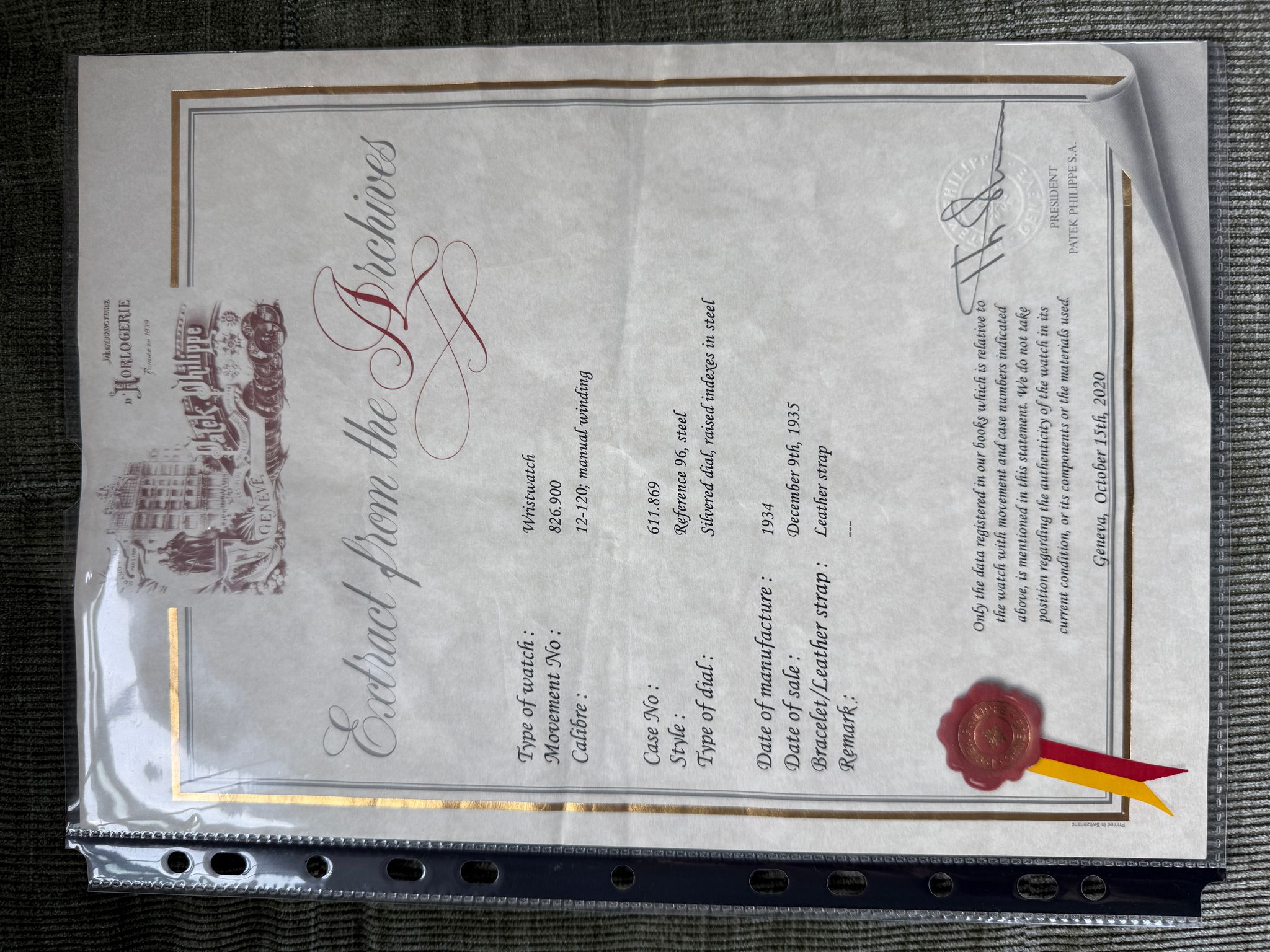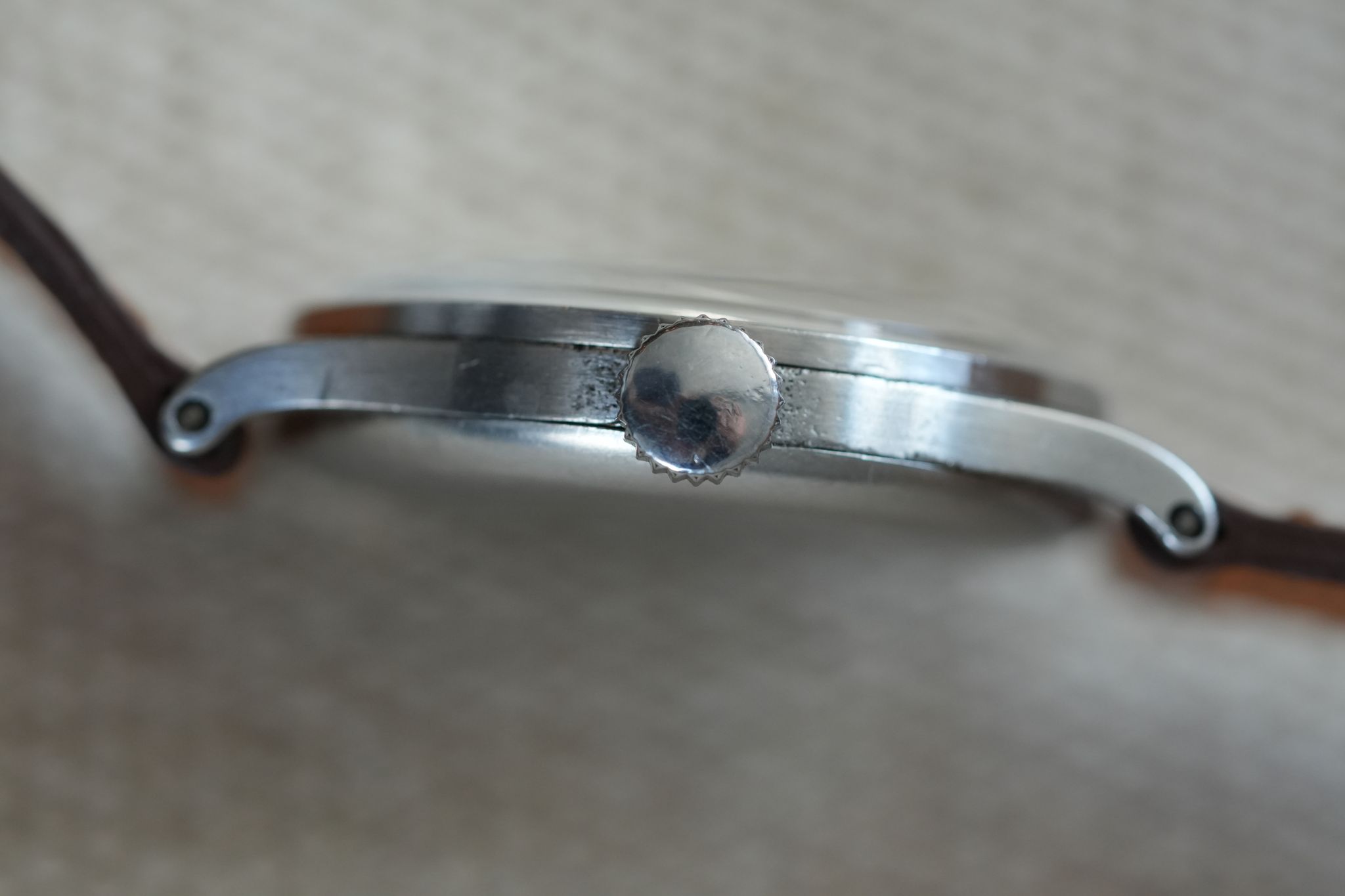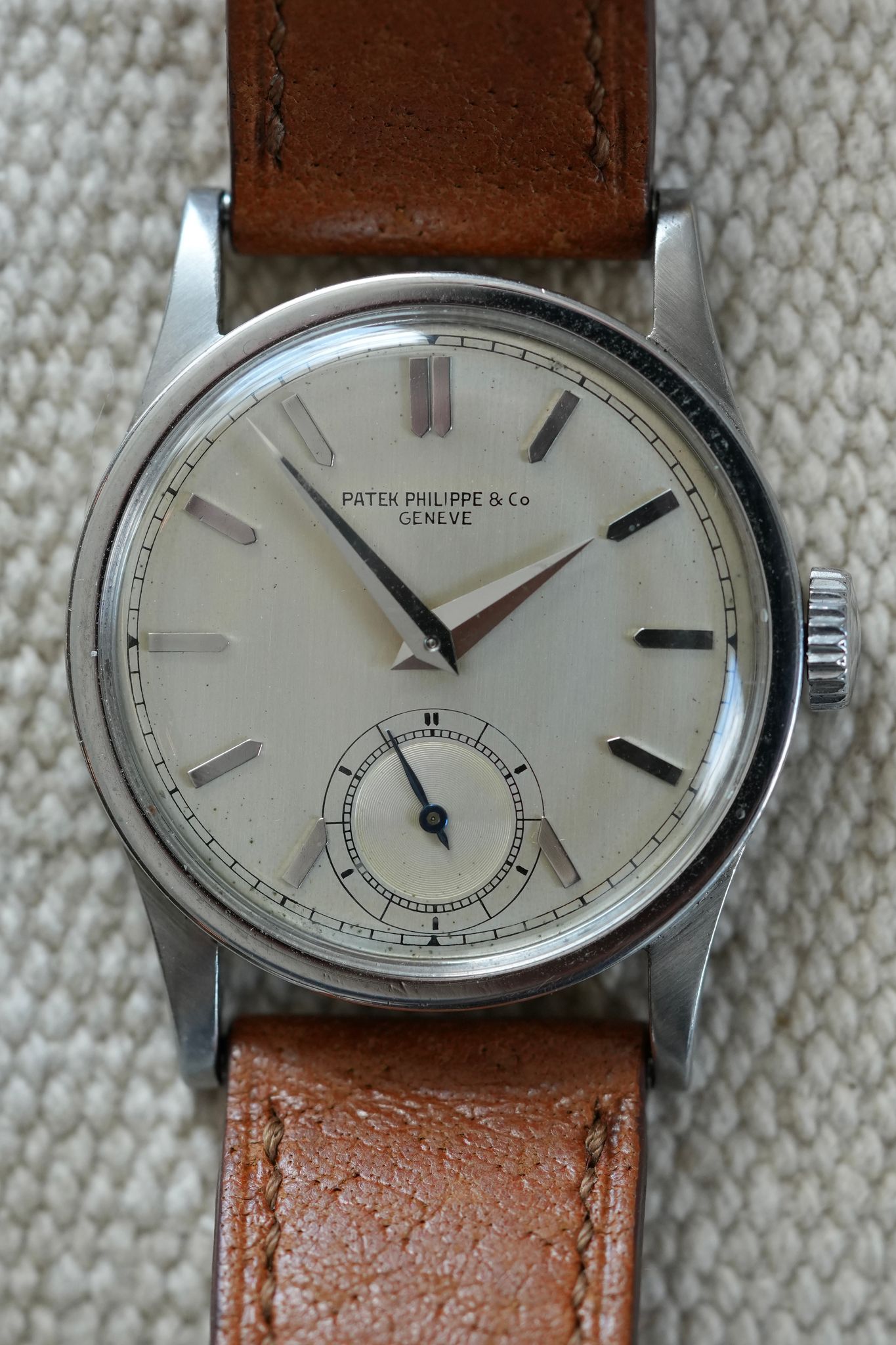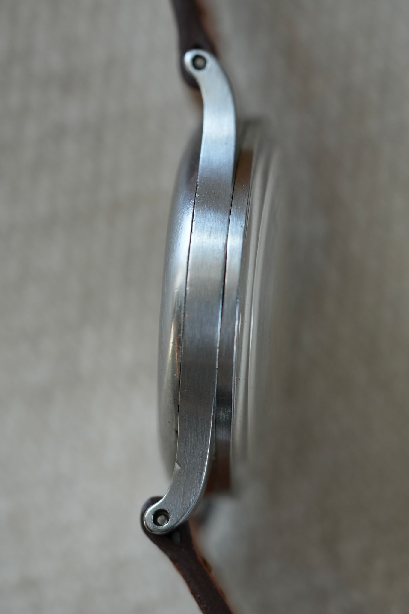 Very lovely Patek Philippe Calatrava reference 96 in steel. Very strong case for the mid-1930s with just some minor pitting. Extract from Patek confirms the watch. Non-Patek strap and buckle.