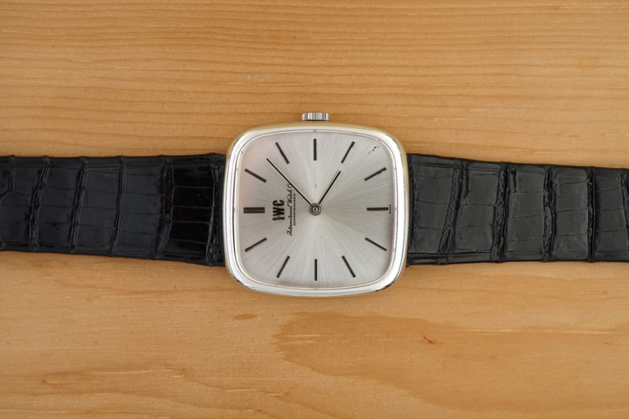 Made in 1978 according to our books and research, serviced right now and probably unpolished: Rare 18K whitegold IWC with significant wrist-presence and a beautiful and light-reactive sunburst dial with applied indexes. The dial is truly amazing in its todays appearance and was made for IWC by the legendary Stern Cadran (Patek owner-family).