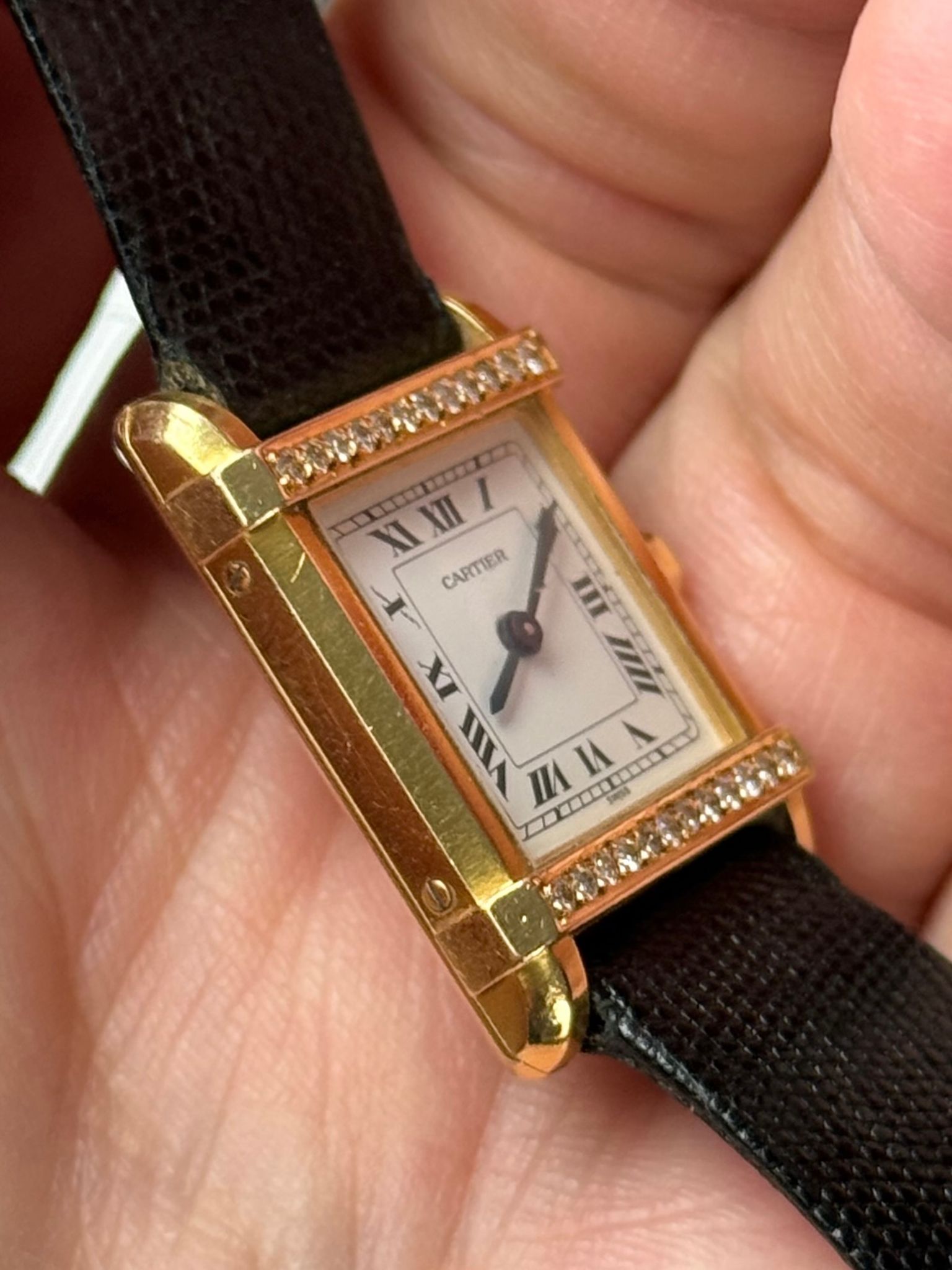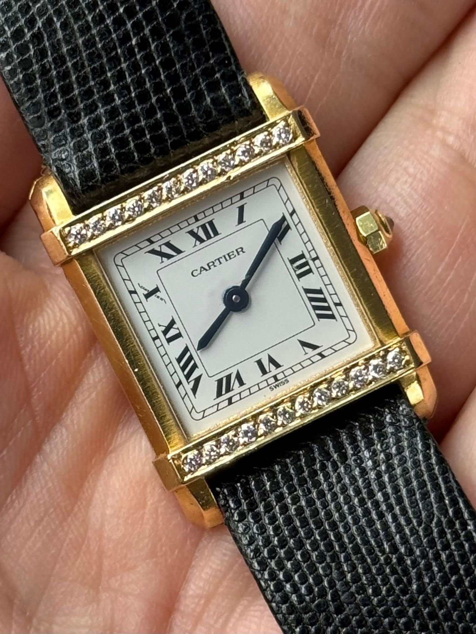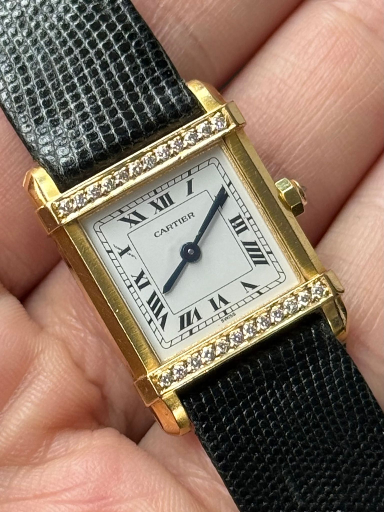 1990s Cartier Tank Chinoise with factory Cartier diamond case and crown. Nice unpolished condition with perfect dial. Authentic Cartier gold-plated tang buckle and Cartier strap. Any marks in photos are on the crystal only. Quartz movement and hidden signature at 10 o’clock.